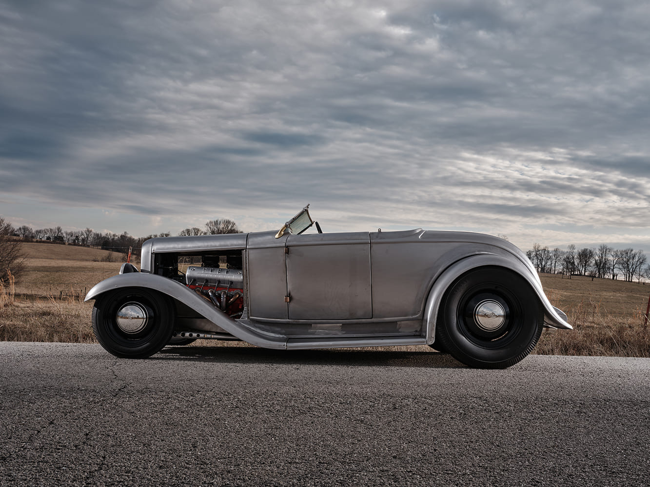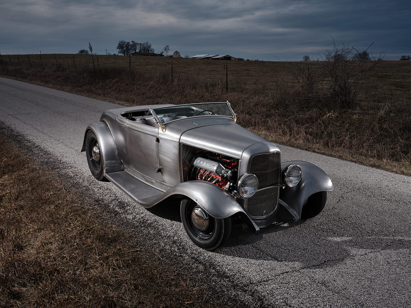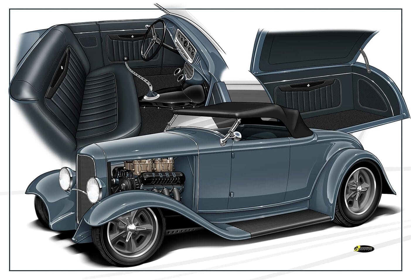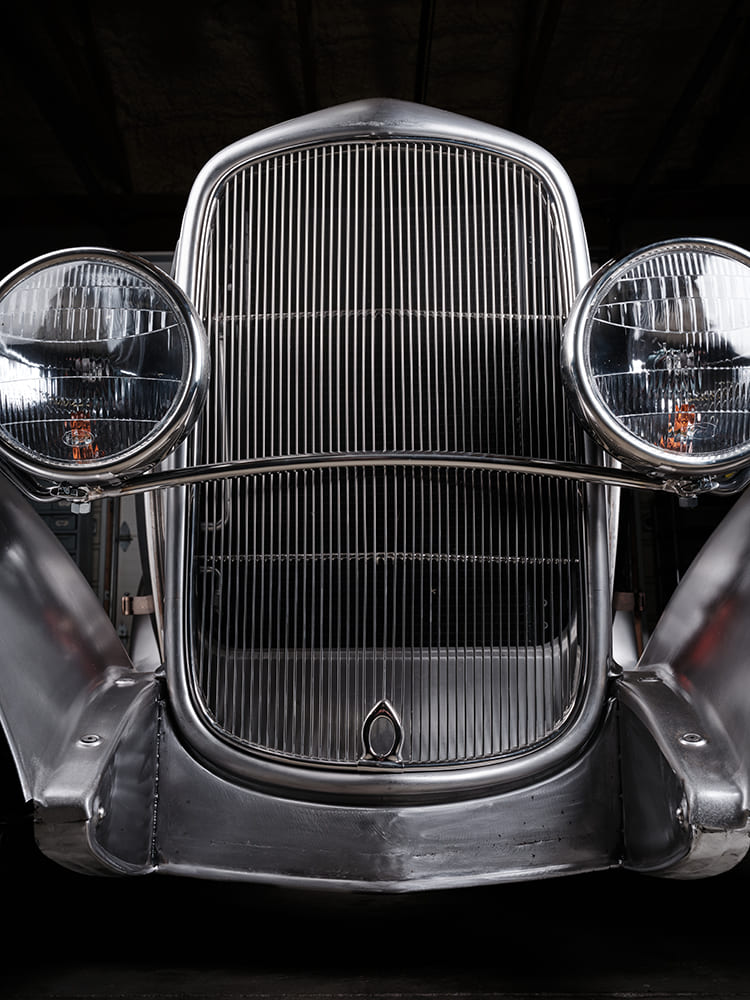 Eric Brockmeyer, a réalisé plusieurs esquisses à partir de leurs conversations, ce qui a conduit à la concrétisation du projet de carrosserie du Hot Roadster qu’il a été décidé de tout simplifier et d’acheter en Kit’32 pré-terminé et complet, chez le spécialiste “Brookville”. Il comportait les 4 ailes, les 2 marchepieds et la calandre, le tout allant quand même subir diverses modifications comprenant un “Rake” de la caisse spécifique avec rehaussement et allongement des ailes et un ajustement des marchepieds. De plus, le capot a été étiré et la calandre abaissée pour créer des lignes fluides. Un réservoir d’essence “Tanks” de 45L équipé d’un bouchon “Moon Spinner”, a été placé sous la carrosserie AR, tandis que les protections des longerons ont subi d’importantes modifications.