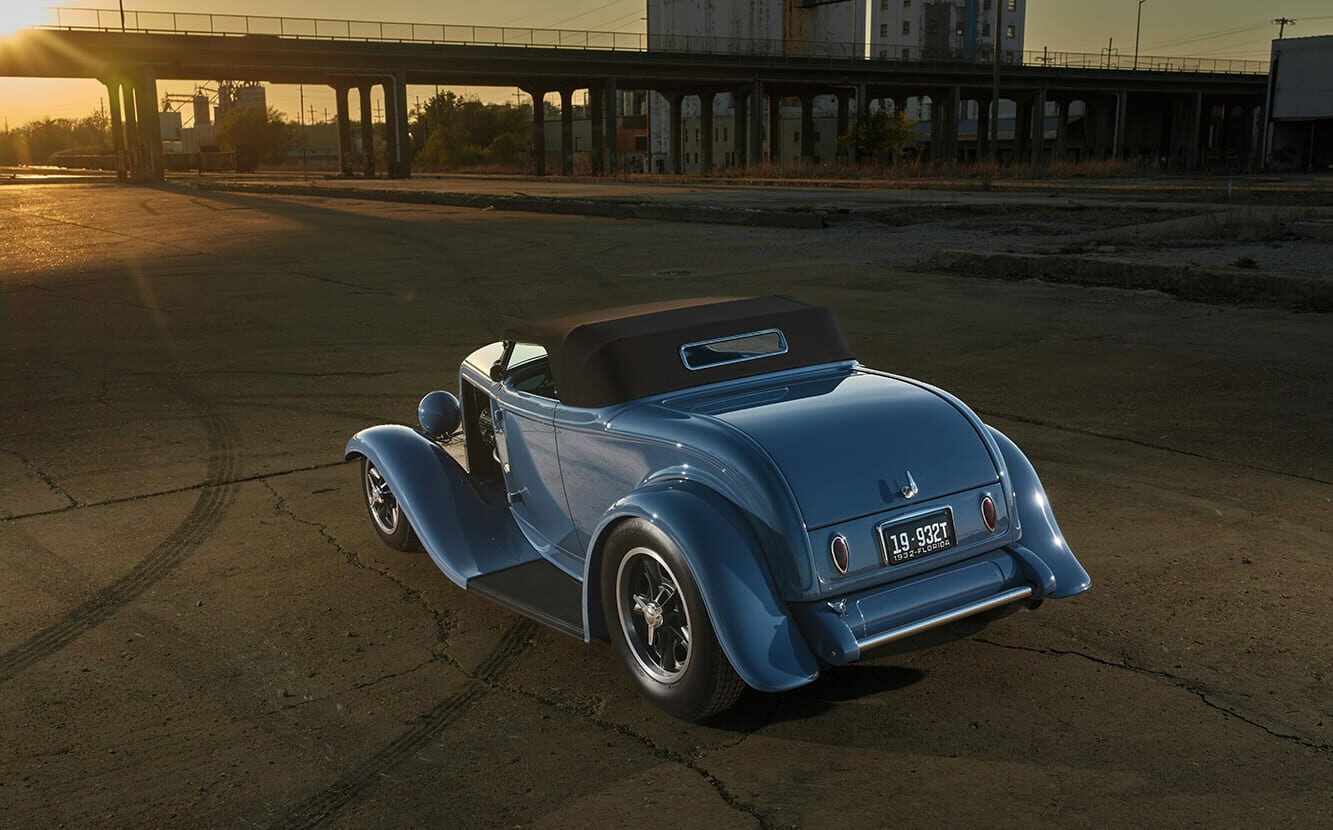 Les feux arrière Ford’39 ont été modifiés avec un rebord surélevé. La barre des phares a été abaissée permettant de placer les grandes carcasses de phares commerciaux Ford’32 et de les rapprocher vers le centre visuel. Le pare-boue avant a également été profondément modifié. Le pare-brise abaissé, incurvé et incliné à 37 degrés, est une conception de dernière minute de Stan Wanlass, réalisée par Dick Rodwell. La cause est que son design ainsi “plus décontracté” s’harmonisait mieux avec la capote amovible, fortement raccourcie, conçue par Clark et habillée par Tracy Weaver de “Recovery Room Interiors”. Tony Curry et Chance Taylor, de “Show Me Rod and Custom”, chargés de la carrosserie et de la peinture ont sélectionné un Bleu Aetna Porsche 2023.