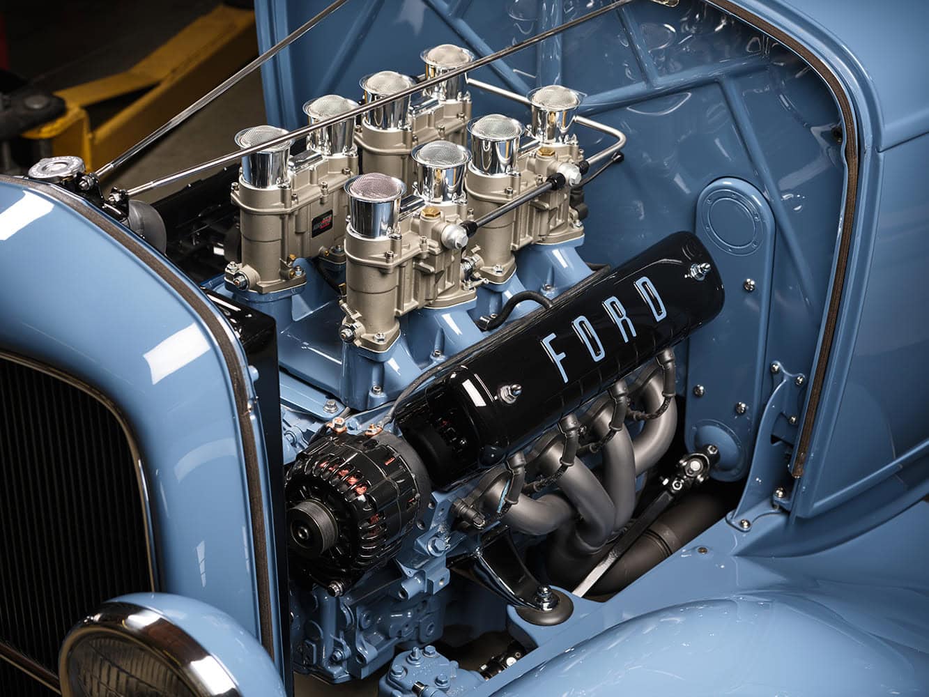 C’est un produit très couteux car composé d’une surface extérieure en acrylique à tissage carré, d’une couche intérieure en caoutchouc et d’un envers en coton. On retrouve également le travail de Tracy dans la moquette en cuir “allemand” à tissage carré bleu moyen de chez “Apex Leather”. Les détails des sièges sont complétés par une paire de ceintures de sécurité à boucle chromée de chez “Juliano”. Le moteur V8 est un LS3, équipé d’un système d’injection électronique “Borla” à 8 corps de papillon “Weber” et de filtres à air “Borla” à mailles. Les bobines d’allumage LS sont dissimulées sous des cache-culbuteurs en aluminium usiné, imitant le bloc Y Ford, fabriqués par “EVOD”. L’alimentation en carburant est assurée par une pompe “Walbro” immergée.