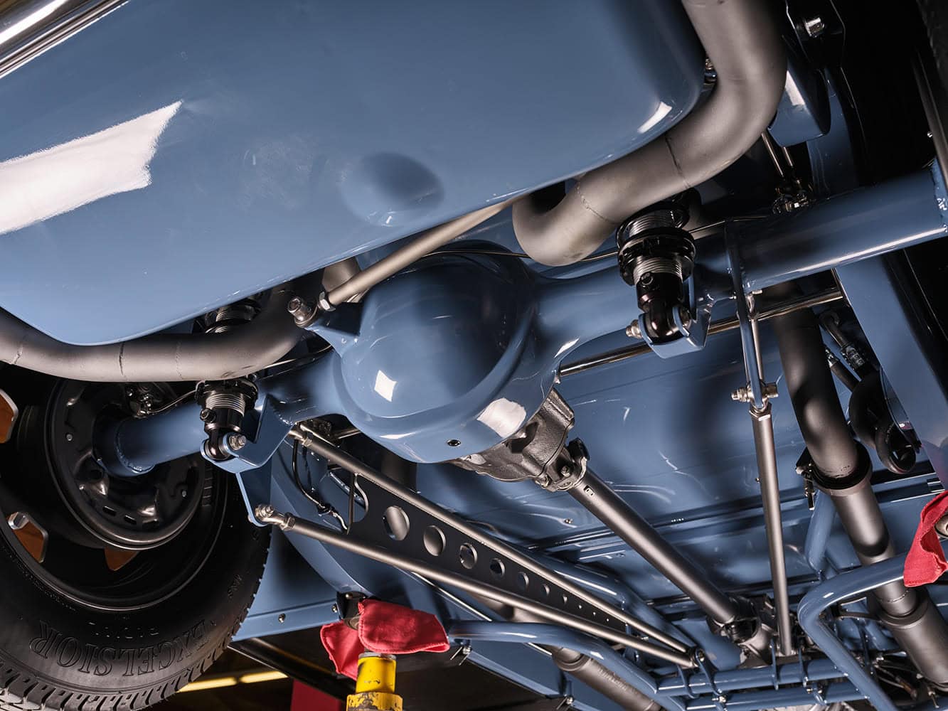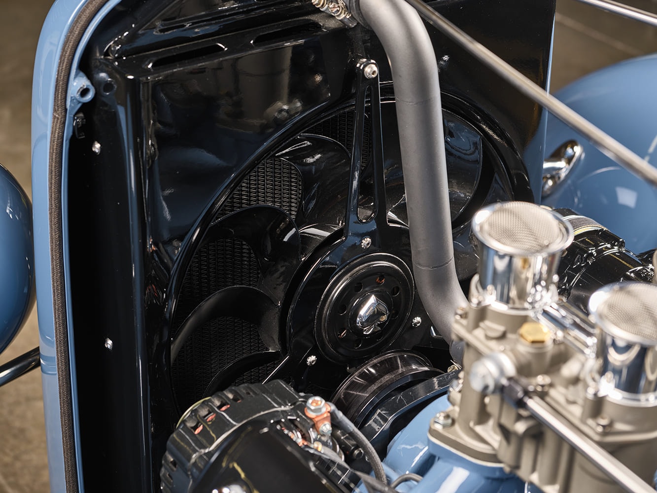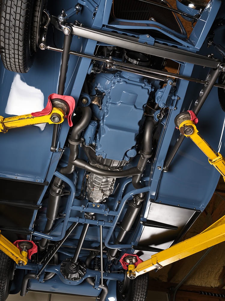 Scott souhaitait un tunnel de transmission sur mesure pour mettre en valeur le savoir-faire de Clark en métallurgie… et le résultat est à la hauteur ! Le châssis repose sur des longerons de Ford 1932 de reproduction “American Stamping”. L’empattement a été allongé de 3,8 cm (1-1/2 po) grâce au déplacement de la traverse vers l’avant. Les traverses tubulaires présentent une encoche en C à l’arrière du châssis, ainsi qu’une traverse d’essieu avant abaissée et un boîtier de direction “Pete & Jakes Vega”. Un essieu avant “Pete & Jakes Super Bell” abaissé de 10 cm (4 po) est associé à des tirants de suspension “Hole Shot” revêtus de Cerakote bleu cobalt et à des amortisseurs “Ridetech”. Le pont arrière est un Ford 9 pouces classique, rétréci par Chris.
