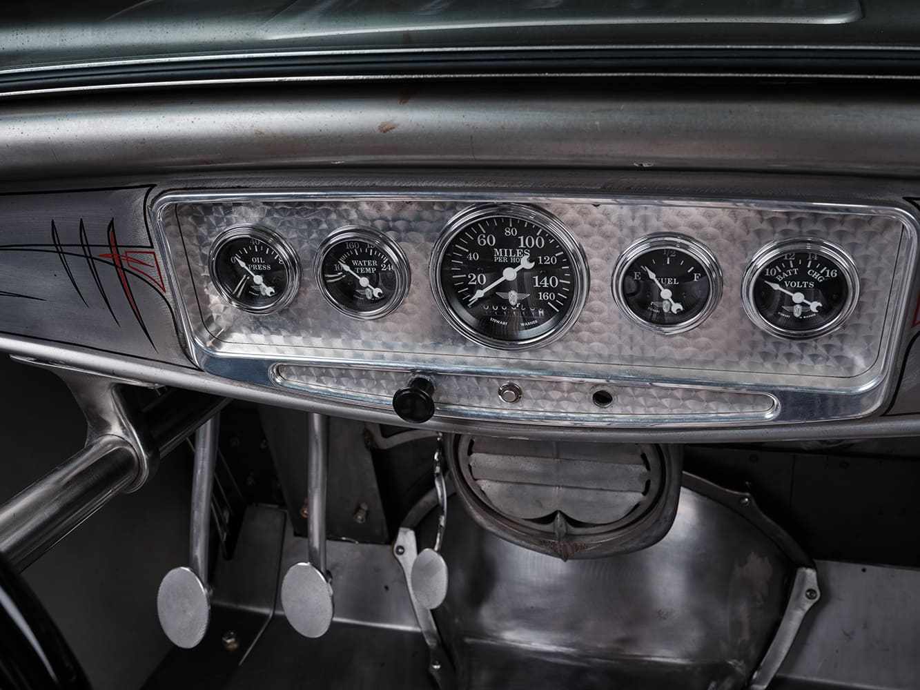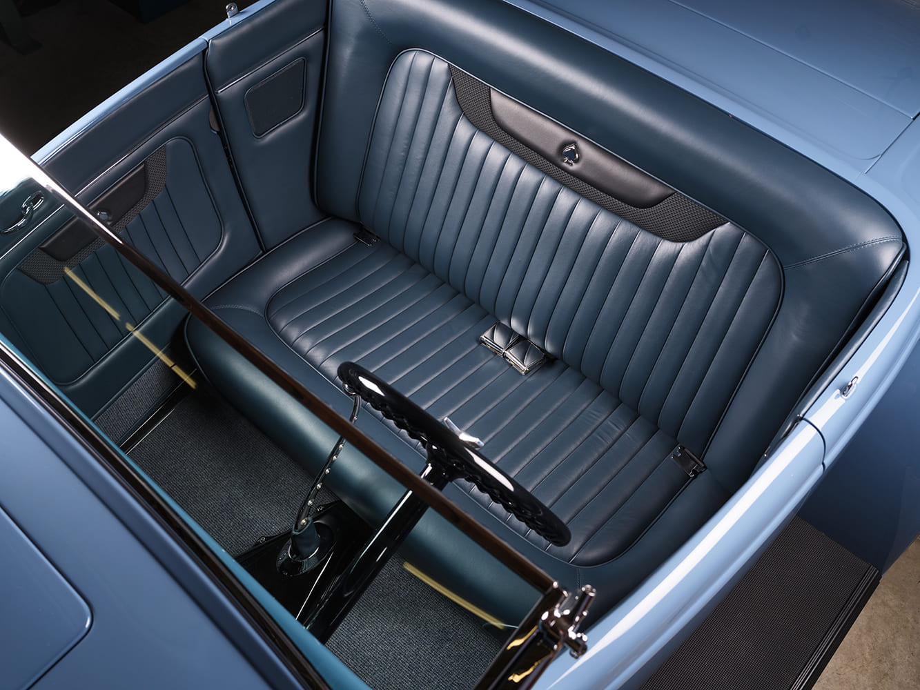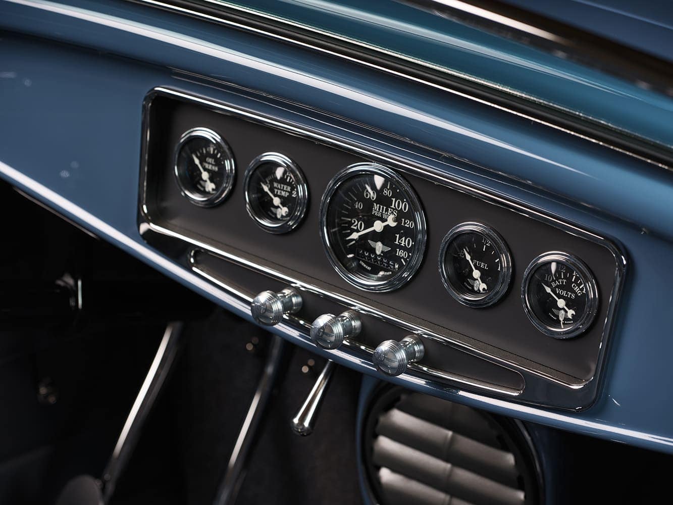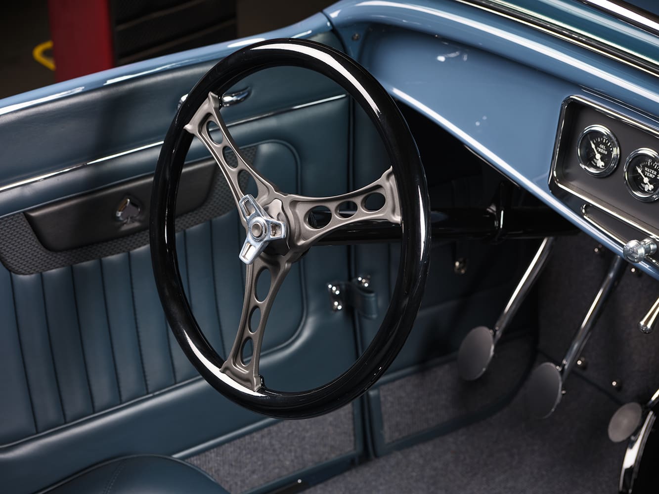 C’est une interprétation moderne d’une couleur classique de la Porsche 356… Le capot du Hot Rod est un modèle “Rootlieb” monobloc réalisé sur mesure avec un système de verrouillage dissimulé, sans les flancs “traditionnels” pour que le moteur reste visible de tous les côtés, un aménagement également fabriqué par Clark qui a de plus contribué également à des modifications de l’intérieur de la carrosserie “Brookville Roadster” dont quelques détails très caractéristiques commandés à Brookville, notamment l’ajout d’un tableau de bord de Ford 1932 “luxe” intégrant un insert “Lokar” guilloché ainsi été utilisé. Une fois terminé, le Hot Roadster arbore désormais un insert recouvert de “Cerakote Cobalt” et un ensemble de cinq cadrans “Stewart-Warner-Wings”.