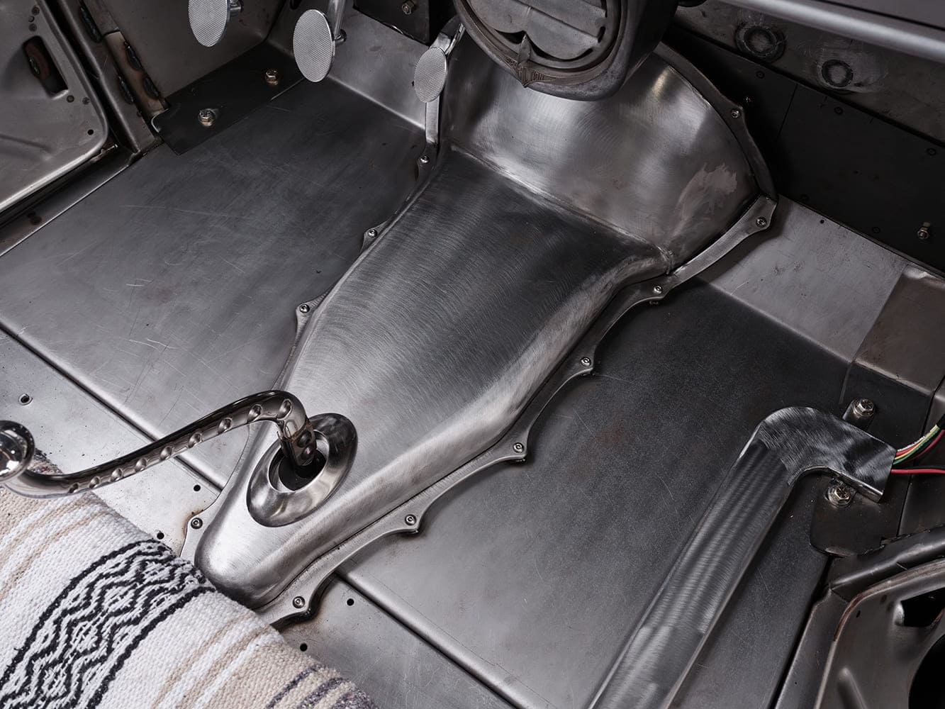 Parmi les autres pièces du moteur, on trouve une pompe à eau en aluminium poli et un système de courroie serpentine LS de chez “Drive Junky”, un carter d’huile rétro pour conversion “Holley LS” et un radiateur “Johnson Radiator”. Le carénage du ventilateur, réalisé sur mesure par Clark, est doté d’une partie supérieure à persiennes, d’un tuyau de trop-plein dissimulé et d’un ventilateur électrique “Cooling Components”. Pour transmettre la puissance aux roues arrière, le V8 est associé à une boîte de vitesses manuelle “TREMEC TKX” à cinq rapports préparée par “Bowler Transmissions”, avec un levier de vitesses “Johnson’s Rod Shop”, ainsi qu’un volant moteur, un plateau de pression et un embrayage “Ram”. À noter que le tunnel de transmission est en métal apparent.