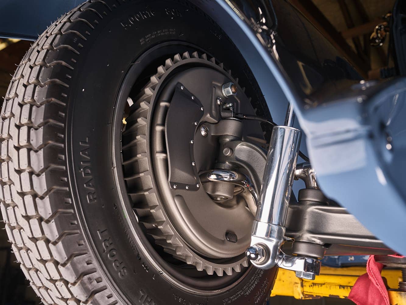 La gestion moteur utilise un calculateur “Holley Terminator X” et des câbles d’allumage gainés de tissu, réalisés sur mesure par Clark. Détail intéressant : l’alimentation provient d’une batterie au plomb-acide traditionnelle qui alimente le démarreur et l’alternateur “Powermaster”, revêtus d’une peinture époxy noire. Le système d’échappement comprend des collecteurs d’échappement “Stainless Works” à profil bas, revêtus de Cerakote bleu cobalt, avec des tubes de 41 mm (1-5/8 po) alimentant des tubes en acier inoxydable de 63,5 mm (2-1/2 pouces) également revêtus de Cerakote bleu cobalt, fabriqués par Clark. Ces collecteurs sont reliés à des silencieux “Flowmaster Flow FX”, eux aussi revêtus de Cerakote bleu cobalt.