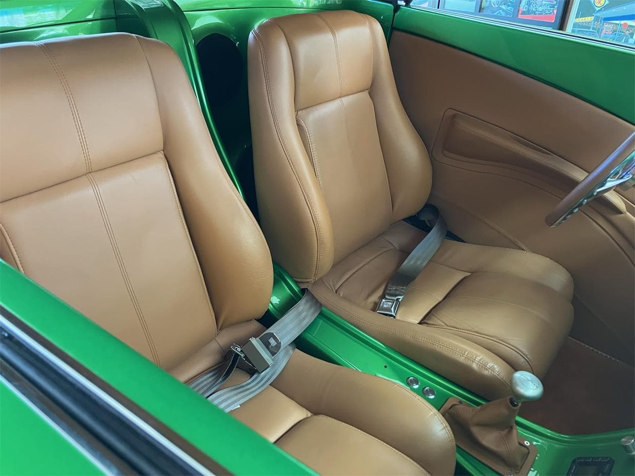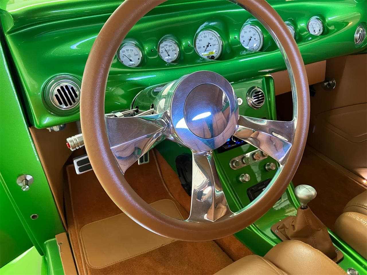 Une console centrale couleur carrosserie s’étend du tableau de bord à la paroi arrière et comprend une prise 12 V, les commandes de lève-vitres électriques et un levier de vitesses Lokar avec soufflet beige. Sur la console centrale, à l’endroit où elle rejoint le tableau de bord, se trouvent les commandes de la suspension Ride-Tech, des phares et des essuie-glaces à deux vitesses, et les commandes de la climatisation Vintage Air (climatisation et chauffage performants). J’allais oublier l’autoradio Sony compatible Sirius, iPod, USB et Pandora, ainsi qu’un bouton de démarrage. De part et d’autre de cette console se trouvent des haut-parleurs pour la chaîne stéréo Sony. Derrière les sièges, d’autres haut-parleurs PB (PowerBass) sont intégrés sur mesure dans la fibre de verre. Inutile de préciser que le système audio offre un son absolument fantastique, quel que soit le morceau écouté. Le tableau de bord, lui aussi en fibre de verre verte, est équipé d’un ensemble complet de cadrans Autometer, dont un compte-tours.