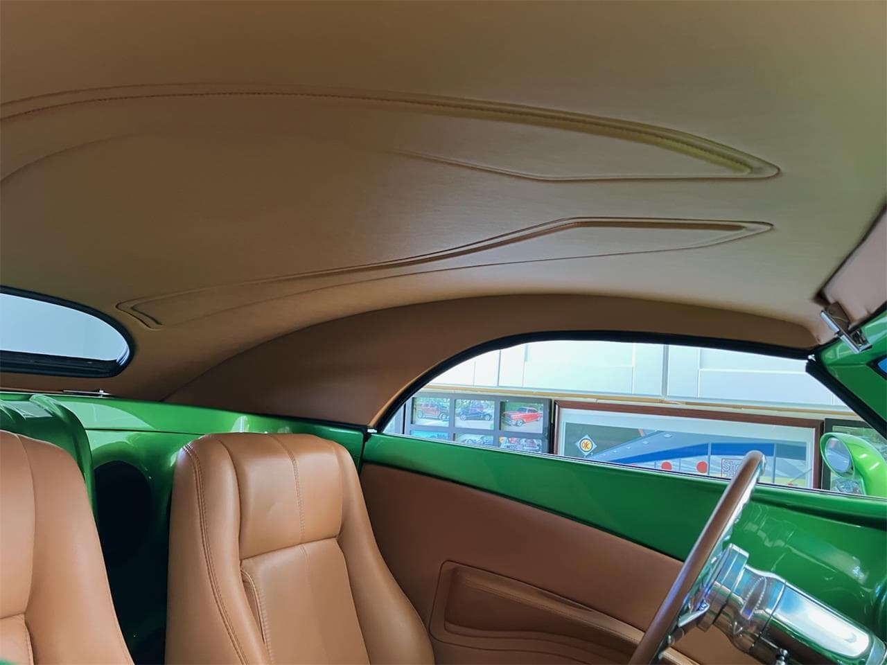 Un coup d’œil sous la voiture révèle des bras de suspension avant Heidt, une suspension à 4 bras sur mesure, un essieu arrière de 9 pouces et un soubassement si propre que vous aurez envie d’y placer un miroir lors des expositions automobiles pour le mettre en valeur. Il est maintenant temps de monter à bord. Pour cela, vous aurez besoin de la télécommande à 4 boutons (deux sont fournies avec la voiture). Cette télécommande permet d’ouvrir la porte conducteur (1), la porte passager (2), d’allumer ou d’éteindre tous les équipements électriques (3) et de baisser la vitre conducteur (4). Appuyez sur un bouton et la porte conducteur s’ouvre, dévoilant un magnifique intérieur personnalisé vert et beige. Des LED intégrées au seuil de porte vous accueillent et vous invitent à prendre place confortablement. Les panneaux de porte, le ciel de toit et les sièges baquets sont recouverts d’UltraLeather beige d’une douceur exceptionnelle : un similicuir haut de gamme à la surface en polyuréthane imitant le cuir de veau.