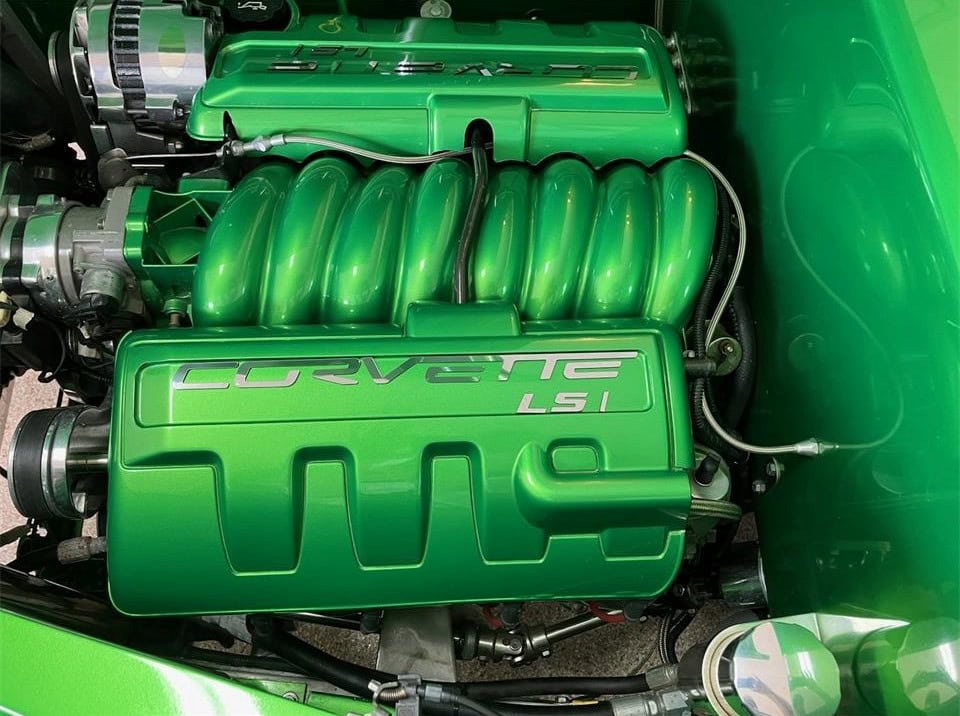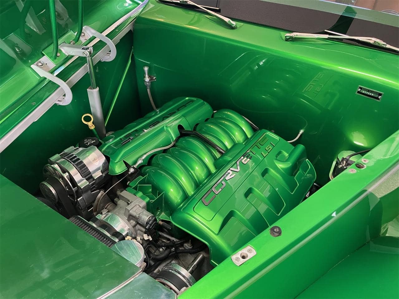 Le support de plaque d’immatriculation se relève. Les bornes de batterie déportées sont facilement accessibles, facilitant grandement le démarrage d’urgence en cas de besoin. Le capot à ouverture électrique, côté conducteur (via un interrupteur sous le tableau de bord), dévoile un compartiment moteur impressionnant. Au centre, un puissant moteur Chevy LS1 de 5L7 développant 350cv est associé à une transmission automatique 4L60E à 4 rapports avec surmultiplication. Cette combinaison est plus que suffisante pour faire de la conduite de ce HotRoadster une expérience exaltante ! Les caches moteur et l’admission couleur carrosserie lui confèrent une allure harmonieuse. Parmi les autres atouts, je cite la climatisation Vintage Air, la direction assistée, le freinage assisté, le capot et le coffre électriques, ainsi qu’un radiateur en aluminium avec ventilateur électrique et vase d’expansion poli. L’échappement, via des collecteurs et des silencieux Flowmaster, produit une sonorité rauque qui ne manquera pas de séduire.
