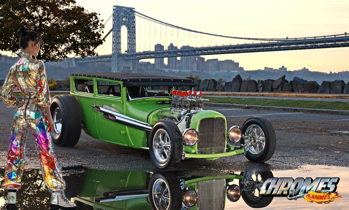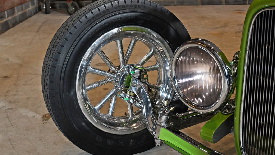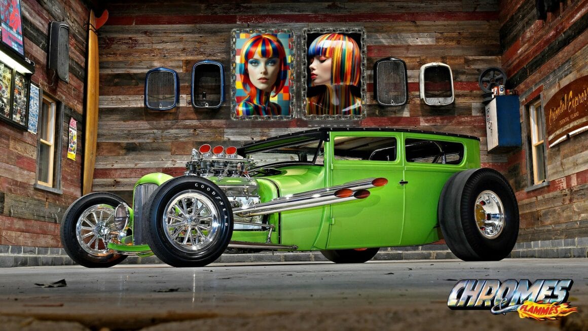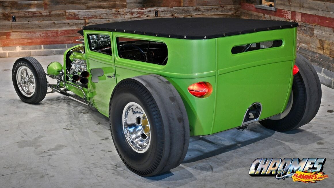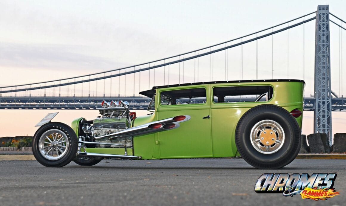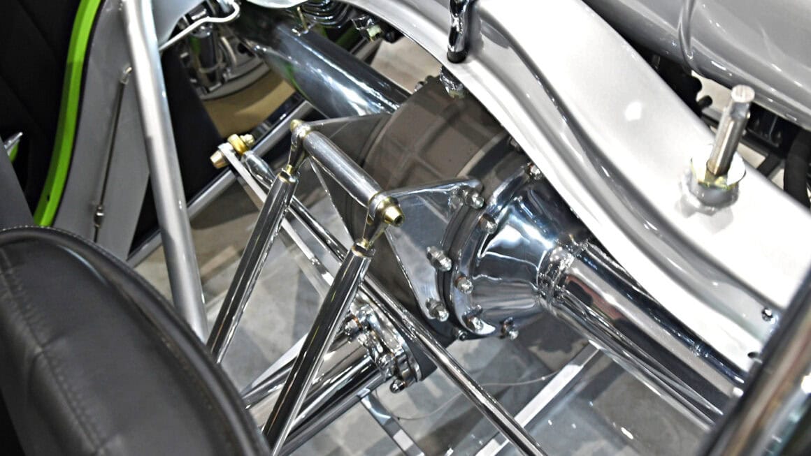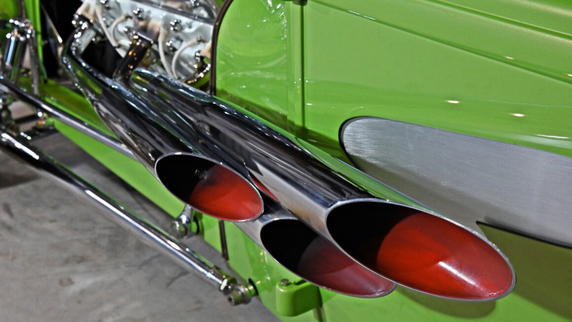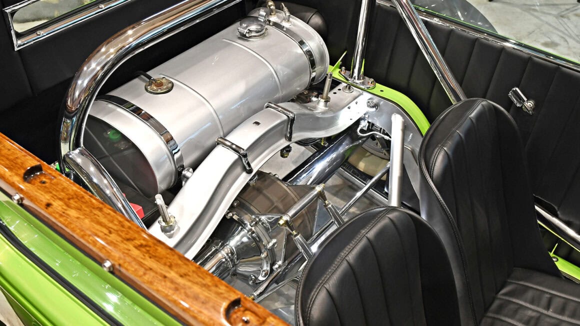 Assembler le châssis selon les besoins de Randy a nécessité un travail d’ingénierie considérable. “Le châssis a été rétréci à l’avant, élargi au milieu et rétréci à l’arrière. Puis, il a été incliné de plus de 30 cm pour obtenir l’allure que je souhaitais” explique-t-il. L’essieu avant provient d’une Ford de 1932. Randy a pris son temps pour le travailler, le ponçant et le polissant jusqu’à obtenir le résultat désiré. La boîte de vitesses provient d’une Cadillac LaSalle, et un pont arrière Halibrand 301 à changement rapide transmet la puissance à l’arrière ou se découvre une suspension sur mesure composée d’un ressort Ford T et de supports fabriqués. Quoique c’est artisanal, le tout assure une tenue de route impeccable. De gros freins à tambour de Lincoln ont été installés pour freiner ce bolide surpuissant. Bien que la transmission soit relativement simple, on voit que la carrosserie a fait l’objet d’une restauration complète : “On a commencé par couper le toit en deux et on a continué à partir de là. Chaque panneau, chaque centimètre carré de cette voiture a subi une modification. C’est un travail colossal”… m’a expliqué Randy. Les collecteurs d’échappement ont surtout représenté un défi de taille en raison de la faible hauteur de caisse de la voiture. Il fallait les fixer le long des flancs de la carrosserie, ce qui s’annonçait délicat. Pour les intégrer, Randy a conçu un panneau de porte intérieur encastré et rétractable, permettant au collecteur de passer à travers la tôle extérieure de la porte lors de son ouverture. Il a fabriqué ces collecteurs à partir de carters d’arbre de transmission intérieurs de Ford 1936, coniques aux deux extrémités et soudés à des brides sur mesure. Randy savait qu’il devait affirmer son style avec une couleur extérieure audacieuse pour sublimer le design novateur de sa Model T. “Je voulais une teinte saisissante. Il fallait que ce soit un véritable régal pour les yeux, quelque chose qui attire immédiatement le regard. Je suis donc allé chez un concessionnaire Lamborghini et j’ai choisi cette peinture, appelée Verde Ithaca”…