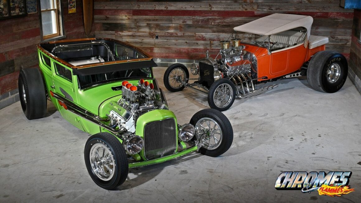 “Sunkist Model T” reçut ensuite une avalanche d’articles et de récompenses. Plus tard, Randy finit par vendre Sunkist, ainsi que sa précieuse Corvette de 1967 (427ci/435cv)… C’était pour acheter une maison… “La famille passe avant tout, et je me suis dit que je pourrais toujours construire autre chose le moment venu”… Heureusement pour Randy, “Sunkist Model T” est resté dans la région, et son fils Randy Jr. a fini par le racheter en 2014, gardant ainsi le bolide dans la famille, là où il avait sa place. Désireux de construire une autre voiture visuellement saisissante, Randy a puisé son inspiration dans son passé, combinant ses goûts personnels, parfois excentriques, pour lancer le projet : “Je construis des Hot Rod’s depuis longtemps, un peu à l’instinct. J’ai toujours eu un style un peu caricatural”... Il voulait construire un autre Model T déjanté. C’est son fils, Randy, qui l’a vraiment poussé à se lancer. À cela s’ajoutait le défi de construire ce Hot Rod avec un budget serré et des pièces de récupération. Randy a commencé avec une carrosserie de berline Model T de 1927 dont personne ne voulait plus : “Elle était en piteux état en vert Ford et était vendue avec quelques pièces détachées. J’ai liquidé toutes les pièces d’origine de carrosserie, car je n’en avais pas besoin pour ce projet. Au final, j’ai récupéré la carrosserie gratuitement après avoir tout vendu”… Je traduis par : “J’ai même récupéré ma mise”… Ensuite, il a acheté un châssis de Ford de 1932 et un moteur Oldsmobile. Ces éléments, combinés à la carrosserie récupérée, ont constitué la base de son projet : “J’ai toujours adoré les moteurs Olds”, m’a-t-il confié. Le V8 Olds de 5,3 litres (324 ci) de 1956 a été préparé avec une multitude de pièces performantes d’époque, dont un arbre à cames Eagle sur mesure, une rare admission Weiand à haut débit et un allumage Flamethrower…. Arghhhhhh, mais aussi de six carburateurs double corps de type Ford 94. Le spécialiste local Tony Feil s’est chargé du moteur, le portant à 400 chevaux.