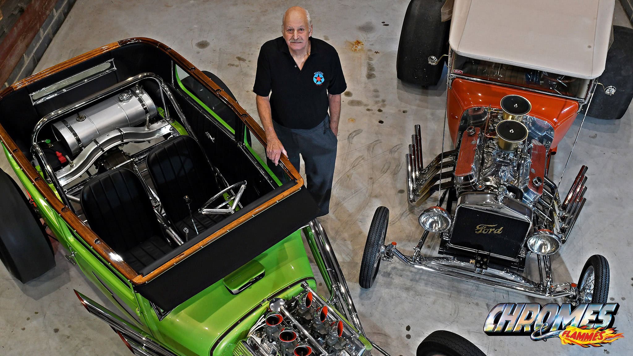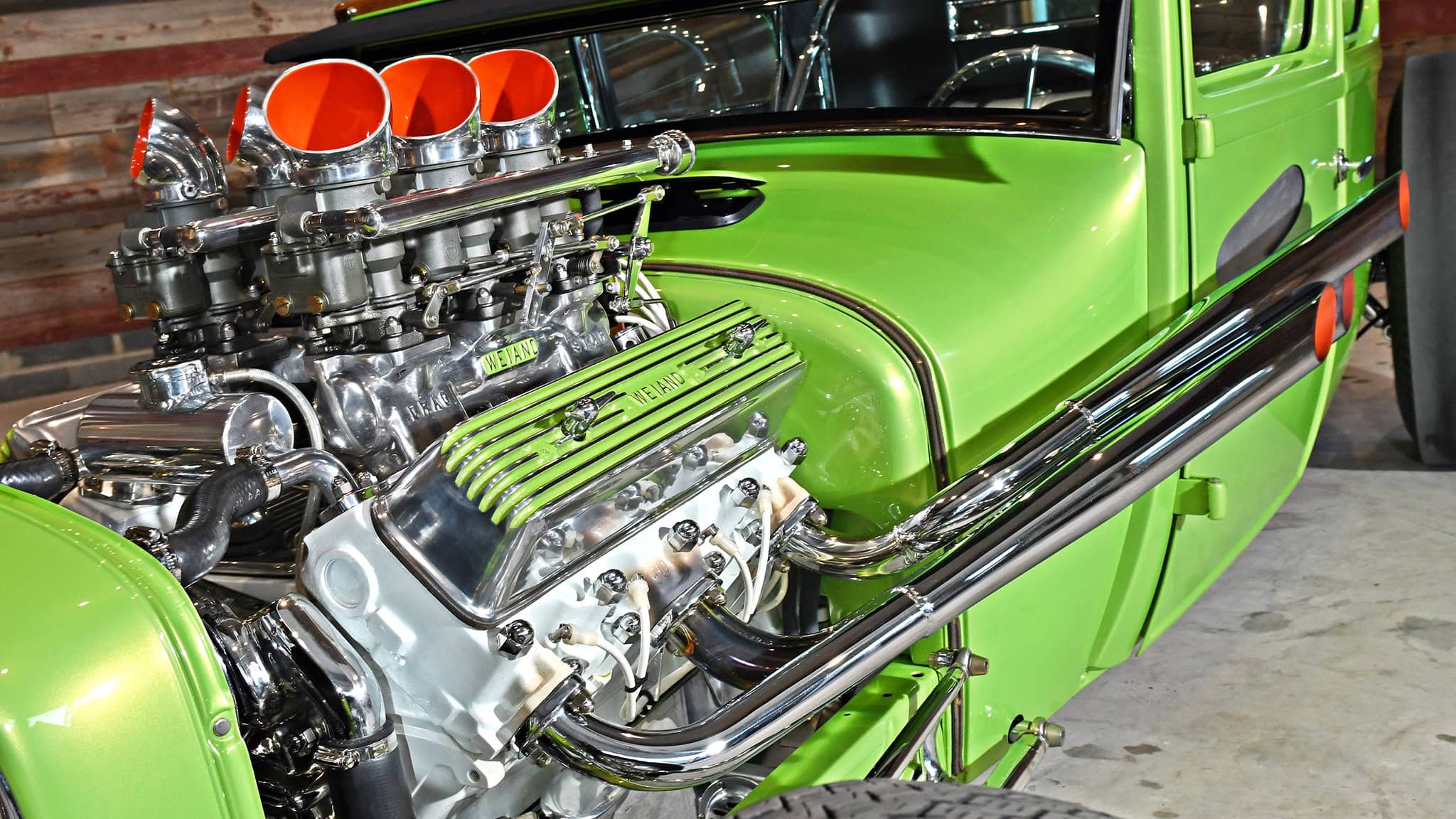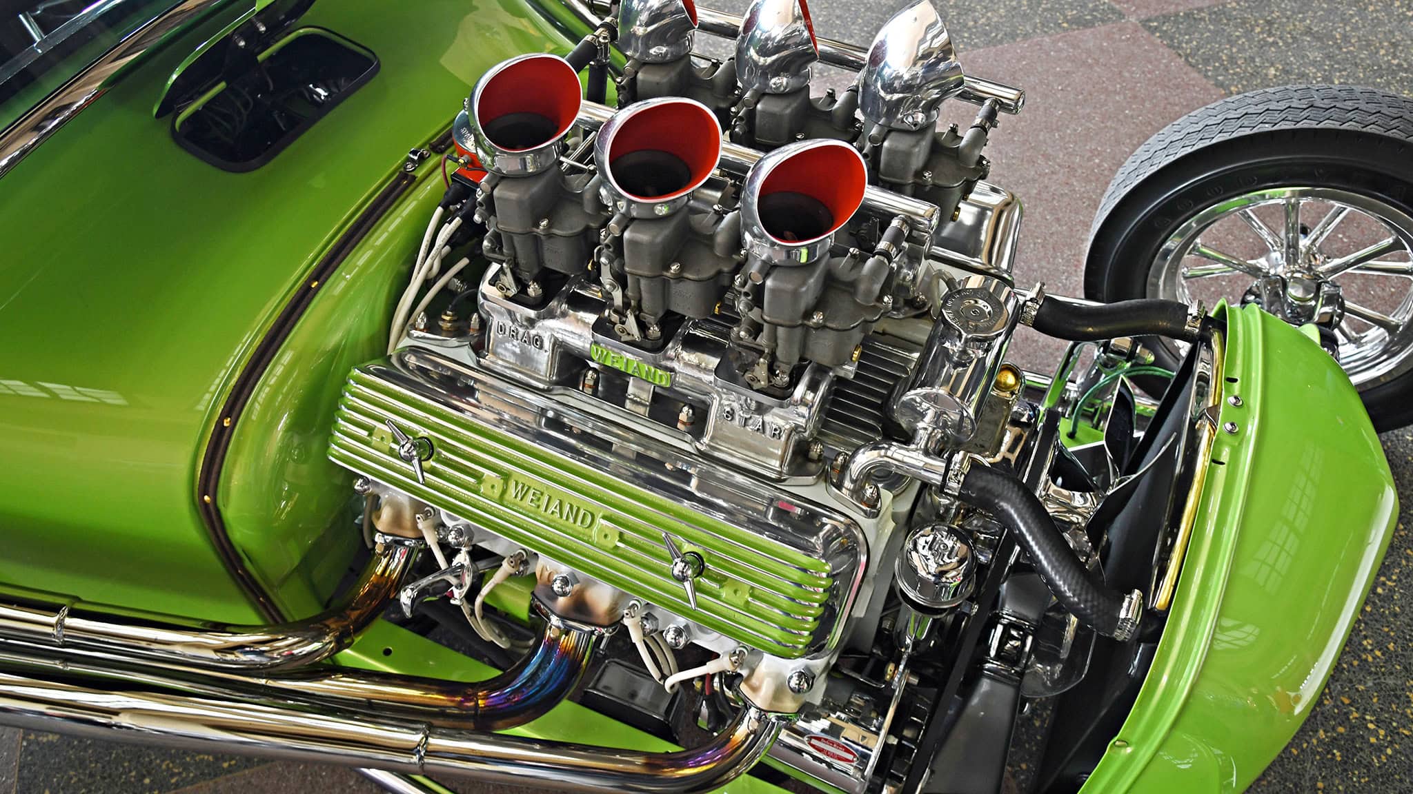 “Sunkist Model T” reçut ensuite une avalanche d’articles et de récompenses. Plus tard, Randy finit par vendre Sunkist, ainsi que sa précieuse Corvette de 1967 (427ci/435cv)… C’était pour acheter une maison… “La famille passe avant tout, et je me suis dit que je pourrais toujours construire autre chose le moment venu”… Heureusement pour Randy, “Sunkist Model T” est resté dans la région, et son fils Randy Jr. a fini par le racheter en 2014, gardant ainsi le bolide dans la famille, là où il avait sa place. Désireux de construire une autre voiture visuellement saisissante, Randy a puisé son inspiration dans son passé, combinant ses goûts personnels, parfois excentriques, pour lancer le projet : “Je construis des Hot Rod’s depuis longtemps, un peu à l’instinct. J’ai toujours eu un style un peu caricatural”... Il voulait construire un autre Model T déjanté. C’est son fils, Randy, qui l’a vraiment poussé à se lancer. À cela s’ajoutait le défi de construire ce Hot Rod avec un budget serré et des pièces de récupération. Randy a commencé avec une carrosserie de berline Model T de 1927 dont personne ne voulait plus : “Elle était en piteux état en vert Ford et était vendue avec quelques pièces détachées. J’ai liquidé toutes les pièces d’origine de carrosserie, car je n’en avais pas besoin pour ce projet. Au final, j’ai récupéré la carrosserie gratuitement après avoir tout vendu”… Je traduis par : “J’ai même récupéré ma mise”… Ensuite, il a acheté un châssis de Ford de 1932 et un moteur Oldsmobile. Ces éléments, combinés à la carrosserie récupérée, ont constitué la base de son projet : “J’ai toujours adoré les moteurs Olds”, m’a-t-il confié. Le V8 Olds de 5,3 litres (324 ci) de 1956 a été préparé avec une multitude de pièces performantes d’époque, dont un arbre à cames Eagle sur mesure, une rare admission Weiand à haut débit et un allumage Flamethrower…. Arghhhhhh, mais aussi de six carburateurs double corps de type Ford 94. Le spécialiste local Tony Feil s’est chargé du moteur, le portant à 400 chevaux.