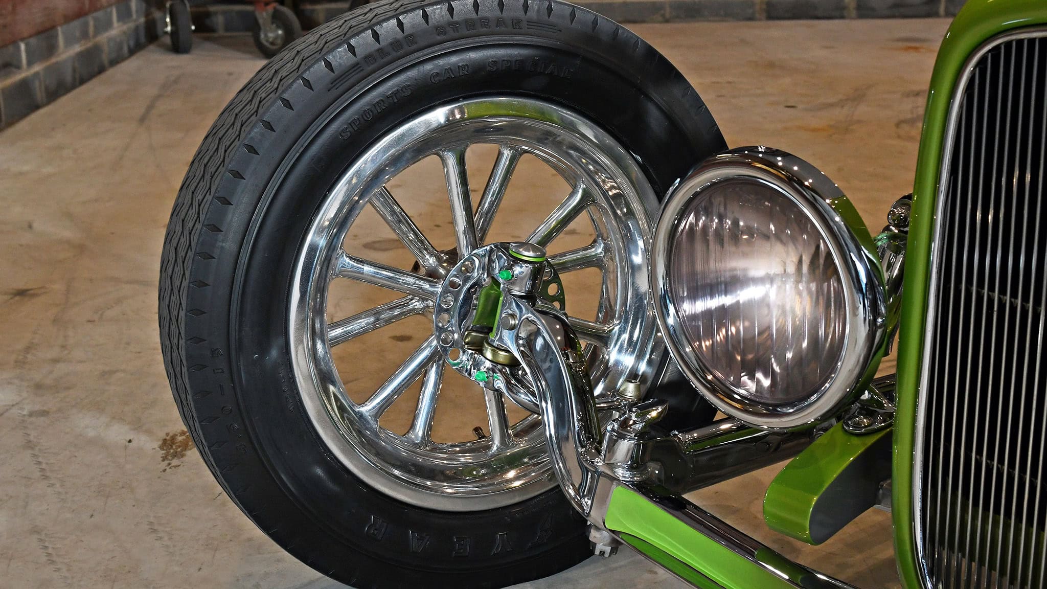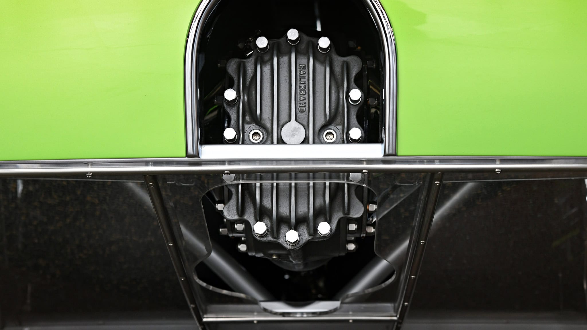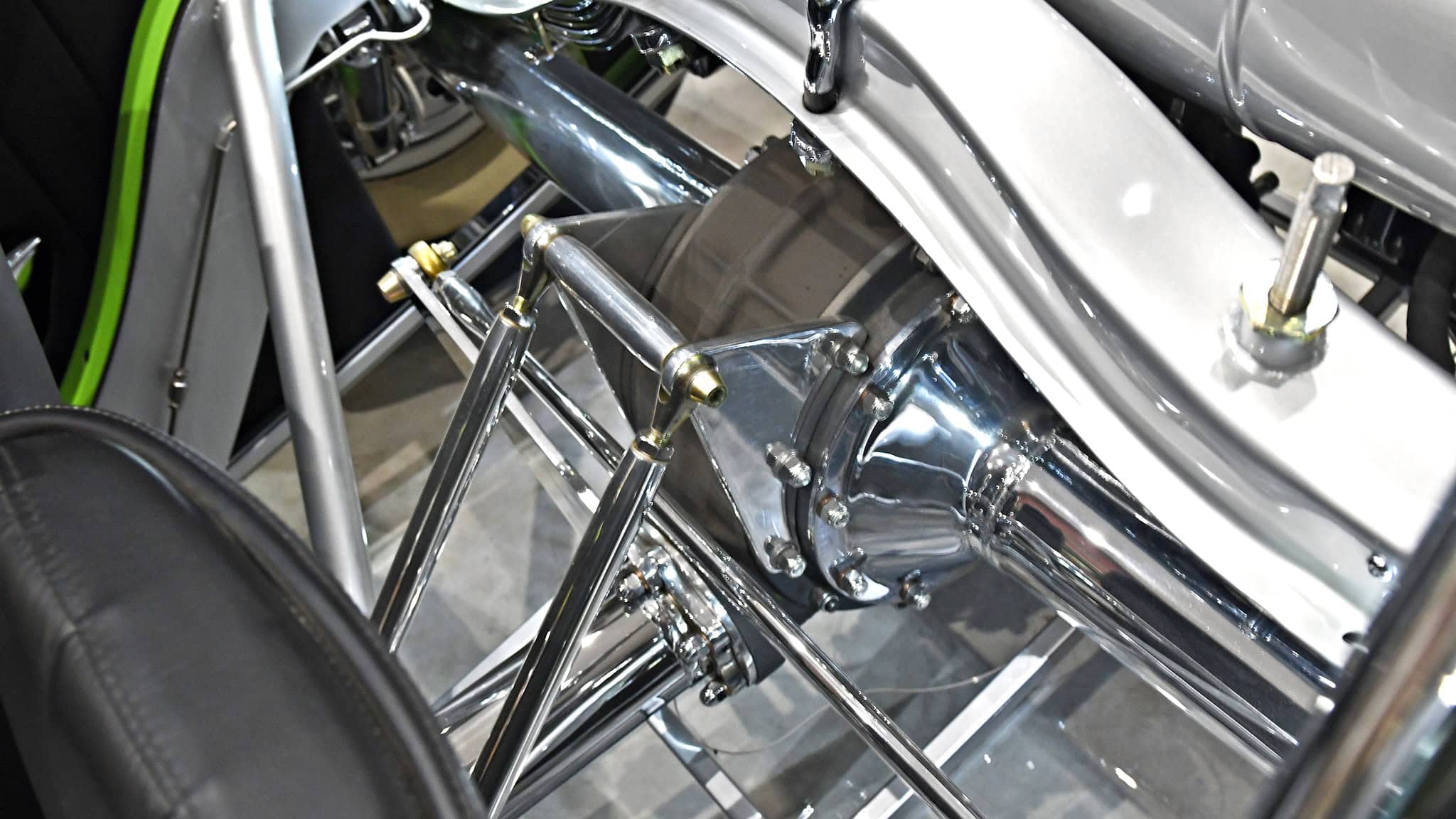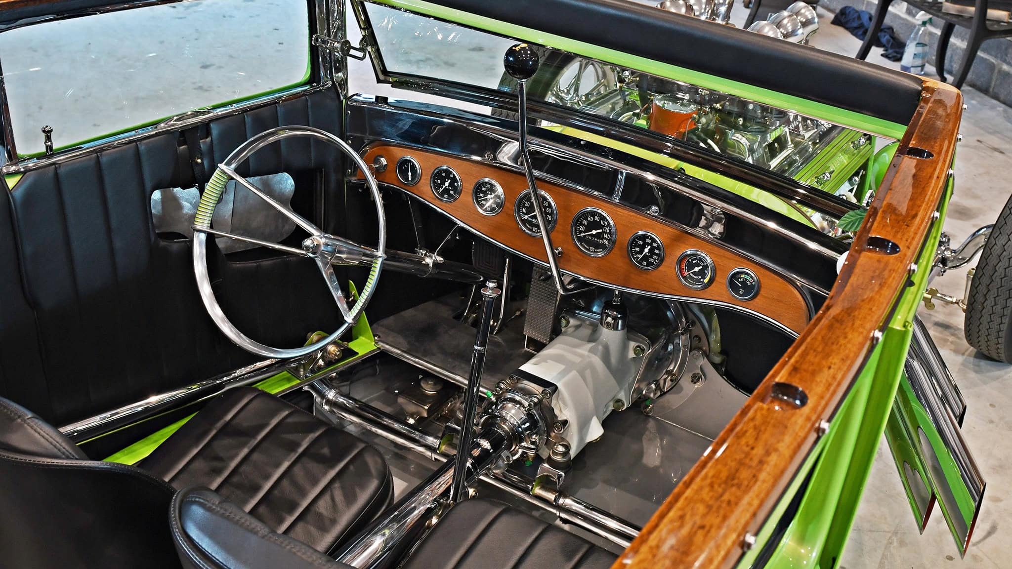 Assembler le châssis selon les besoins de Randy a nécessité un travail d’ingénierie considérable. “Le châssis a été rétréci à l’avant, élargi au milieu et rétréci à l’arrière. Puis, il a été incliné de plus de 30 cm pour obtenir l’allure que je souhaitais” explique-t-il. L’essieu avant provient d’une Ford de 1932. Randy a pris son temps pour le travailler, le ponçant et le polissant jusqu’à obtenir le résultat désiré. La boîte de vitesses provient d’une Cadillac LaSalle, et un pont arrière Halibrand 301 à changement rapide transmet la puissance à l’arrière ou se découvre une suspension sur mesure composée d’un ressort Ford T et de supports fabriqués. Quoique c’est artisanal, le tout assure une tenue de route impeccable. De gros freins à tambour de Lincoln ont été installés pour freiner ce bolide surpuissant. Bien que la transmission soit relativement simple, on voit que la carrosserie a fait l’objet d’une restauration complète : “On a commencé par couper le toit en deux et on a continué à partir de là. Chaque panneau, chaque centimètre carré de cette voiture a subi une modification. C’est un travail colossal”… m’a expliqué Randy. Les collecteurs d’échappement ont surtout représenté un défi de taille en raison de la faible hauteur de caisse de la voiture. Il fallait les fixer le long des flancs de la carrosserie, ce qui s’annonçait délicat. Pour les intégrer, Randy a conçu un panneau de porte intérieur encastré et rétractable, permettant au collecteur de passer à travers la tôle extérieure de la porte lors de son ouverture. Il a fabriqué ces collecteurs à partir de carters d’arbre de transmission intérieurs de Ford 1936, coniques aux deux extrémités et soudés à des brides sur mesure. Randy savait qu’il devait affirmer son style avec une couleur extérieure audacieuse pour sublimer le design novateur de sa Model T. “Je voulais une teinte saisissante. Il fallait que ce soit un véritable régal pour les yeux, quelque chose qui attire immédiatement le regard. Je suis donc allé chez un concessionnaire Lamborghini et j’ai choisi cette peinture, appelée Verde Ithaca”…