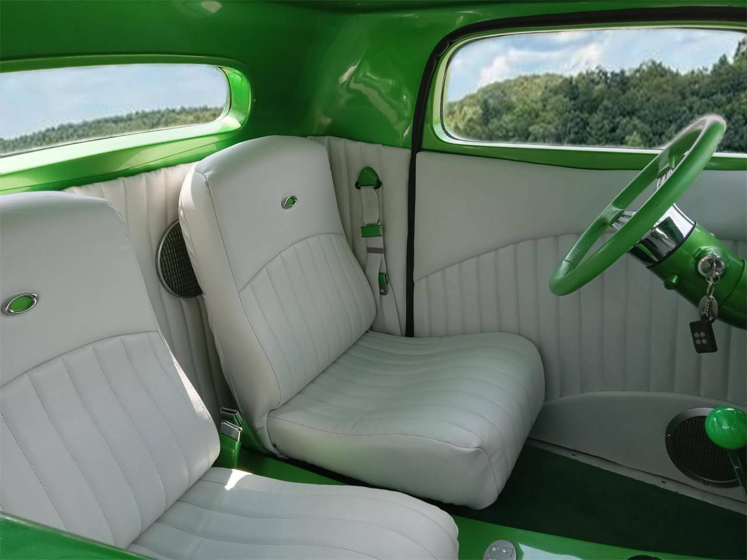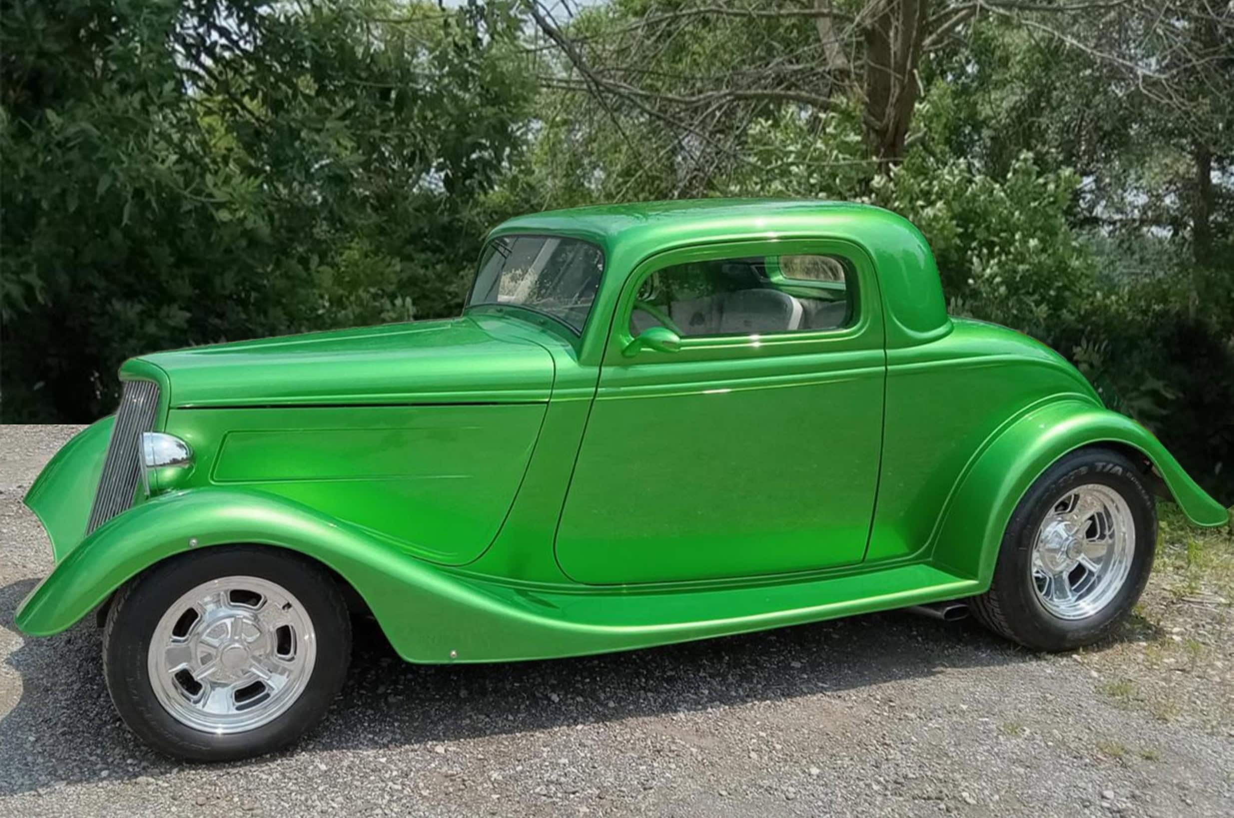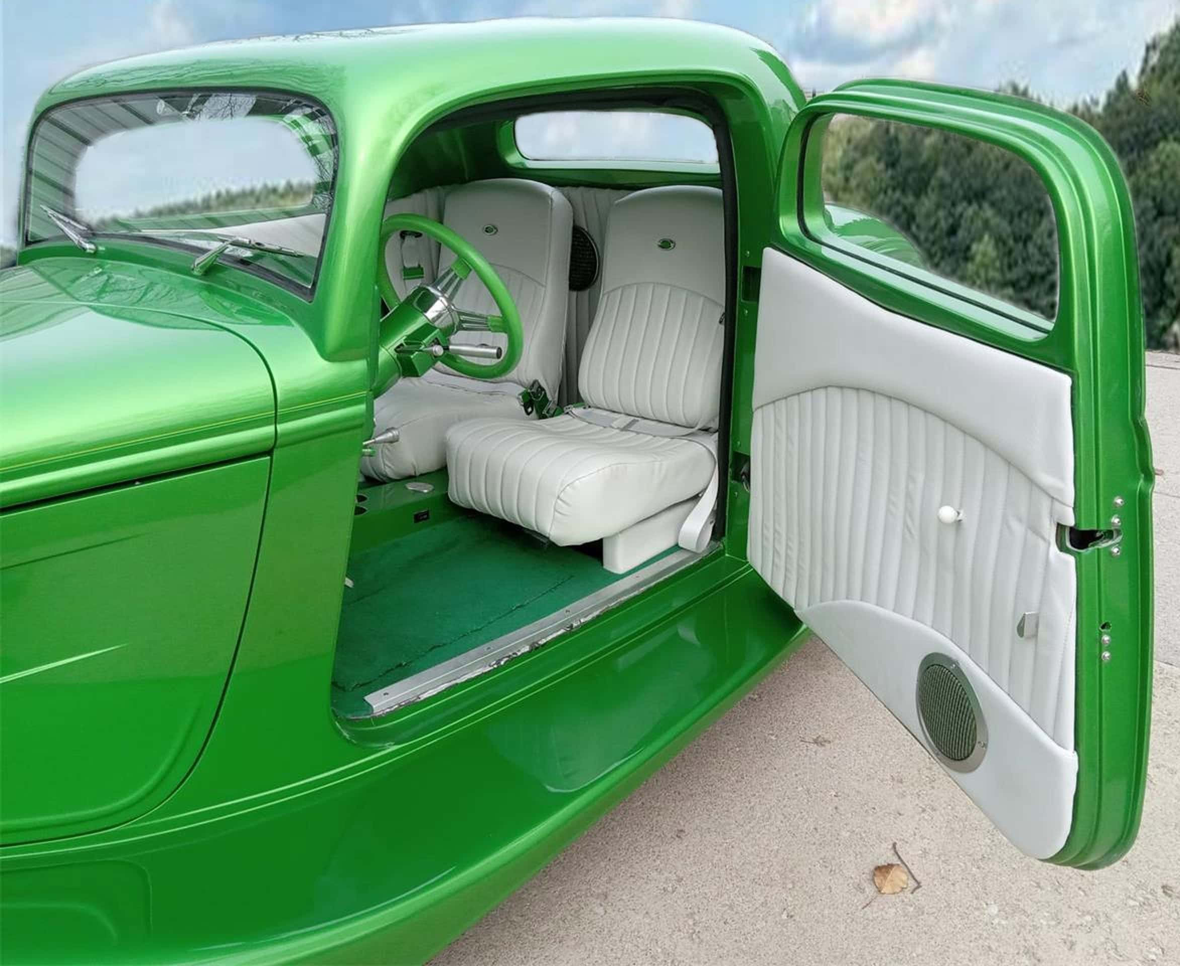 C’est un dernier cri de liberté dans un monde qui ne veut plus de liberté, seulement de conformité. Ce coupé Ford 1934 unique en son genre est un Hot Rod moderne achevé en 2020. L’intérieur a été finalisé en 2024. La voiture n’affiche que 4.474 miles au compteur depuis sa construction. La carrosserie est une reproduction en fibre de verre de chez “StreetBeasts”, avec un toit abaissé de 3po par rapport à une Ford de 1934 d’origine. Les portes à ouverture antagoniste avec poignées rasées et les marchepieds lisses sont des atouts indéniables. Peinte dans une teinte personnalisée “Synergy Green” avec un intérieur en vinyle couleur craie, cette combinaison de couleurs offre un rendu saisissant. Le châssis, réalisé sur mesure, est équipé de freins à disque aux quatre roues, d’une suspension arrière triangulée à quatre bras et d’un pont arrière Ford 9po préparé par “Currie”. Vitres électriques, verrouillage centralisé, climatisation et régulateur de vitesse contribuent à son confort moderne.