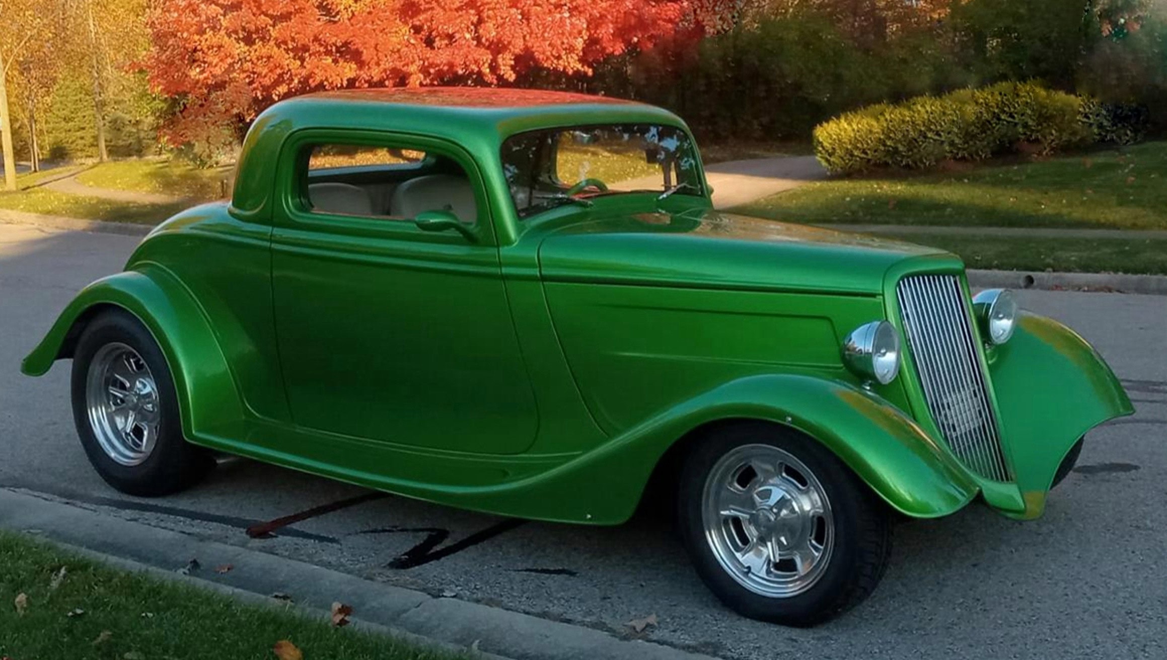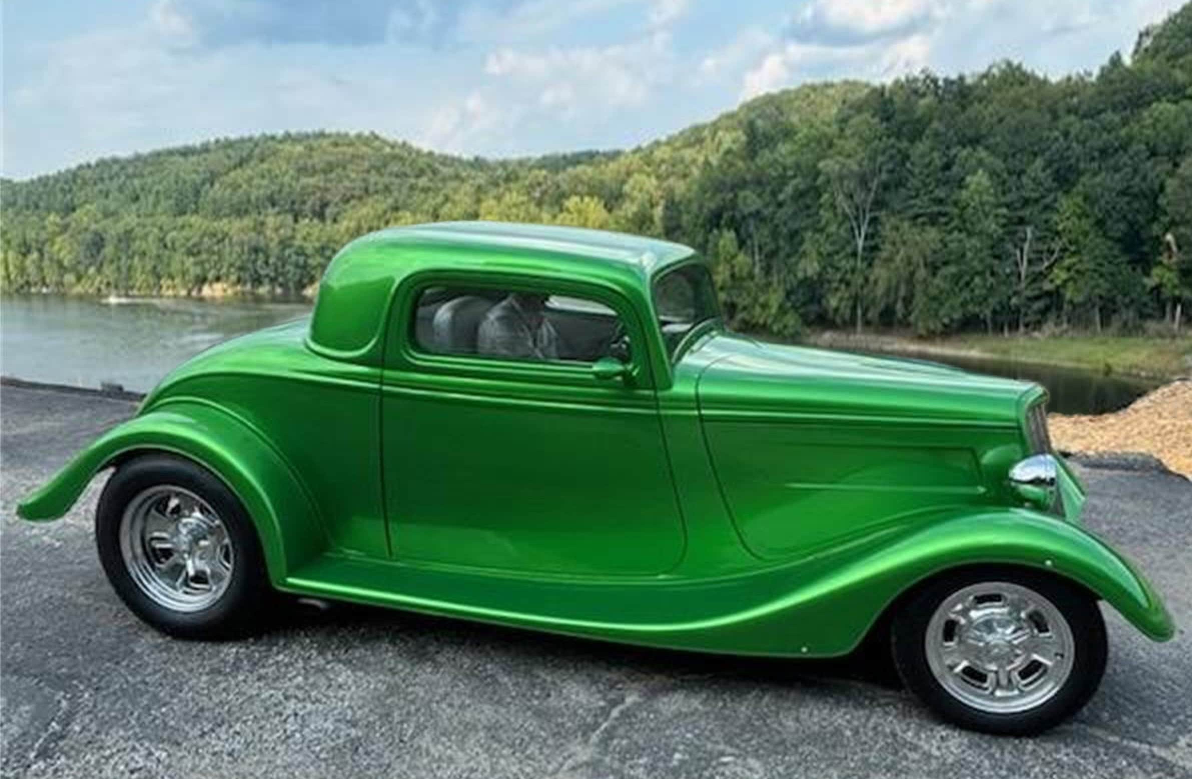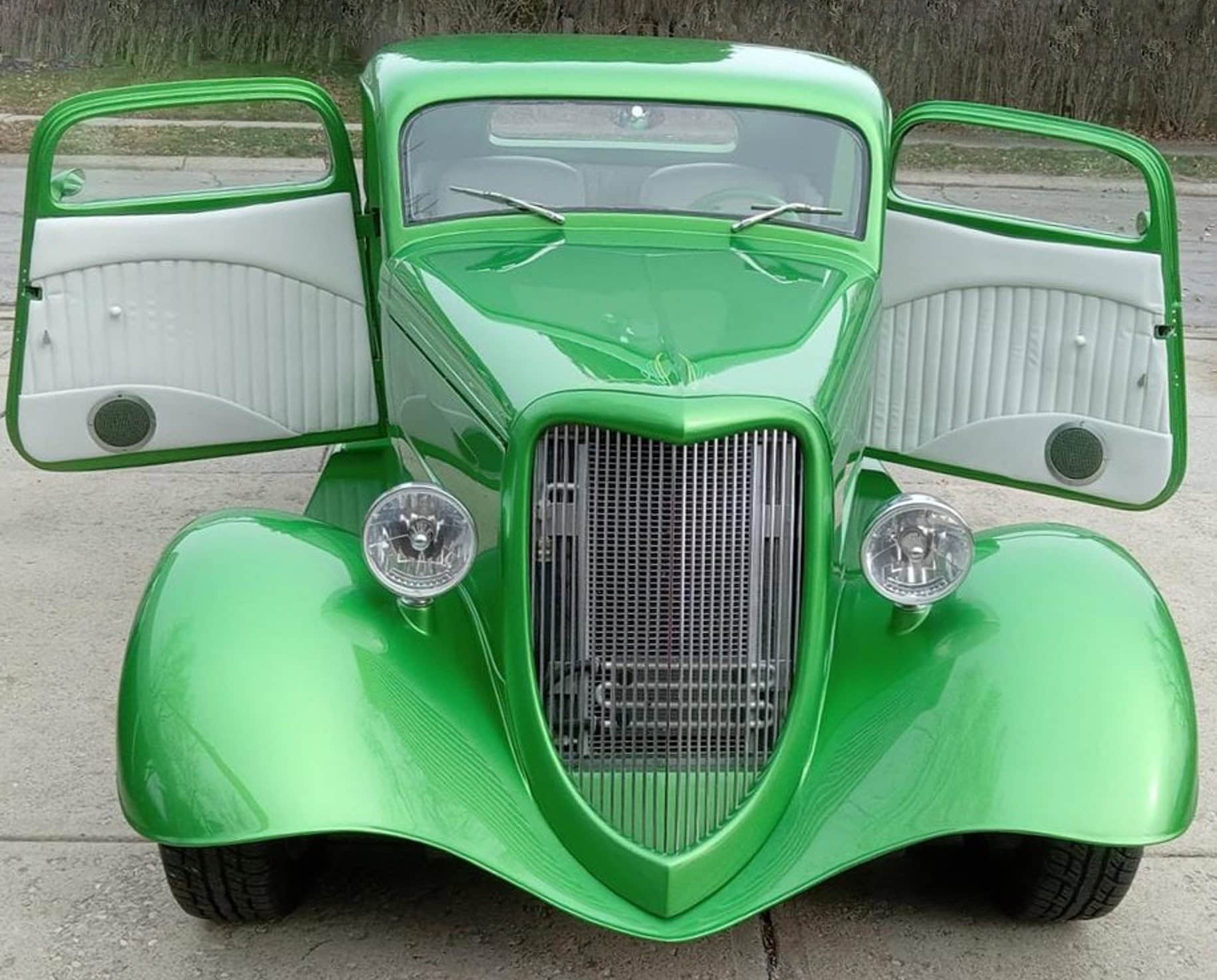 C’est un dernier cri de liberté dans un monde qui ne veut plus de liberté, seulement de conformité. Ce coupé Ford 1934 unique en son genre est un Hot Rod moderne achevé en 2020. L’intérieur a été finalisé en 2024. La voiture n’affiche que 4.474 miles au compteur depuis sa construction. La carrosserie est une reproduction en fibre de verre de chez “StreetBeasts”, avec un toit abaissé de 3po par rapport à une Ford de 1934 d’origine. Les portes à ouverture antagoniste avec poignées rasées et les marchepieds lisses sont des atouts indéniables. Peinte dans une teinte personnalisée “Synergy Green” avec un intérieur en vinyle couleur craie, cette combinaison de couleurs offre un rendu saisissant. Le châssis, réalisé sur mesure, est équipé de freins à disque aux quatre roues, d’une suspension arrière triangulée à quatre bras et d’un pont arrière Ford 9po préparé par “Currie”. Vitres électriques, verrouillage centralisé, climatisation et régulateur de vitesse contribuent à son confort moderne.