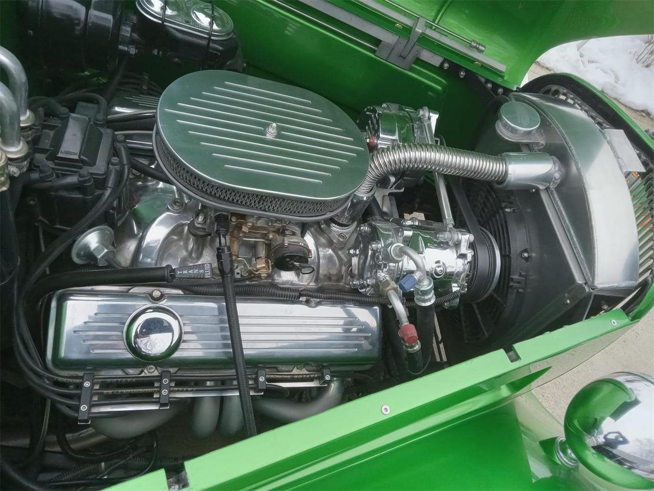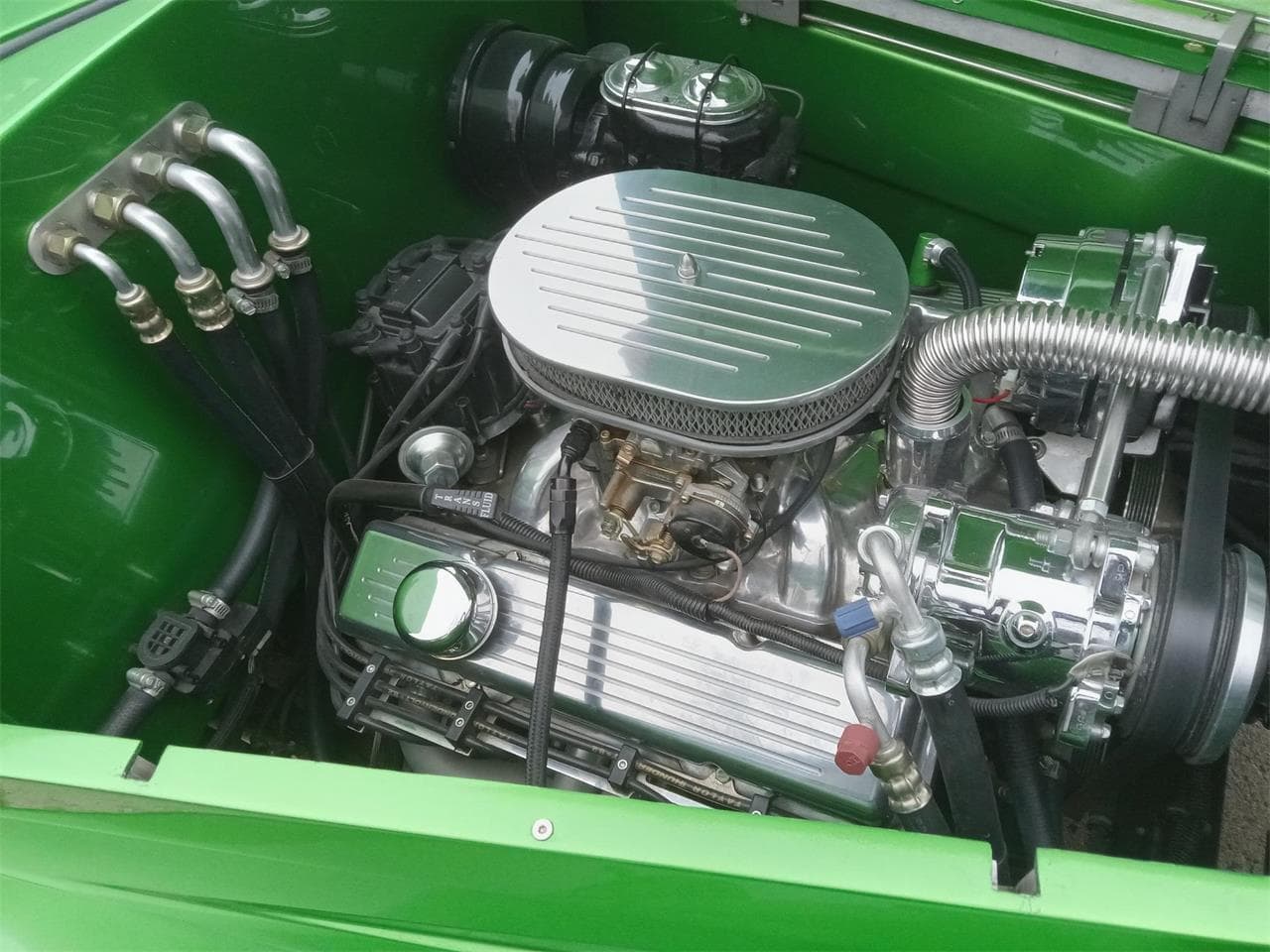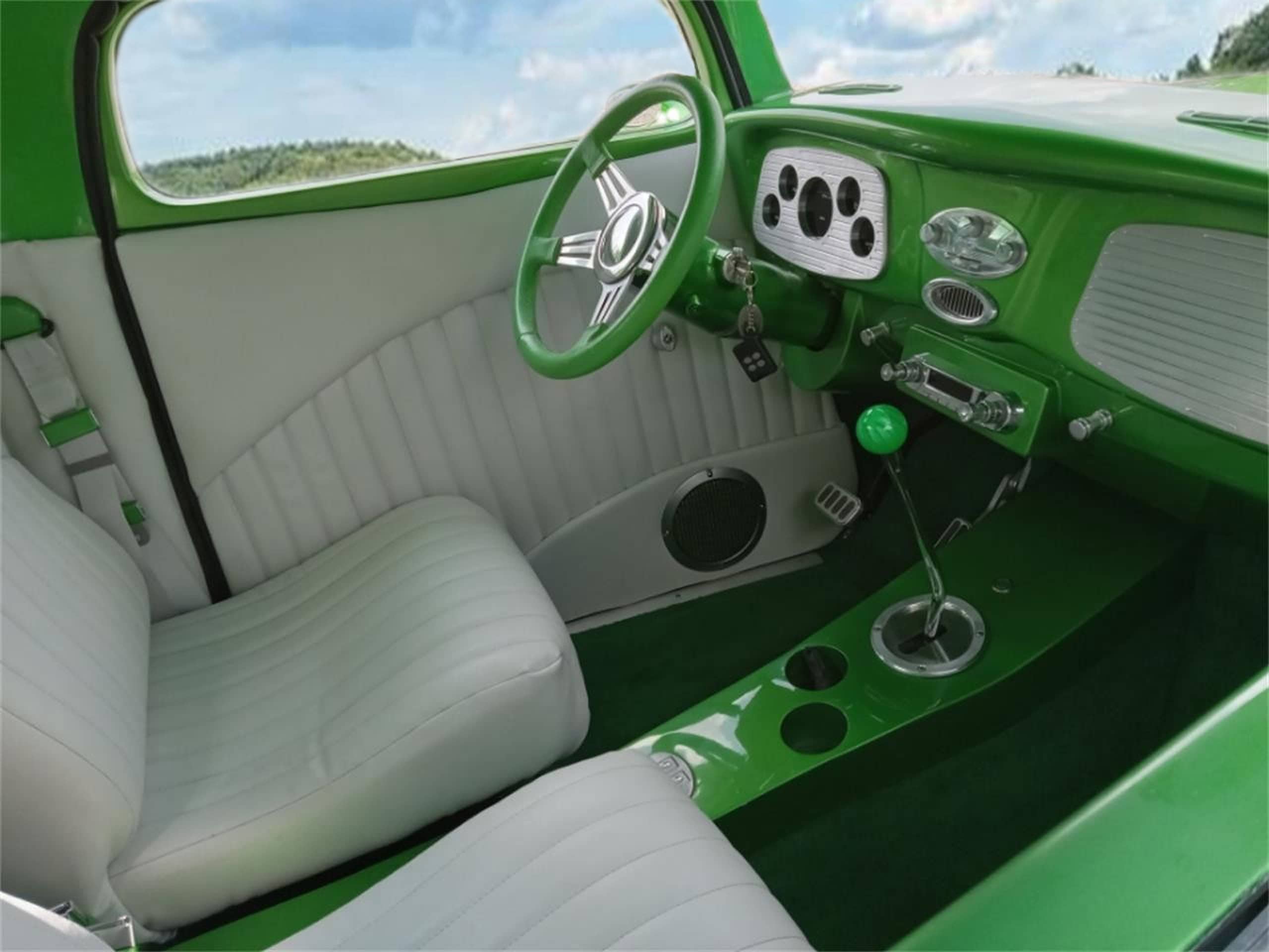 Il y a aussi unpommeau de levier de vitesses vert personnalisé, frein de stationnement électronique, ceintures de sécurité à 3 points. Prise 12 V. Système “Vintage Air” Gen 2 de climatisation/chauffage/dégivrage. Commandes et bouches d’aération en aluminium usiné. Isolation phonique “Dynamat” et “Dynaliner” dans tout le véhicule (portières, plancher, coffre, toit). Faisceau de câblage “Kwik Wire”, batterie 12 volts avec plateau caché derrière la roue arrière avec interrupteur de coupure de batterie pour la sécurité. Ouvre-portes électriques. Nouveau V8 Chevrolet Small Block de 5,7 litres (350ci) 360cv, culasses hautes performances “Patriot” 67 cm³ en fonte. Collecteurs d’échappement “JEGS” à revêtement céramique. Filtre à air et cache-culbuteurs en aluminium poli. Carburateur “Edelbrock” 650 CFM poli avec starter électrique. Système d’entraînement par courroie serpentine “March Performance”. Boîte automatique (700 R4) de “Gearstar Performance Transmissions”, levier de vitesses “Lokar” et un radiateur sur mesure “Performance Rod & Custom”.