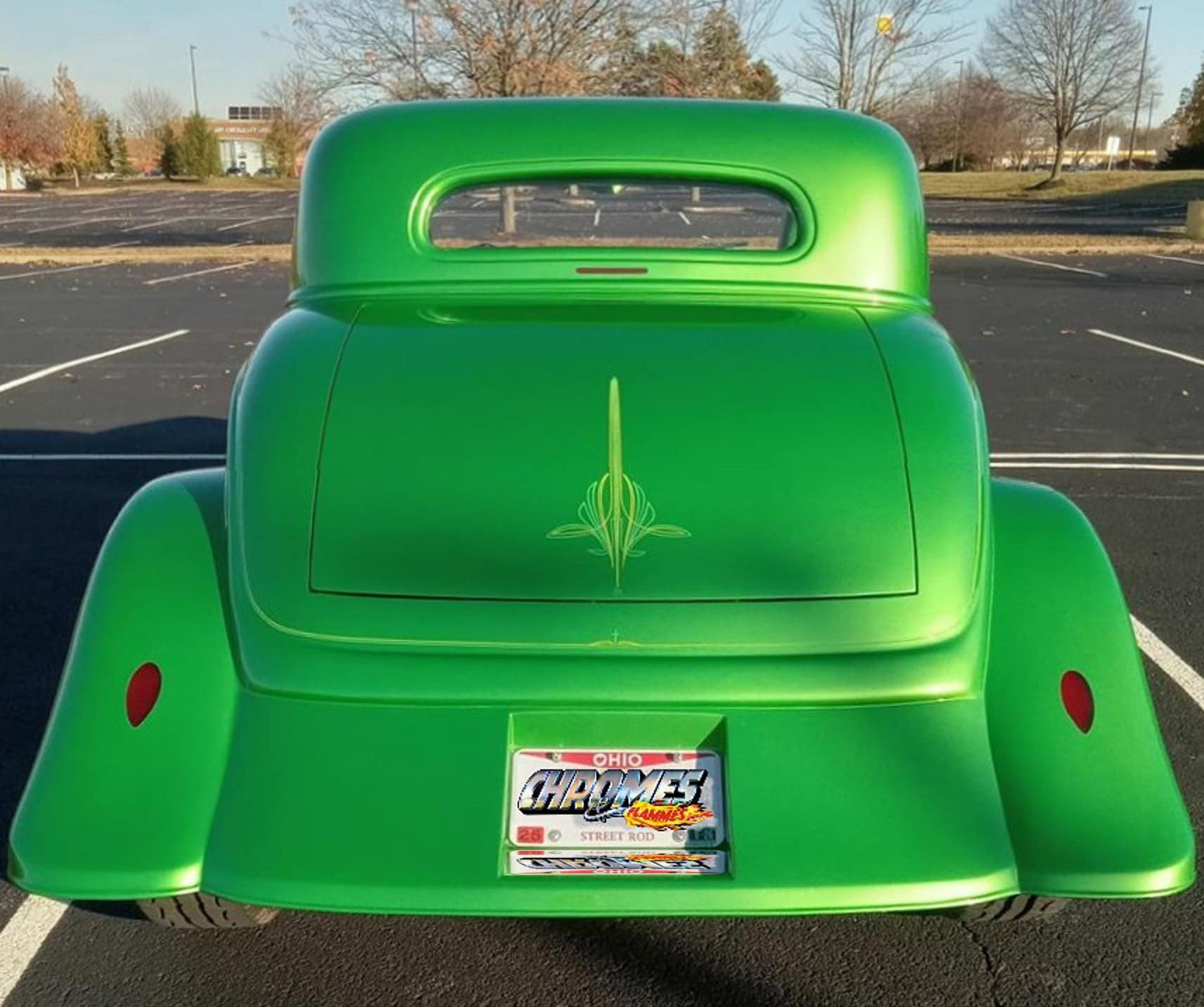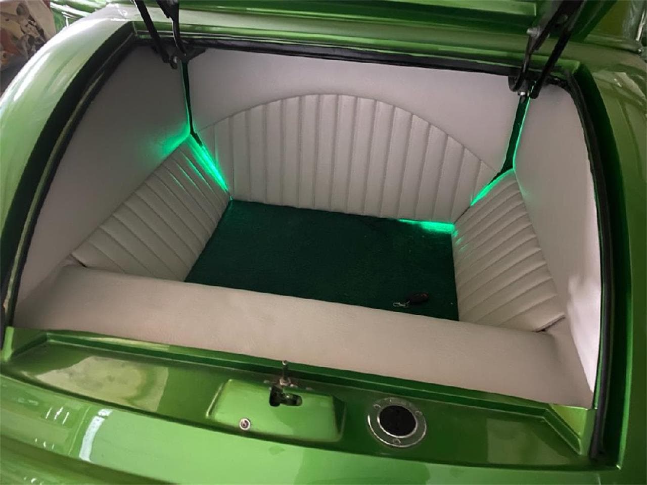 En cas d’achat pour 45.500$, une housse de protection intérieure et un chargeur de batterie sont fournis, ainsi qu’un dossier complet de factures et de documents relatifs à la construction. La bête se trouve à Colombus dans l’Ohio, USA… Capot à triple ouverture de chez “Carolina Customs” : Train avant indépendant de Mustang II avec bras de suspension tubulaires, fusées d’essieu abaissées et amortisseurs à ressorts hélicoïdaux. Amortisseurs à gaz à l’arrière, associant un pont arrière “Ford Currie” 9 po rétréci avec un rapport de 3,50. Freins à disque aux 4 roues (11 po, aux quatre coins). Jantes “Billet Specialties Legacy” avec moyeux centraux à fixation centrale, sur pneus “BFGoodrich Advantage T/A Sport” (185/65R15 AV + 245/65R17 AR). Volant de 14po gainé de cuir teinté couleur carrosserie, tableau de bord numérique “Dakota Digital” avec affichage LED vert, commandes de lève-vitres électriques avec témoins lumineux verts intégrés, verrouillage centralisé, autoradio “RetroSound” avec affichage LED vert assorti, grilles de haut-parleurs peintes en vert…