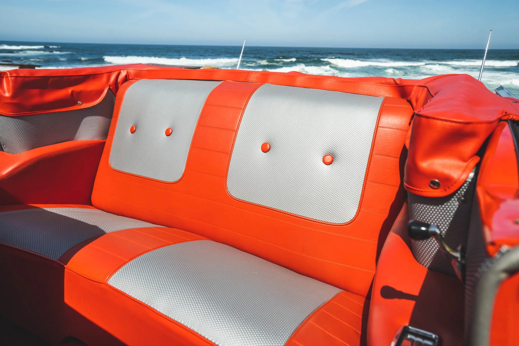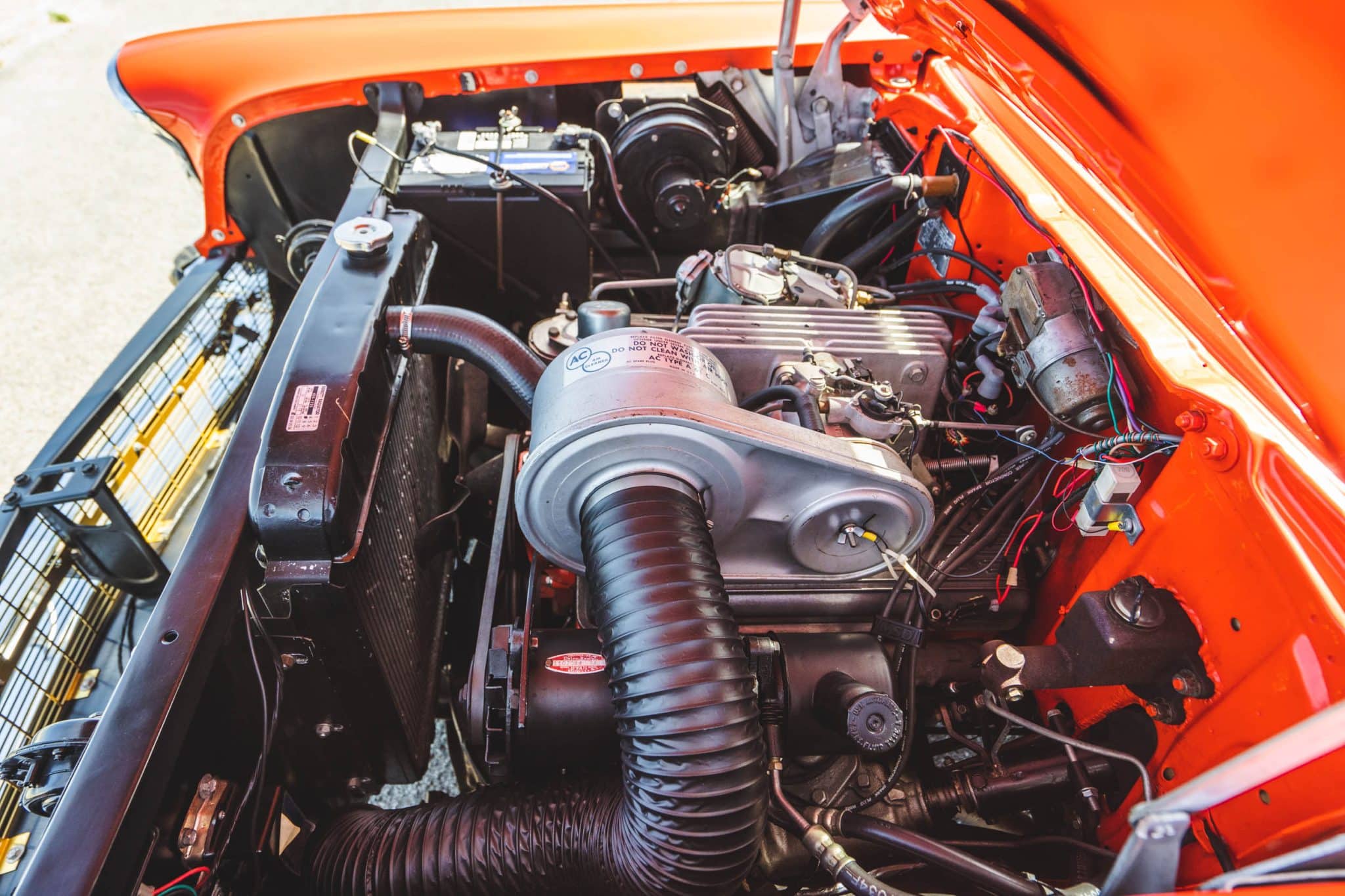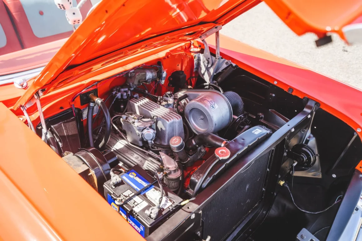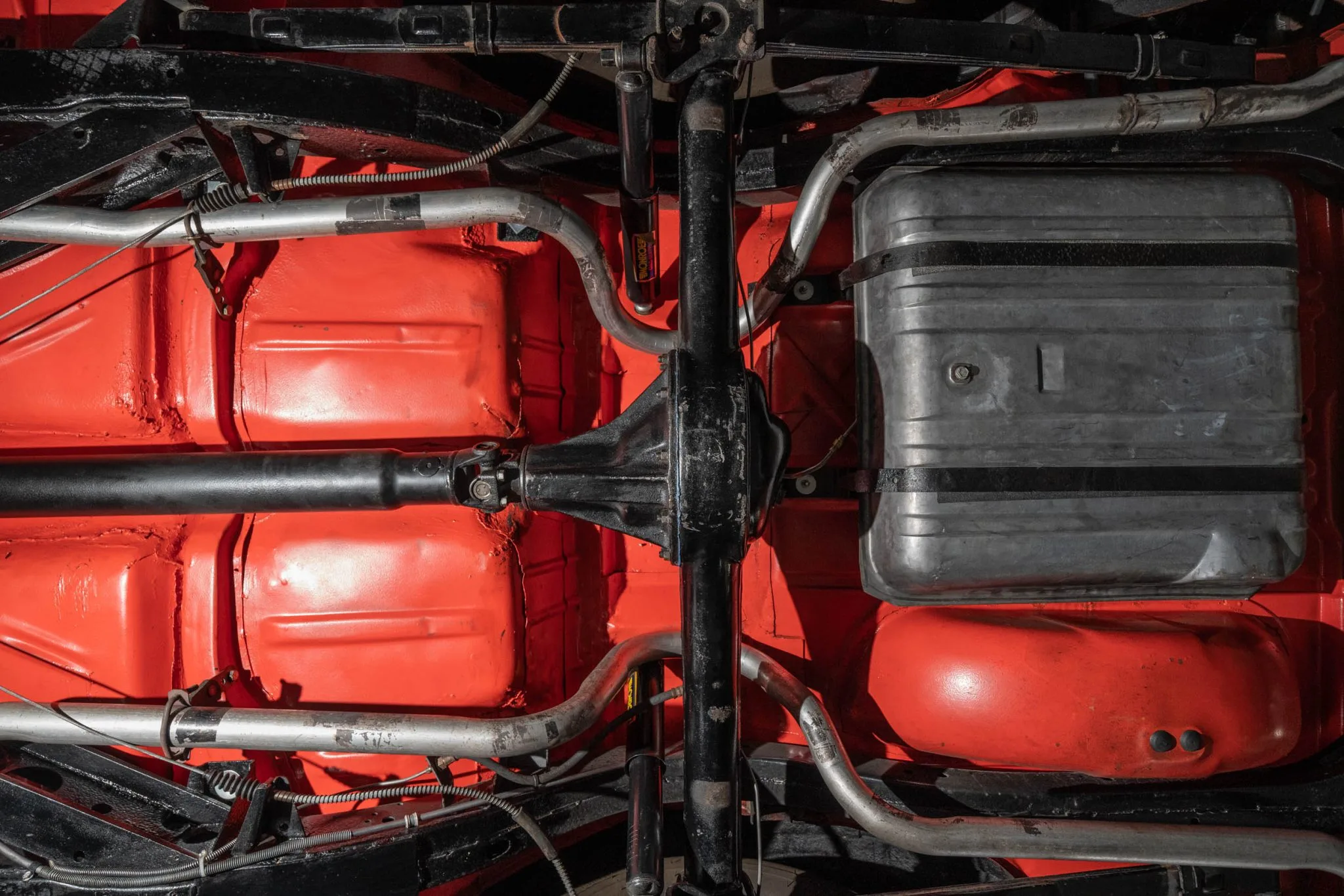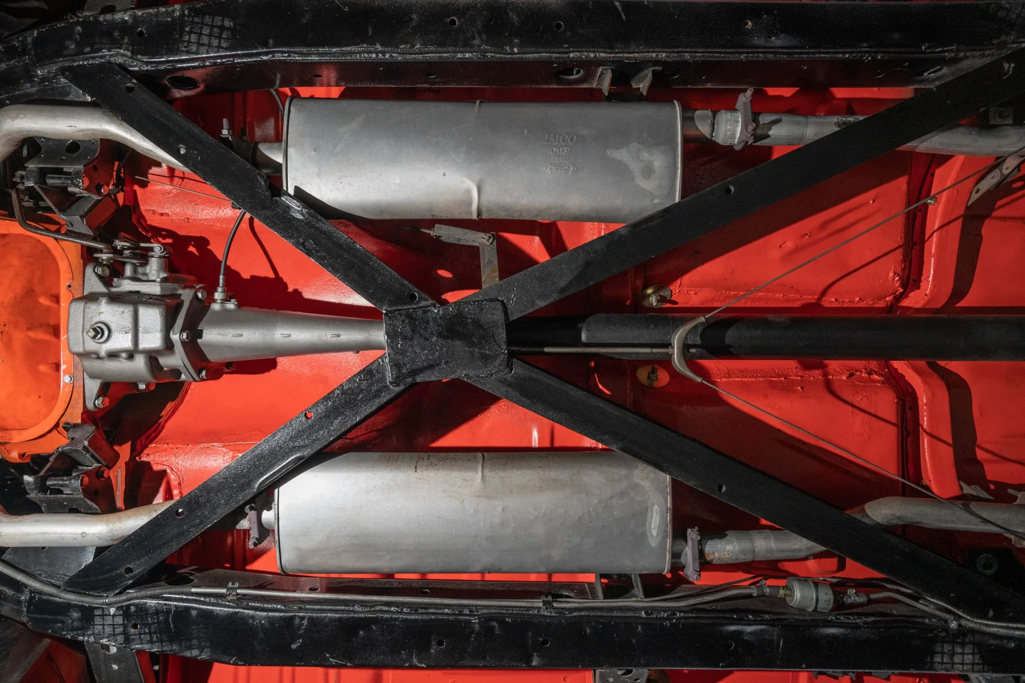 Le Continental-Kit est articulé sur le pare-chocs arrière. L’amortissement est assuré par des Monroe et le freinage est fourni par des tambours aux quatre roues. Le volant à deux branches est doté d’un anneau de klaxon chromé et encadre un compteur de vitesse gradué jusque 120 mph flanqué de compteurs de température et de niveau de carburant. Un tachymètre Auto Meter 7k-rpm est monté sous les commandes du chauffage. L’odomètre à cinq chiffres a été remis à zéro au moment de la remise à neuf. Il affiche maintenant perpétuellement 2 miles, bien que le kilométrage total est inconnu.
