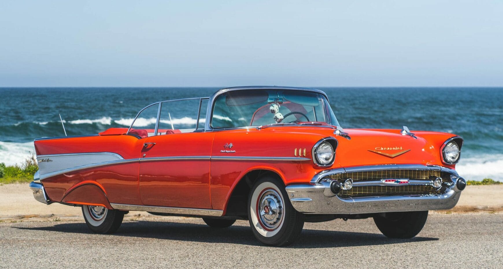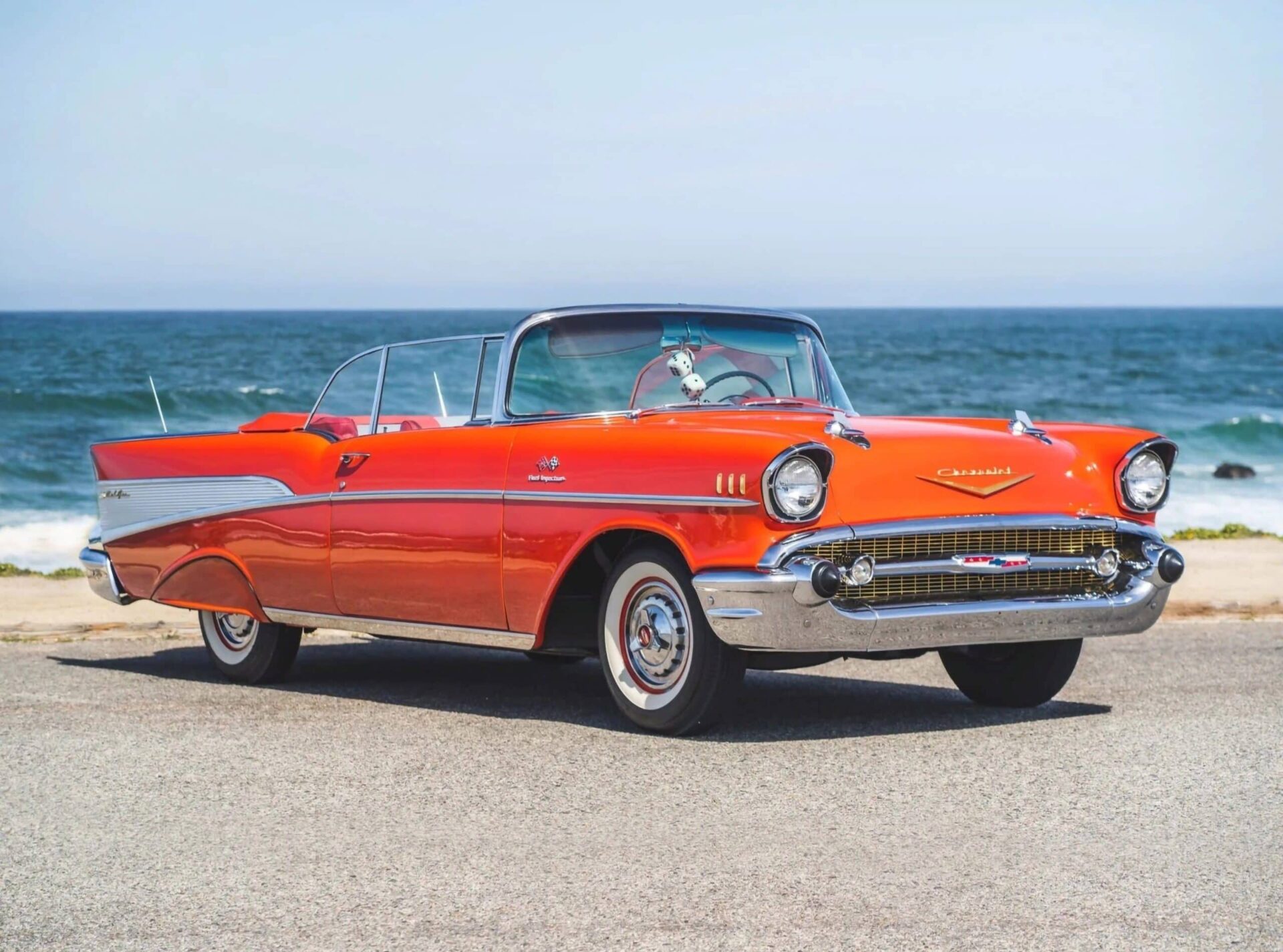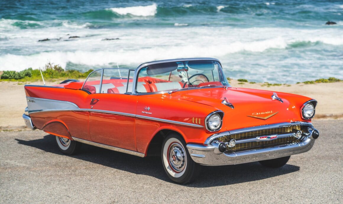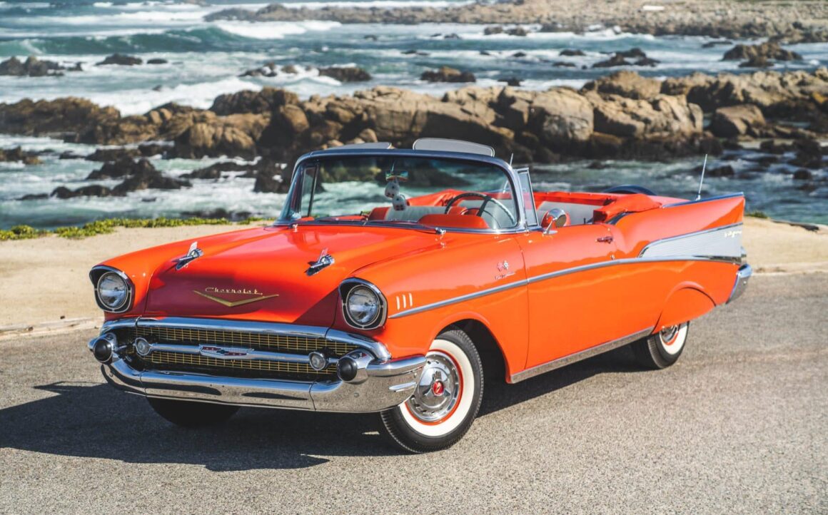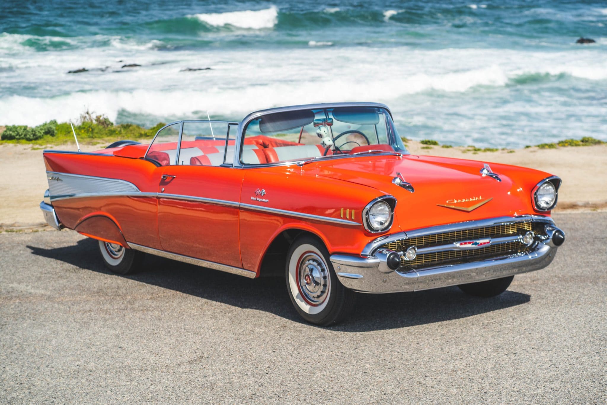 Chevrolet Bel Air Fuelie cabriolet 1957 – Fabriquées entre 1955et 1957 – Il n’existe que 68 cabriolets Fuelie 250ci de 1957) – Prix à l’origine: 4.142 $ Évaluation 2023 : entre 80.000 $ et 165.000 $ pour les cabriolets Fuelie – Emplacement du numéro de châssis: Plaque sur le montant charnière de la porte avant gauche – Emplacement du numéro de moteur: Tampon à l’avant du bloc sous la culasse droite – Infos club : Tri Chevy Association www.trichevy.org