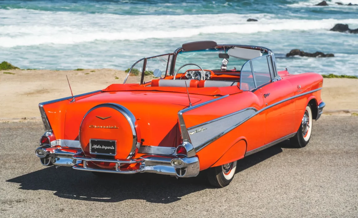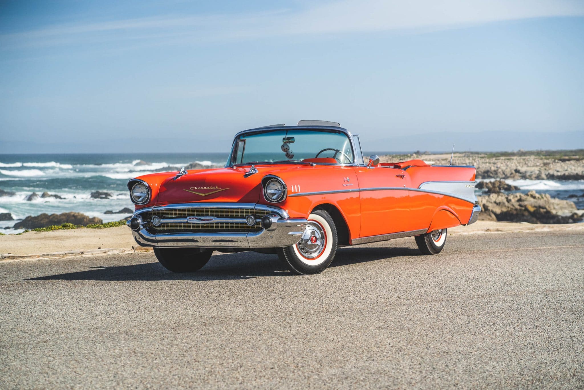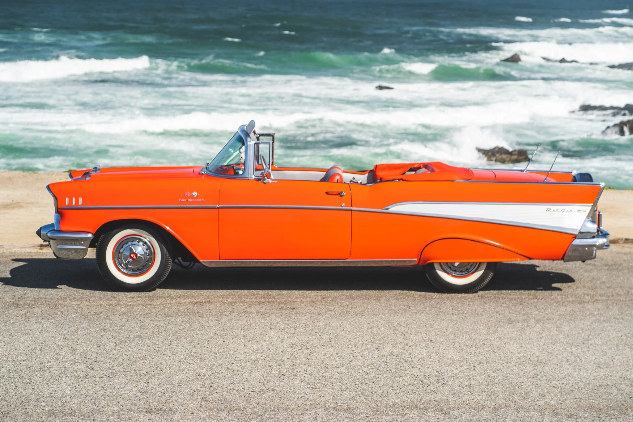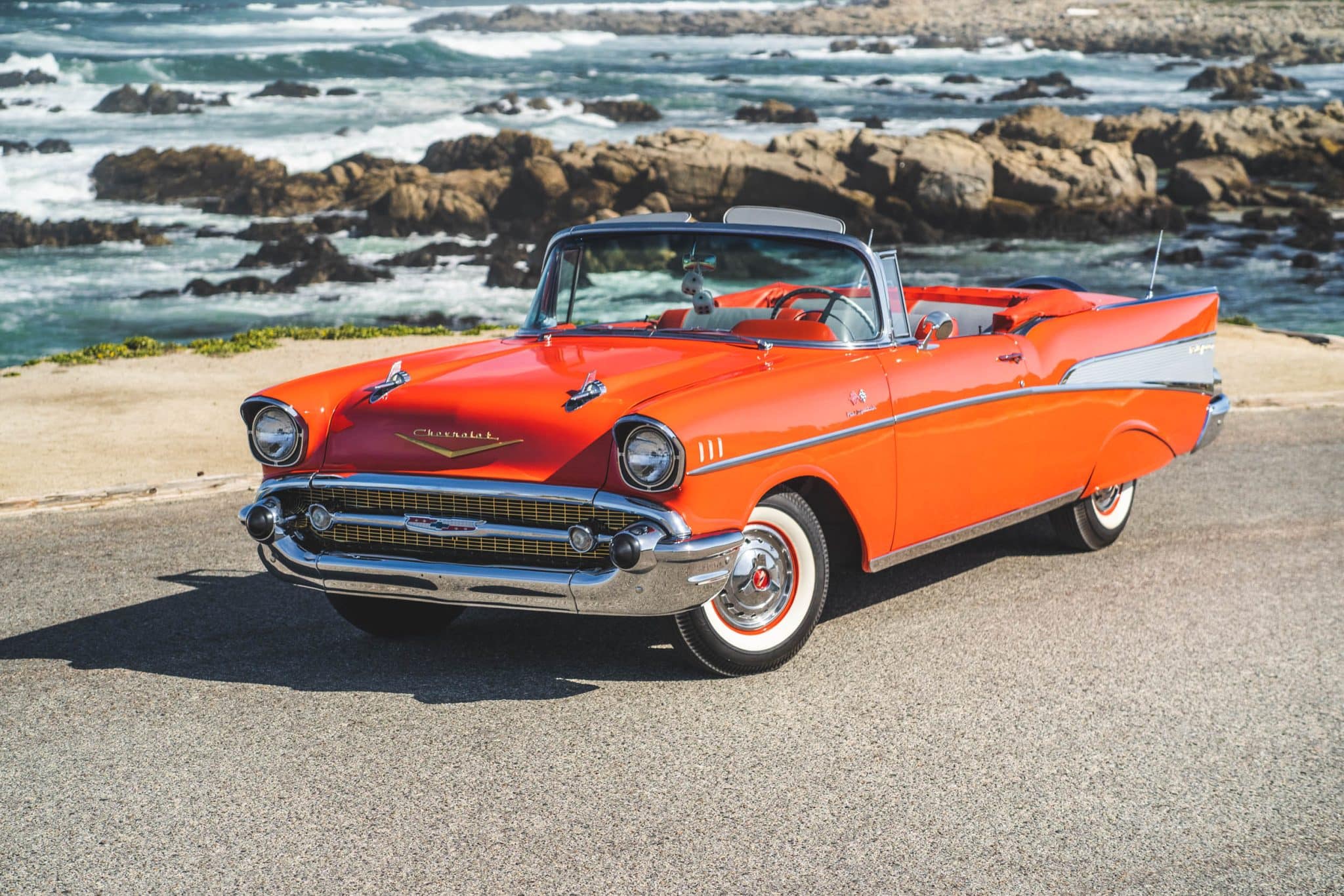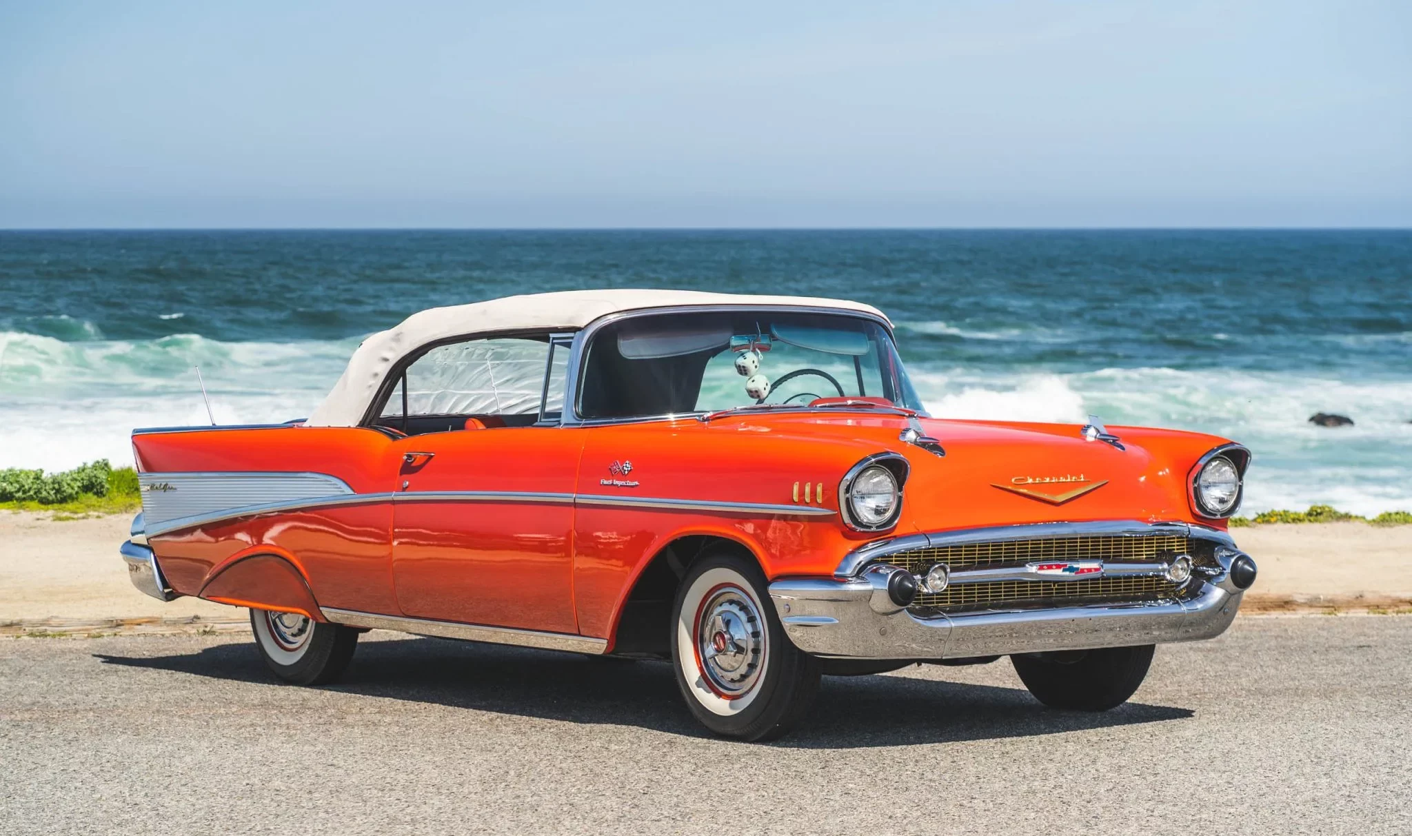 Chevrolet Bel Air Fuelie cabriolet 1957 – Fabriquées entre 1955et 1957 – Il n’existe que 68 cabriolets Fuelie 250ci de 1957) – Prix à l’origine: 4.142 $ Évaluation 2023 : entre 80.000 $ et 165.000 $ pour les cabriolets Fuelie – Emplacement du numéro de châssis: Plaque sur le montant charnière de la porte avant gauche – Emplacement du numéro de moteur: Tampon à l’avant du bloc sous la culasse droite – Infos club : Tri Chevy Association www.trichevy.org
