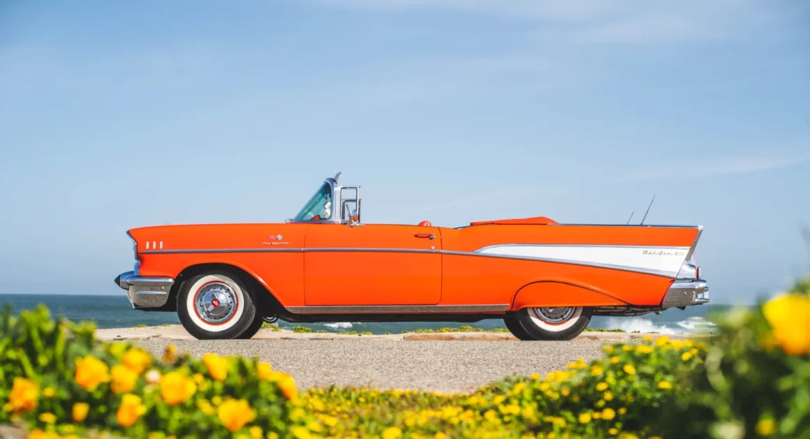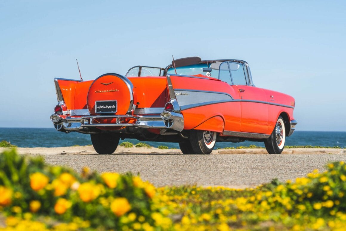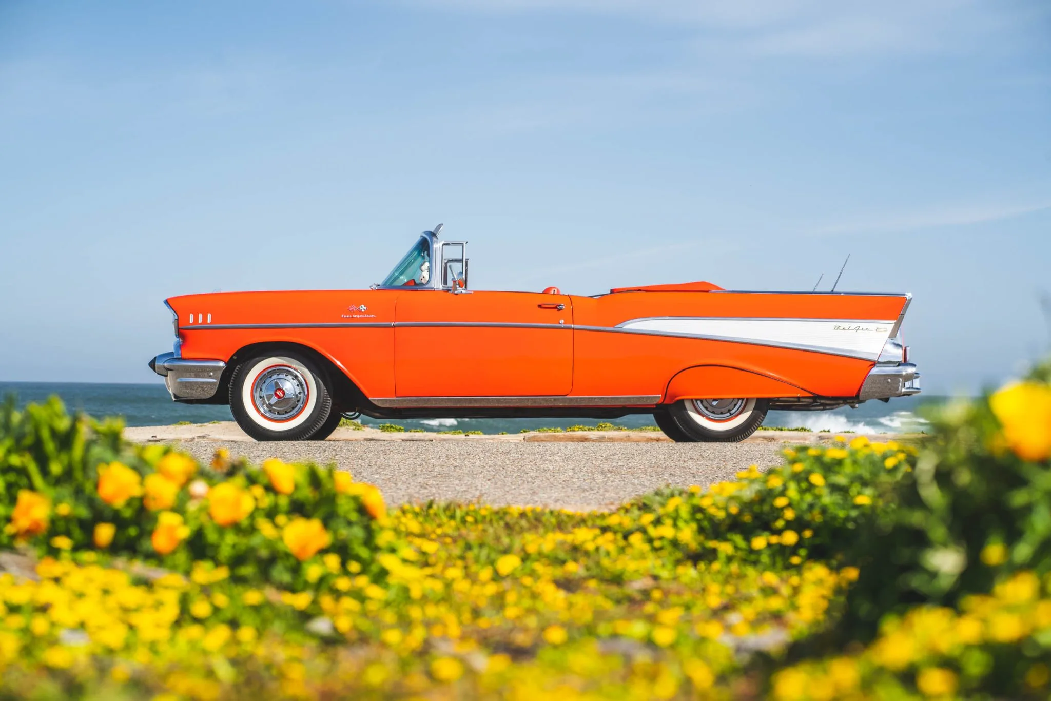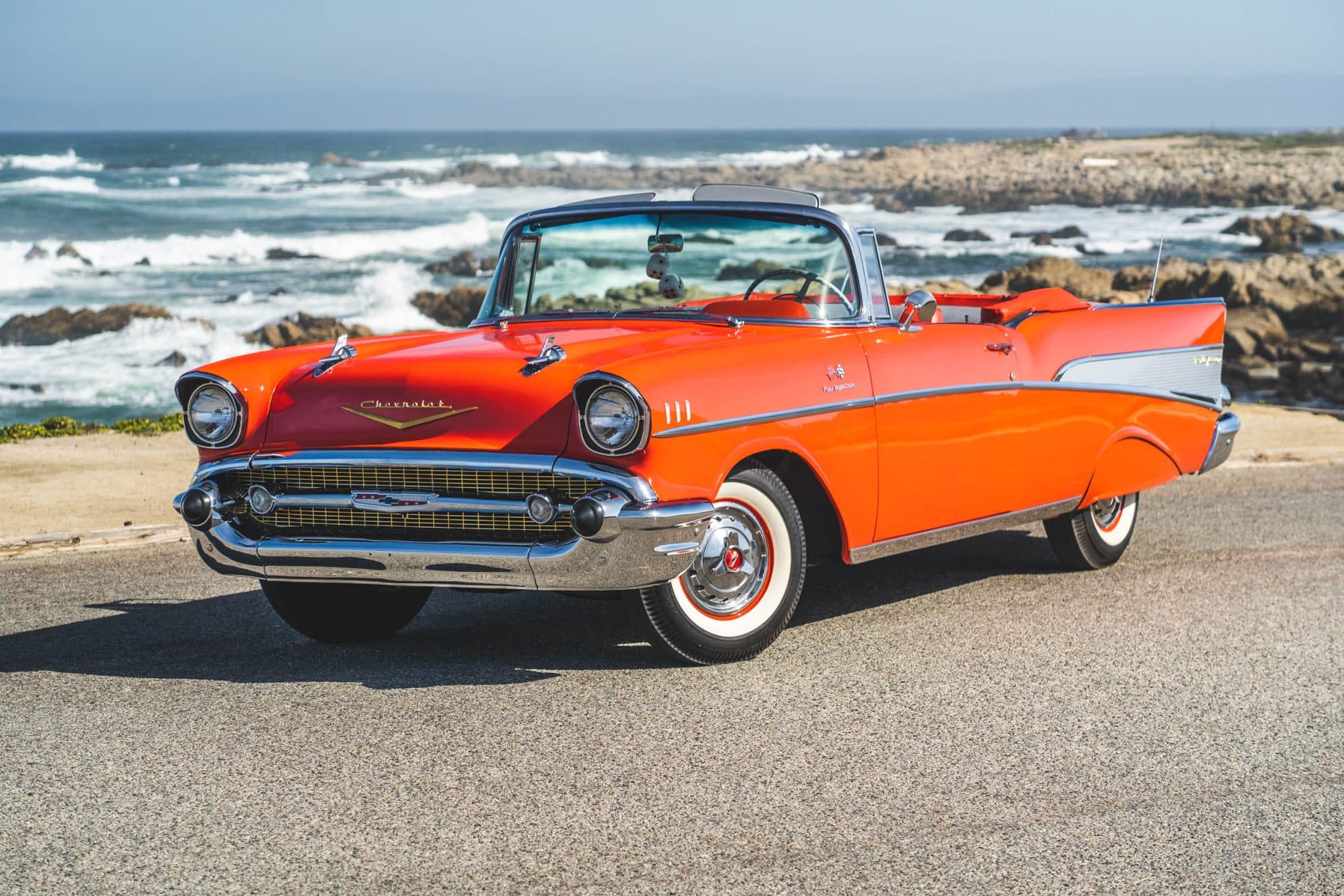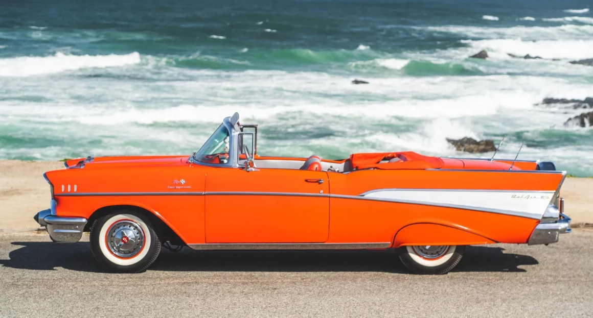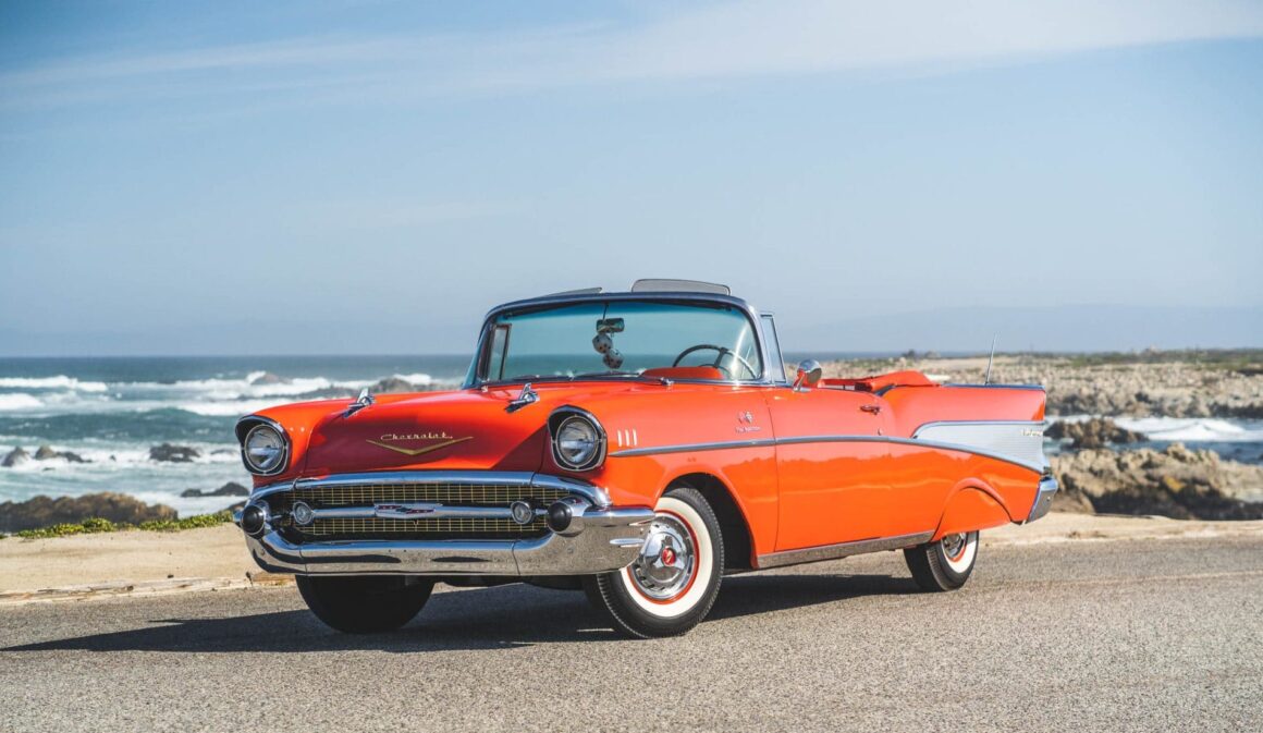 Chevrolet Bel Air Fuelie cabriolet 1957 – Fabriquées entre 1955et 1957 – Il n’existe que 68 cabriolets Fuelie 250ci de 1957) – Prix à l’origine: 4.142 $ Évaluation 2023 : entre 80.000 $ et 165.000 $ pour les cabriolets Fuelie – Emplacement du numéro de châssis: Plaque sur le montant charnière de la porte avant gauche – Emplacement du numéro de moteur: Tampon à l’avant du bloc sous la culasse droite – Infos club : Tri Chevy Association www.trichevy.org