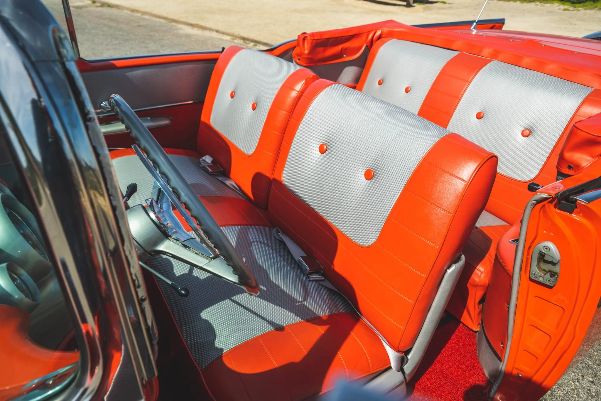 Bill Jones a dit : “Le top des options de cette Chevy Bel Air est l’injection de carburant Rochester d’origine, car elle en fait l’une des six 1957 fabriquées avec cette combinaison de couleurs et d’options, ’il est extrêmement rare d’en trouver une”... Ce cabriolet Chevrolet Bel Air de 1957 est propulsé par un V8 283ci injection Rochester, couplé à une transmission manuelle à trois vitesses à commande sur la colonne de direction. La voiture est finie en rouge “Matador” sur un intérieur bicolore rouge et argent et dispose d’une capote décapotable blanche.