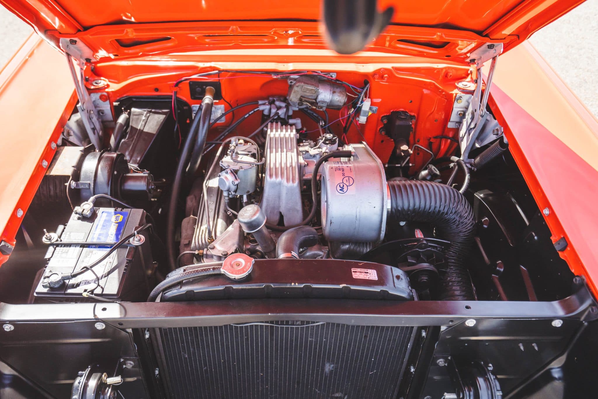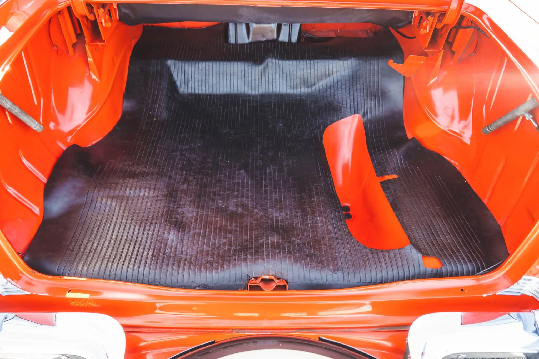 L’équipement supplémentaire comprend des roues en acier de 14 pouces, des jupes d’ailes arrière, un kit Continental, un chauffage et une radio AM à boutons-poussoirs, deux coupe-vent montés sur le capot, des chevrons d’aile avant et les emblèmes indiquant l’injection. Diverses garnitures sont anodisées/dorées. Des inserts d’ailettes arrière en aluminium nervuré et des jupes d’ailes arrière couleur carrosserie sont des éléments également très rares. Les jantes en acier de 14po couleur carrosserie portent des enjoliveurs avec des faux spinners et sont montées avec des pneus Firestone Deluxe.