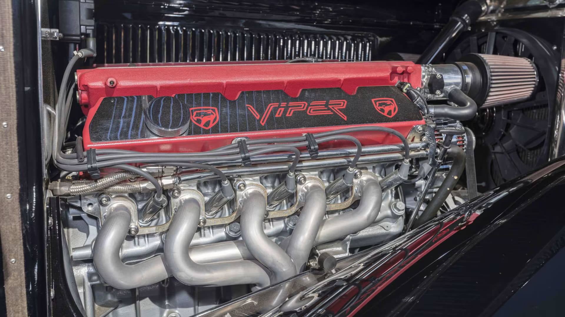 Il met en valeur sa vaste carrosserie et son élégante peinture noire. La plus grande surprise se trouve à l’intérieur du capot long et bas ; là où autrefois le premier et le plus gros 8 cylindres en ligne de Chrysler ronronnait, il y a maintenant un nouveau V-10 Dodge Viper de 8,0 L/540cv à injection.