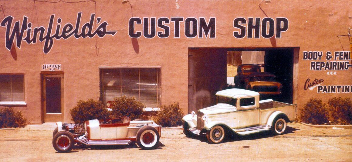 C’est en effet ici qu’avait été créé la technique de mélange de peinture couleur bonbon “Winfield-Fade” qui avait rendu Gene Winfield célèbre. Le “Winfield-Fade” faisait sensation en 1960 lorsque Gene Winfield impressionnait la scène des voitures personnalisées avec la fameuse “Jade-Idol”, une Mercury de 1956 étirée et évasée, portant des nuances “feuillues” superbement mélangées, comme le seront par copie les Chrysler Forward-Look de 1957 de Virgil Exner… Autre fin d’une époque…