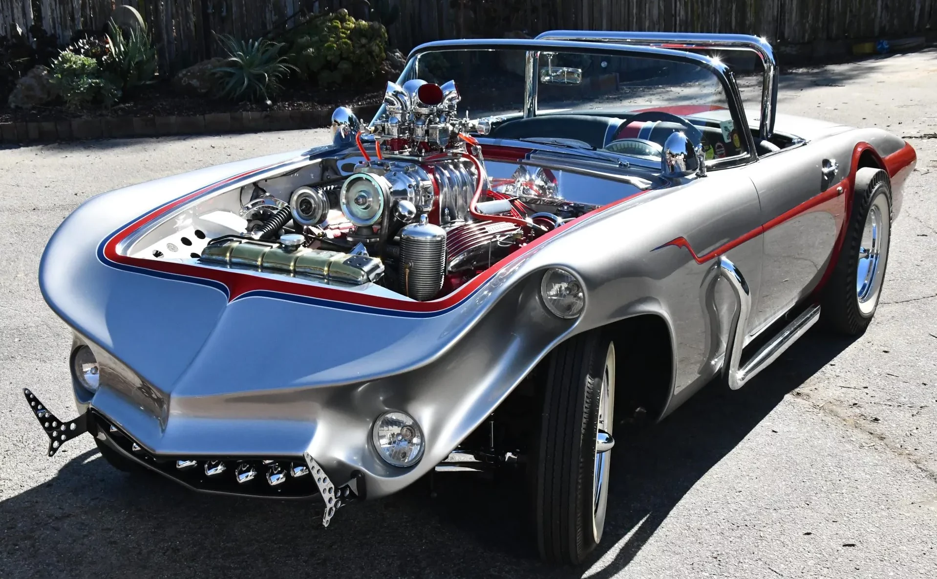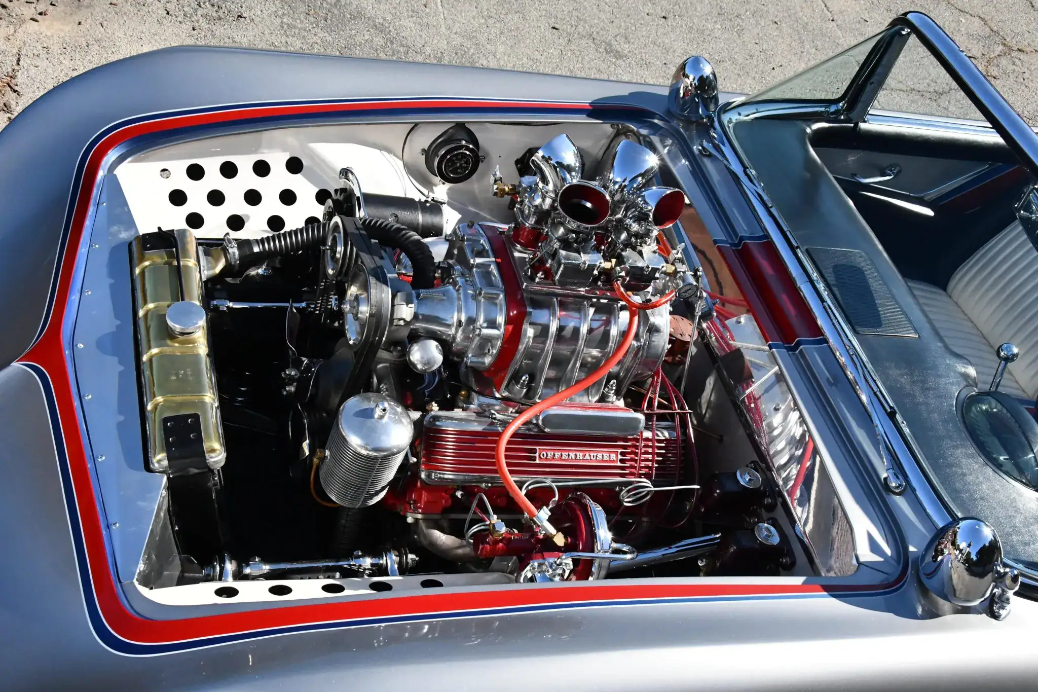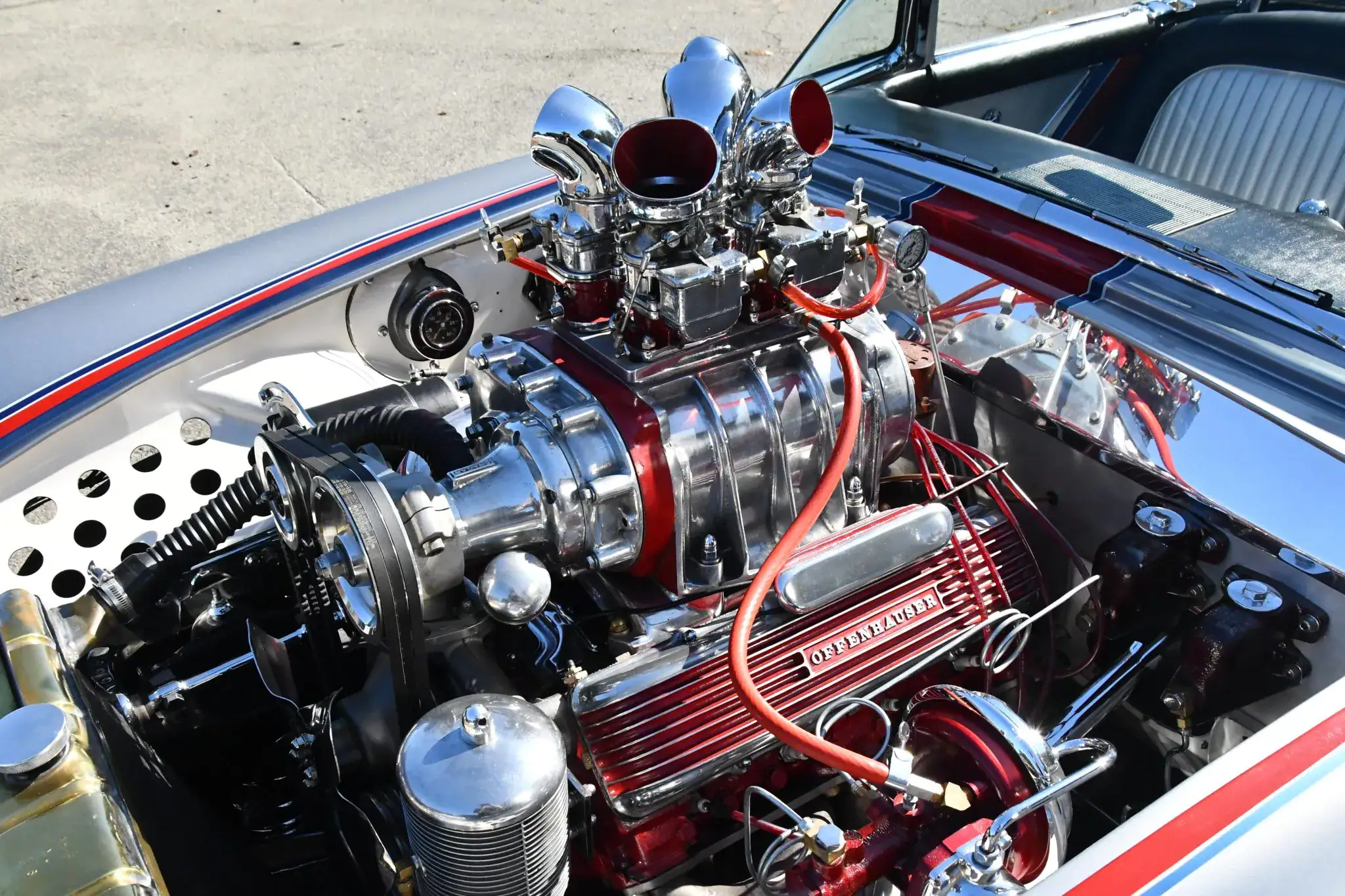 Il est équipé de cache-culbuteurs à ailettes “Offenhauser”, de culasses Cadillac de 1956, de pistons “ForgedTrue”, de bielles renforcées, d’un arbre à cames à rouleaux “Herbert”, d’un allumage par magnéto “Joe Hunt Vertex”, de poulies sur mesure et d’un collecteur d’admission “Cragar”. L’admission est assurée par quatre carburateurs “Stromberg” chromés, surmontant un compresseur “GMC 4-71” récupéré d’un bus Greyhound dans les années 1950.