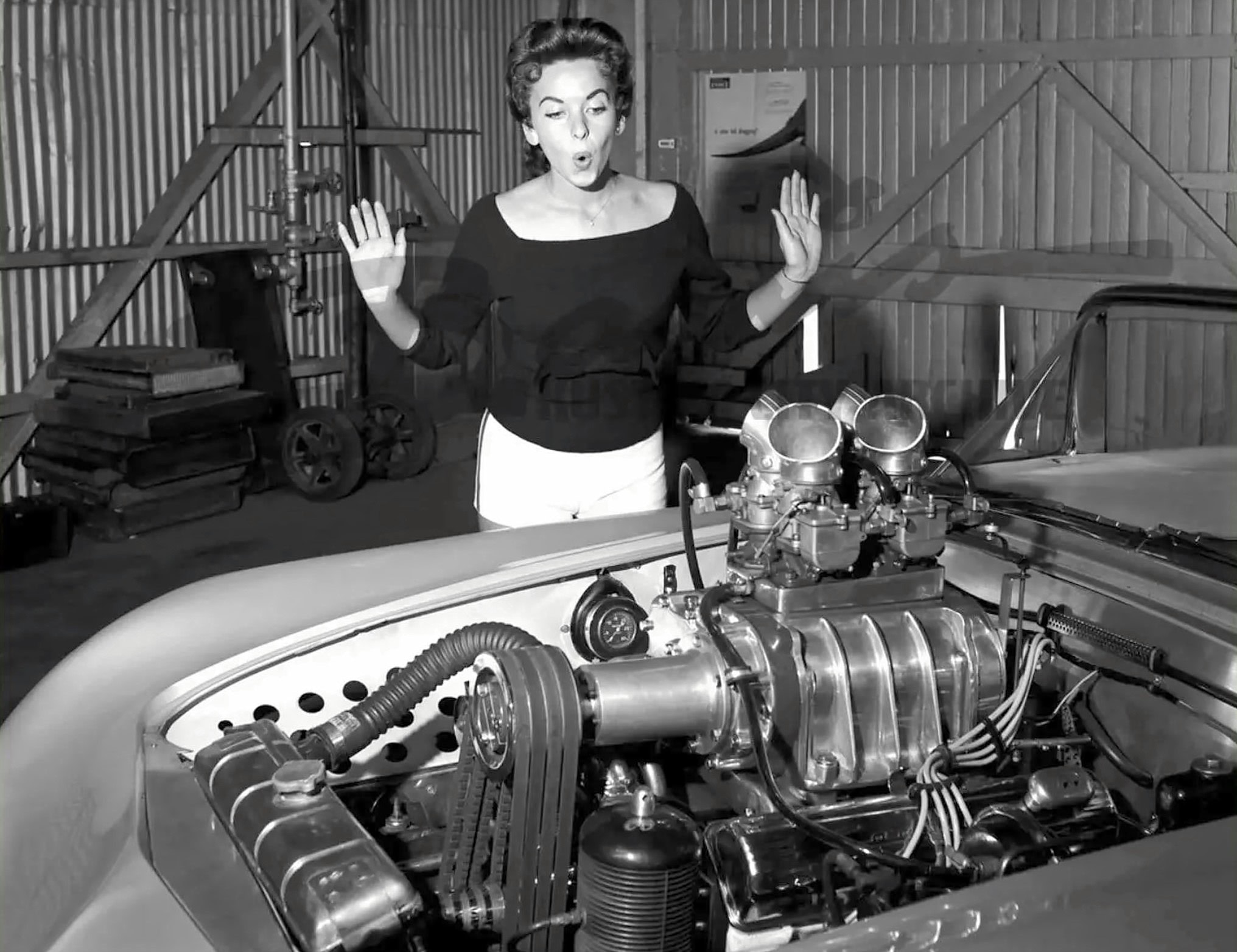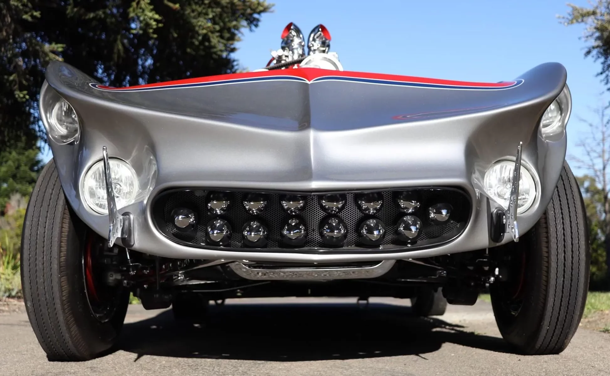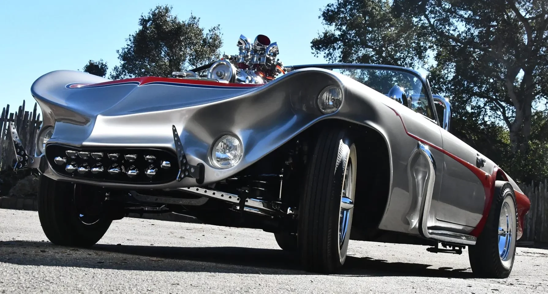 Il est équipé de cache-culbuteurs à ailettes “Offenhauser”, de culasses Cadillac de 1956, de pistons “ForgedTrue”, de bielles renforcées, d’un arbre à cames à rouleaux “Herbert”, d’un allumage par magnéto “Joe Hunt Vertex”, de poulies sur mesure et d’un collecteur d’admission “Cragar”. L’admission est assurée par quatre carburateurs “Stromberg” chromés, surmontant un compresseur “GMC 4-71” récupéré d’un bus Greyhound dans les années 1950.