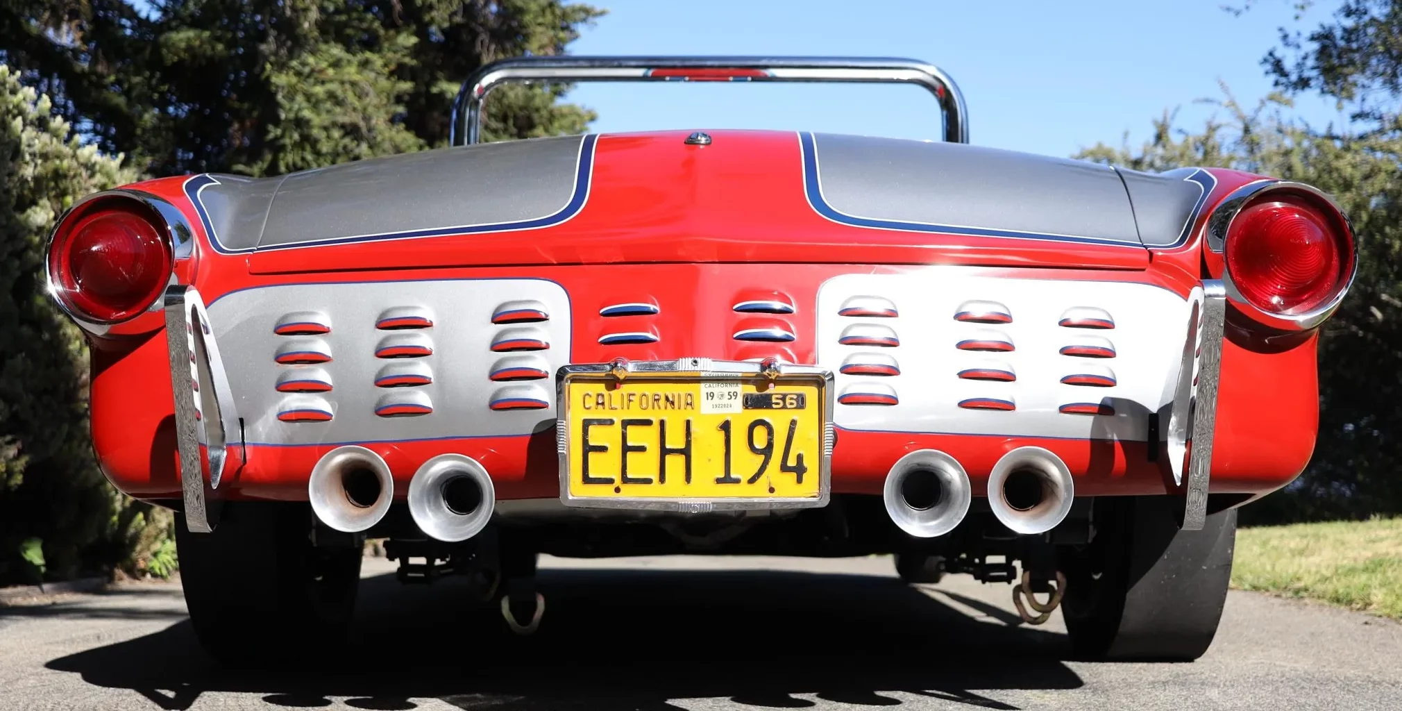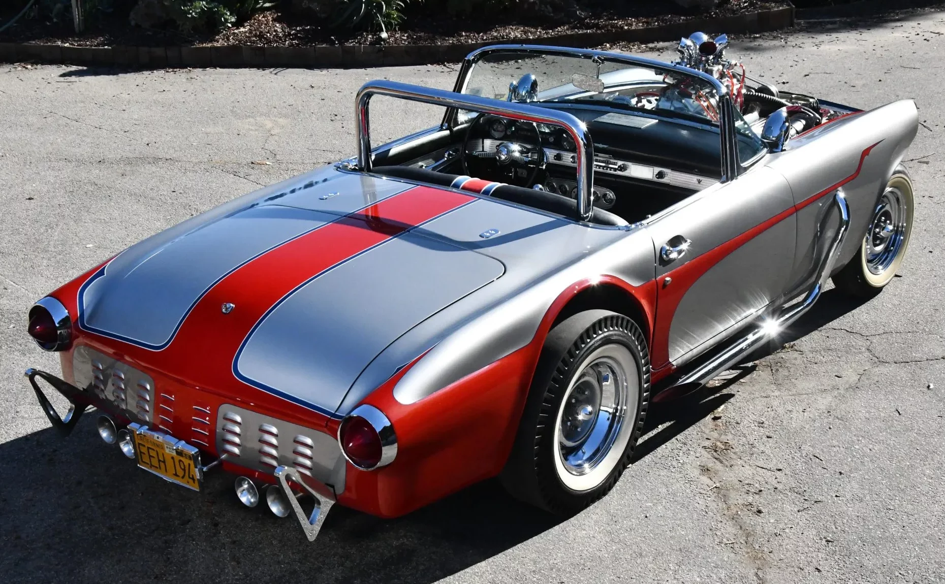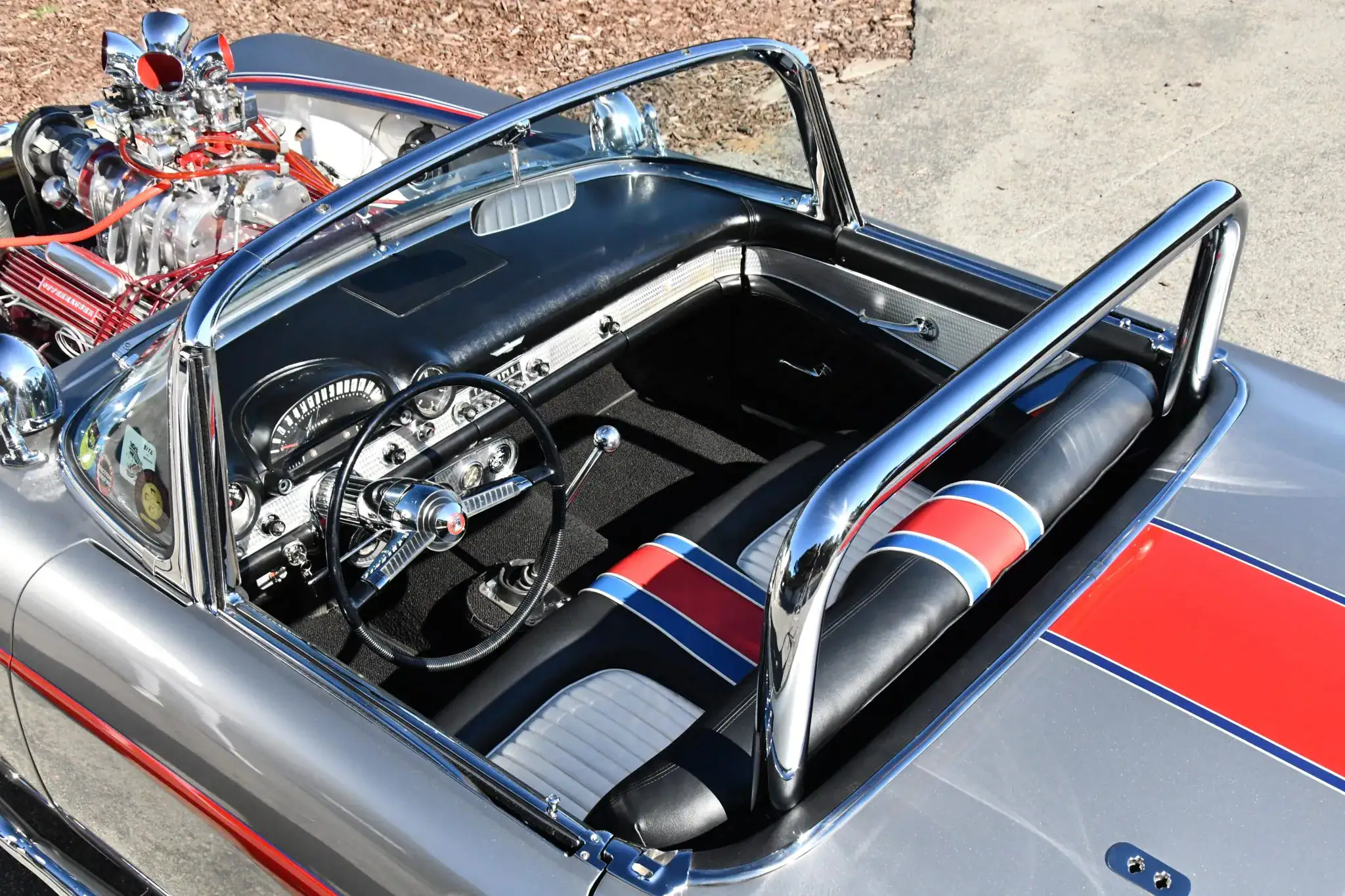 L’équipement supplémentaire comprend des phares additionnels doubles, des échappements latéraux, un arceau de sécurité, des feux arrière de Buick de 1959 et une admission Hilborn. La trappe à essence a été déplacée dans le coffre et la voiture est dépourvue de toit. Les jantes chromées de 15 pouces à largeurs différentes AV et AR sont chaussées de pneus BFGoodrich Silvertown à flancs blancs AV et de Bruce’s Slicks à flancs blancs AR.
