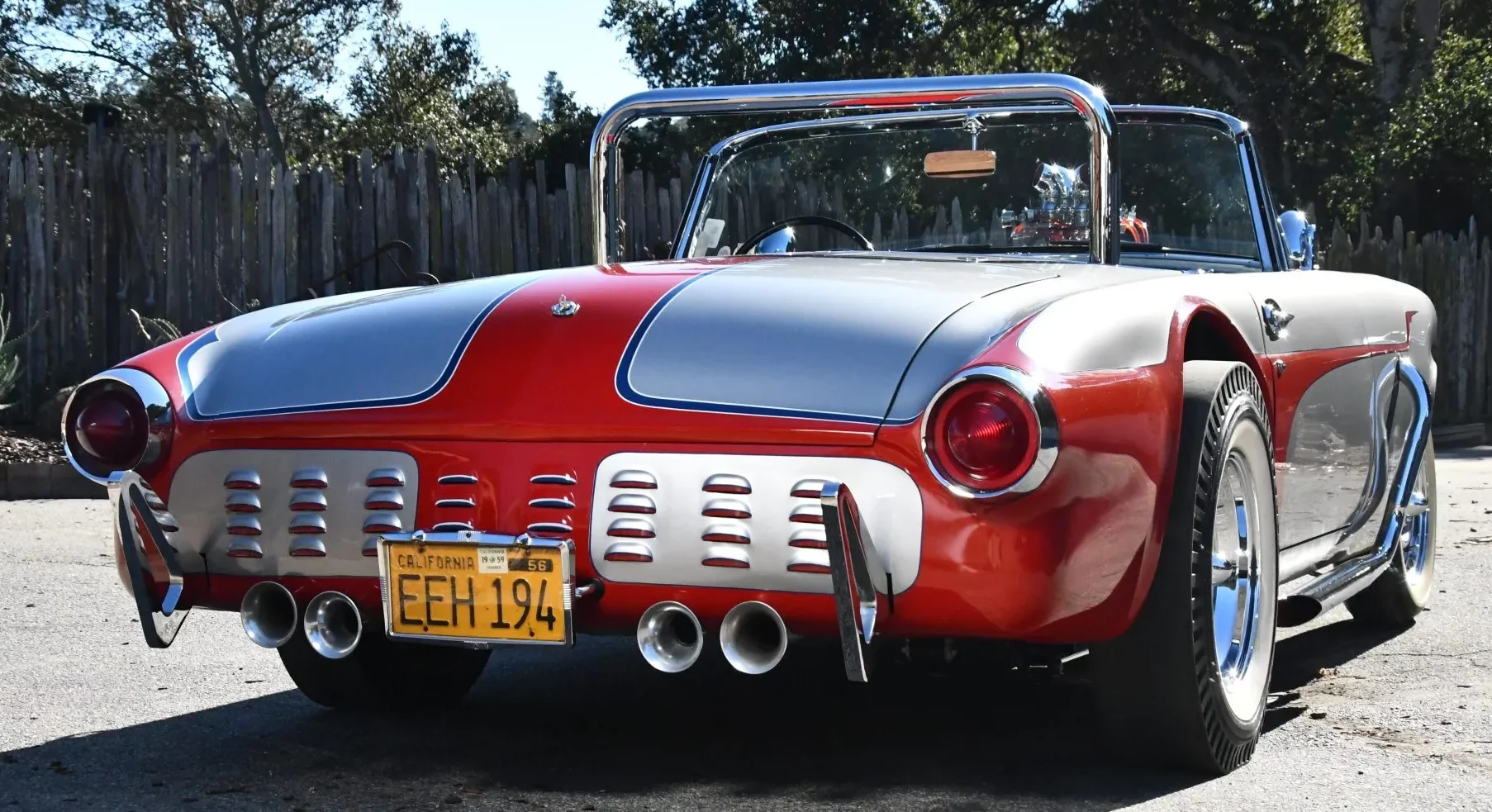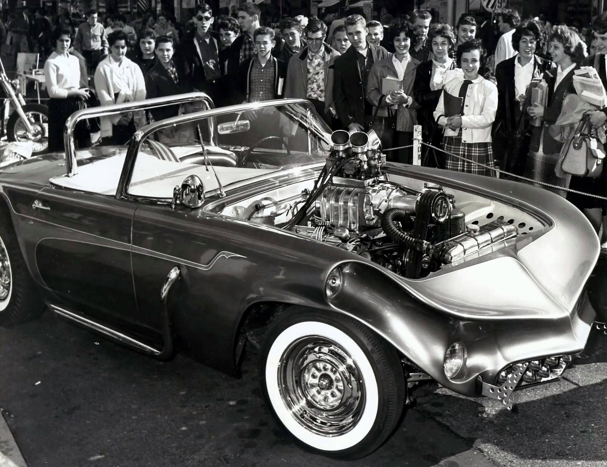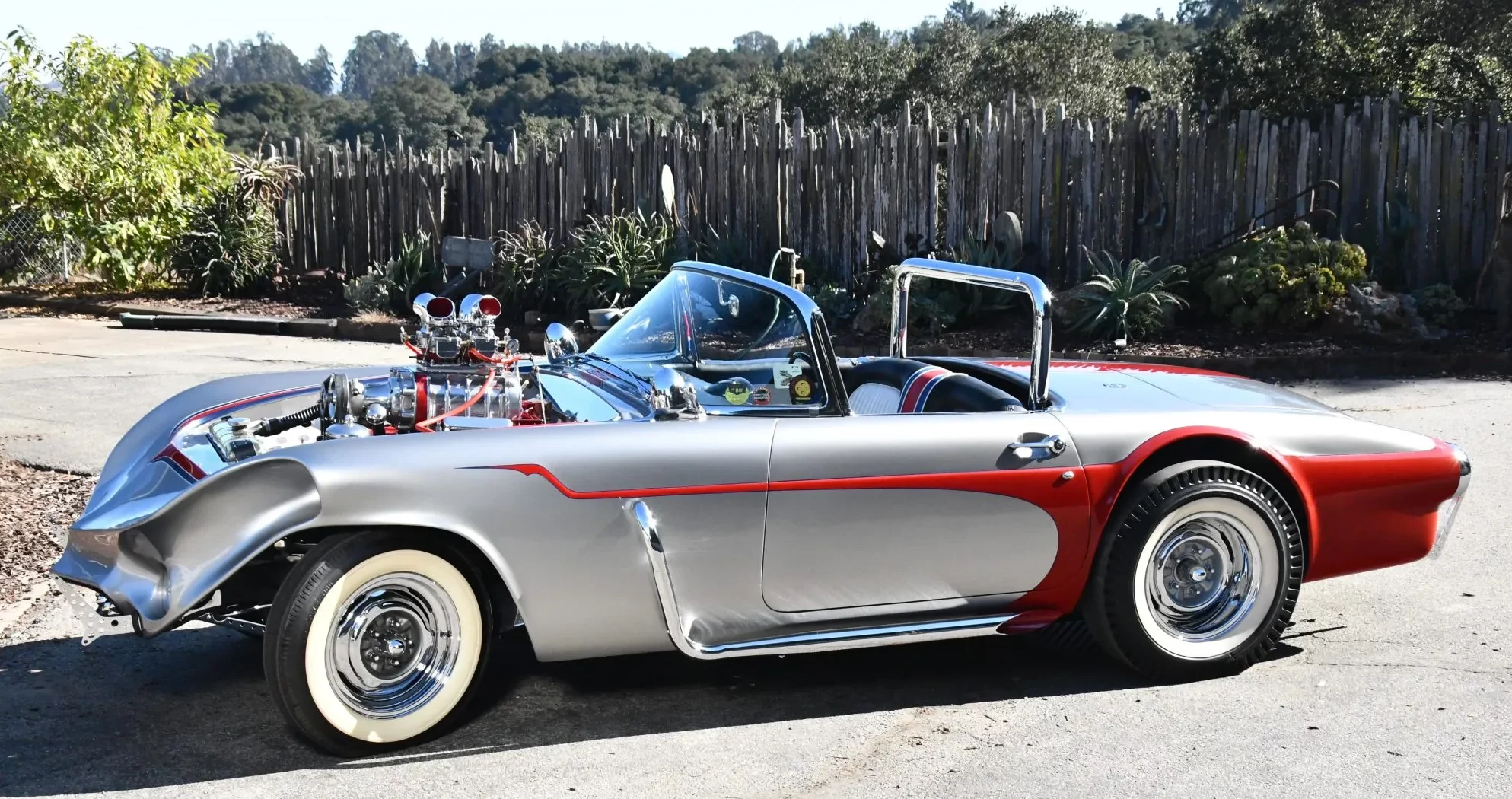 L’équipement supplémentaire comprend des phares additionnels doubles, des échappements latéraux, un arceau de sécurité, des feux arrière de Buick de 1959 et une admission Hilborn. La trappe à essence a été déplacée dans le coffre et la voiture est dépourvue de toit. Les jantes chromées de 15 pouces à largeurs différentes AV et AR sont chaussées de pneus BFGoodrich Silvertown à flancs blancs AV et de Bruce’s Slicks à flancs blancs AR.