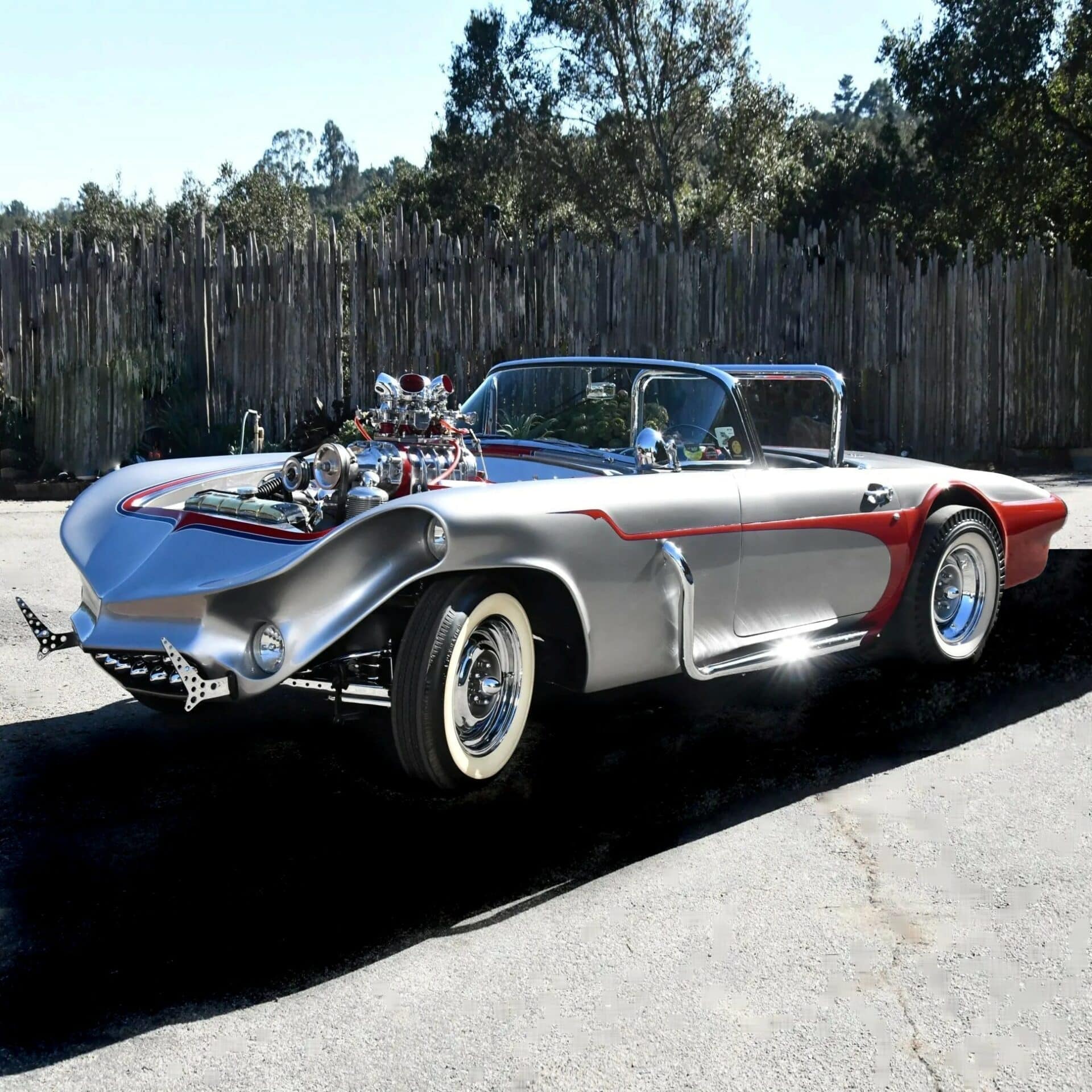 La voiture est maintenant peinte en argent et rouge avec une sellerie noire et blanche. La puissance provient d’un V8 Cadillac 5L4 litres (331ci) suralimenté par un compresseur GMC et quatre carburateurs Stromberg, couplé à une boîte de vitesses manuelle à trois rapports d’origine LaSalle, cet équipement comprenant un levier de vitesses de Corvette C1.