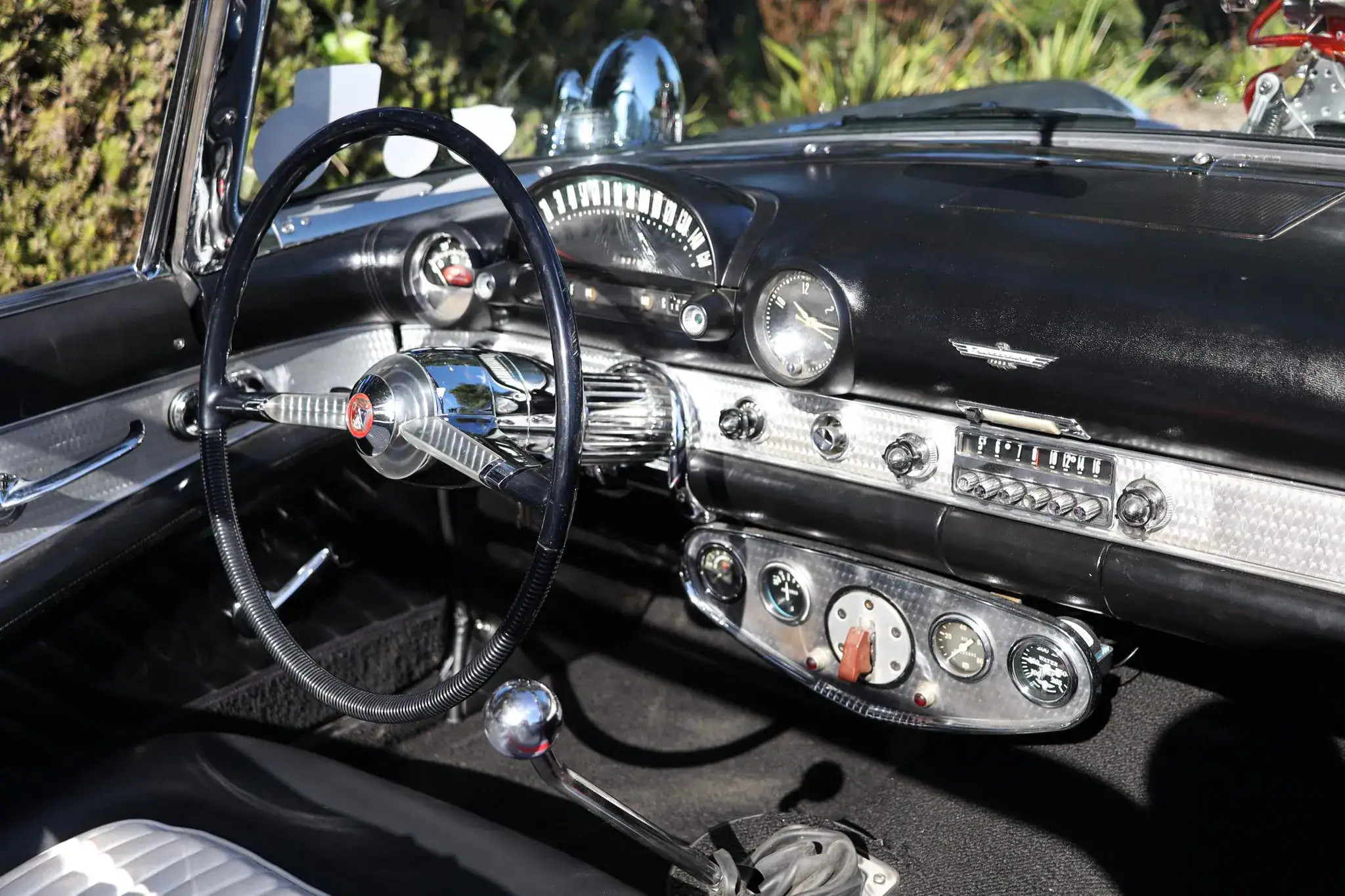 Lors de la restauration, la banquette avant à réglage électrique quatre positions a été regarnie de tissu noir avec des empiècements plissés blancs et des touches de bleu et de rouge. Ce même tissu se retrouve sur les panneaux de porte, et une planche de bord noire a été installée, assortie à la moquette. Le tableau de bord conserve sa radio AM Ford à boutons-poussoirs, son horloge, sa boîte à gants verrouillable et ses garnitures guillochées.