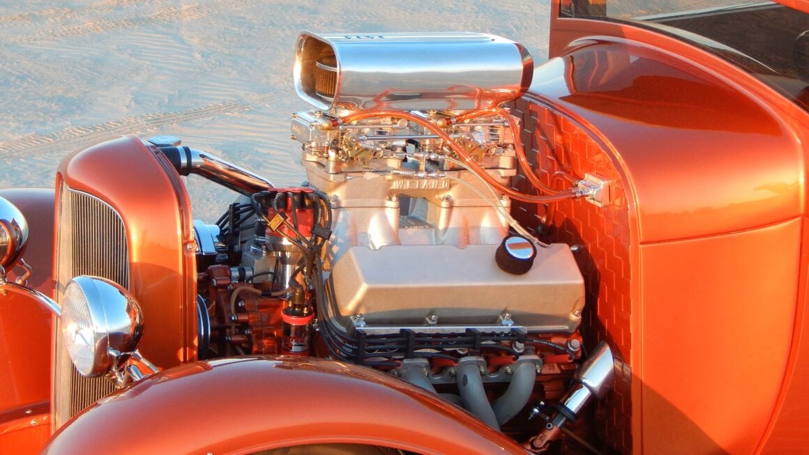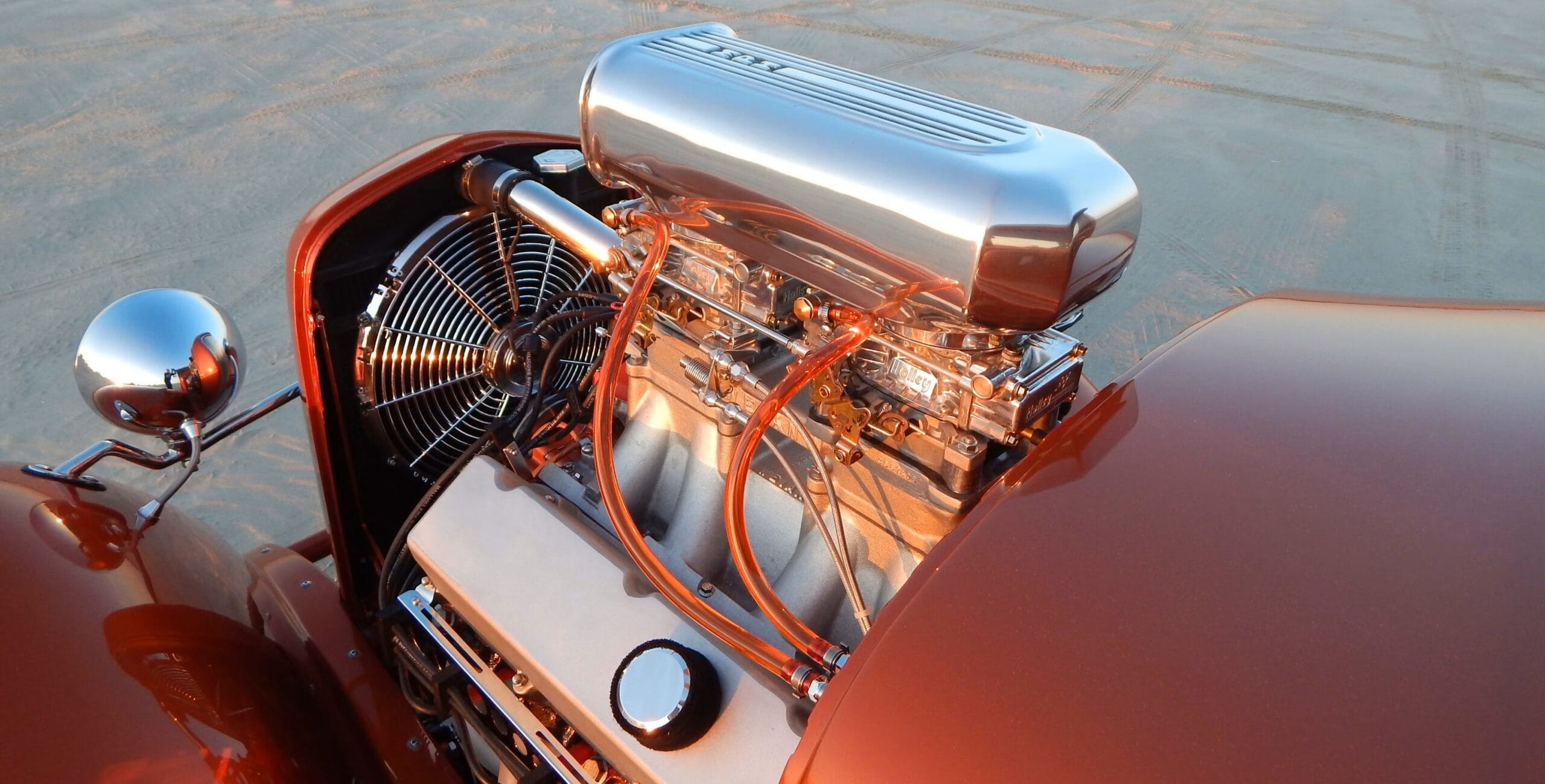 L’essieu arrière Ford 9 pouces renforcé fut choisi pour son esthétique et sa robustesse, car une puissance importante était attendue ; cependant, il dut être raccourci pour s’intégrer aux ailes. Un jeu d’arbres de transmission sur mesure de chez Currie Enterprises compléta la transformation de l’essieu arrière. Un essieu avant Magnum à poutre en I assure la traction. La traverse du ressort à lames fut avancée de 3,8 cm (1-1/2 pouce) afin que les roues s’insèrent parfaitement dans le rayon des ailes. Une colonne de direction inclinable a été reliée à un kit crémaillère Unisteer. Des jantes à cinq branches complètent le châssis roulant. Le moteur Ford V8 à Big bloc provenait d’un ami qui le conservait depuis des années. Ancien compétiteur de tracteurs-pulling, il possédait ce moteur de rechange. Il était évident qu’il nécessitait une remise à neuf complète et l’installation de pièces performantes.
