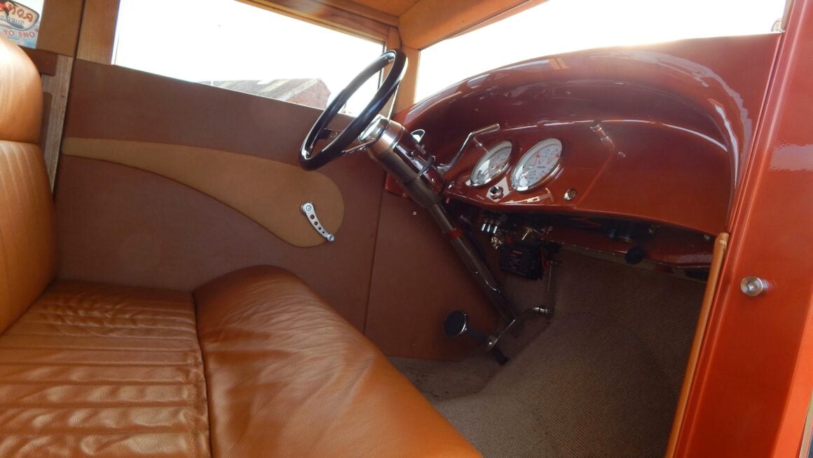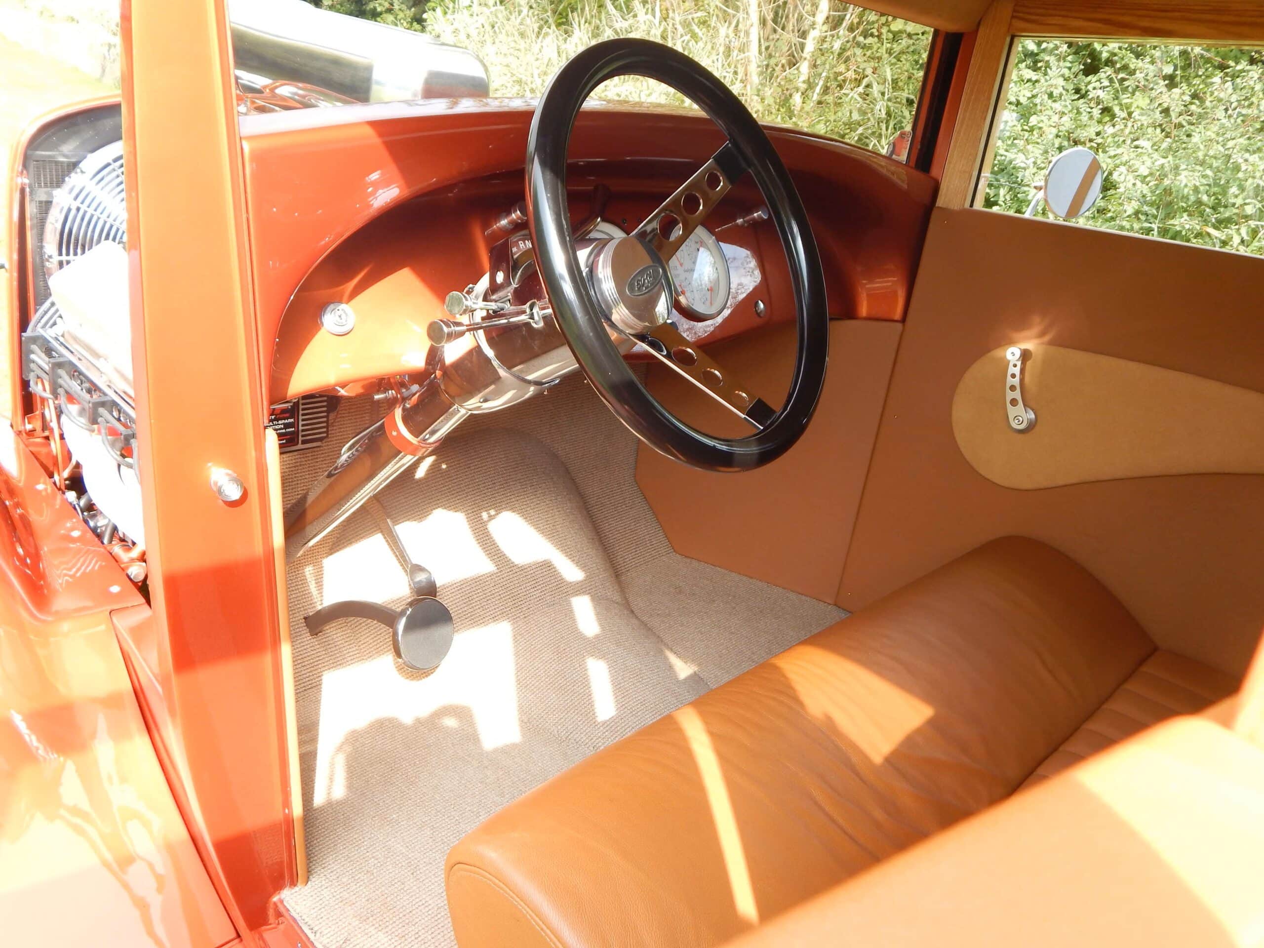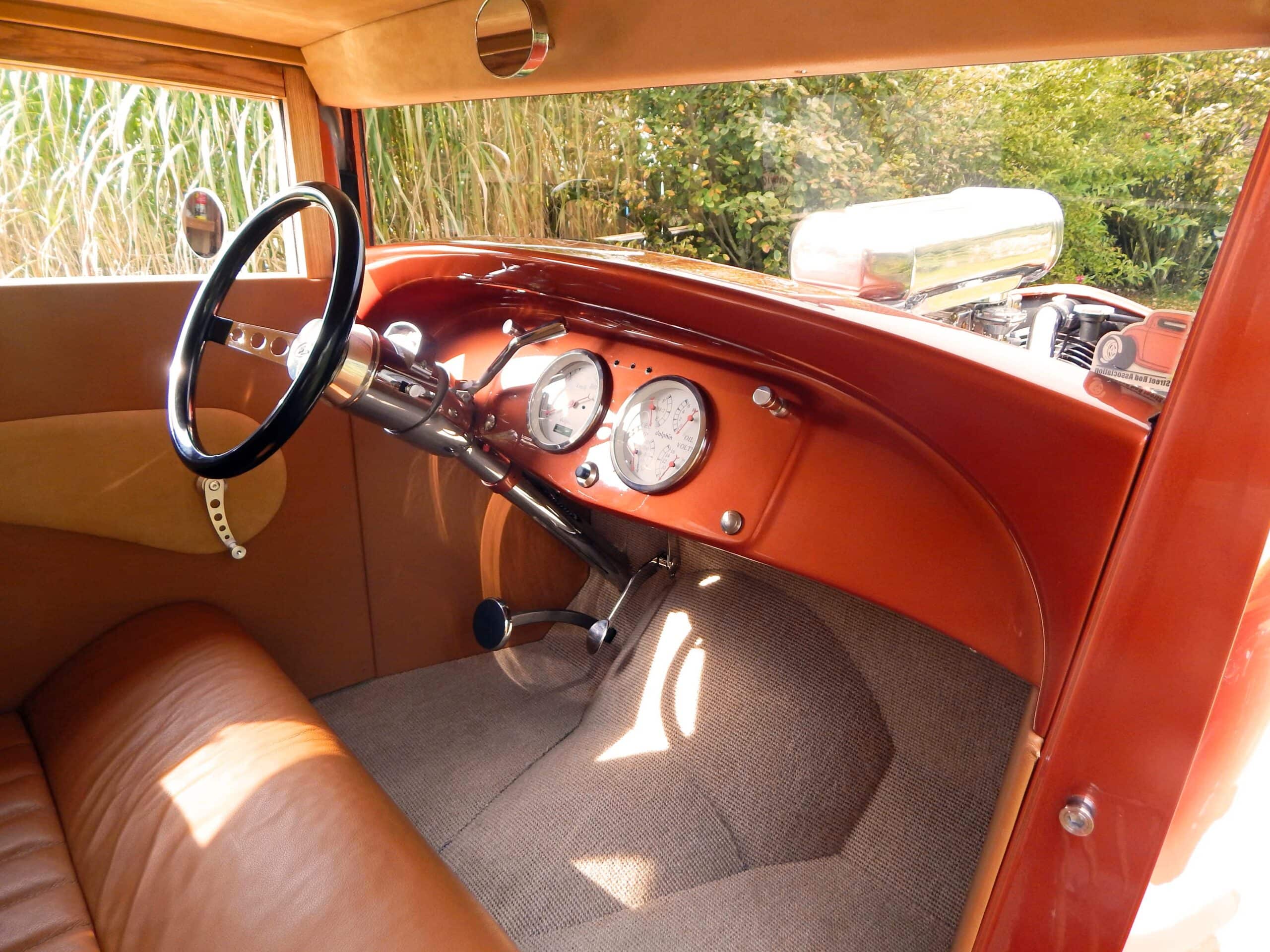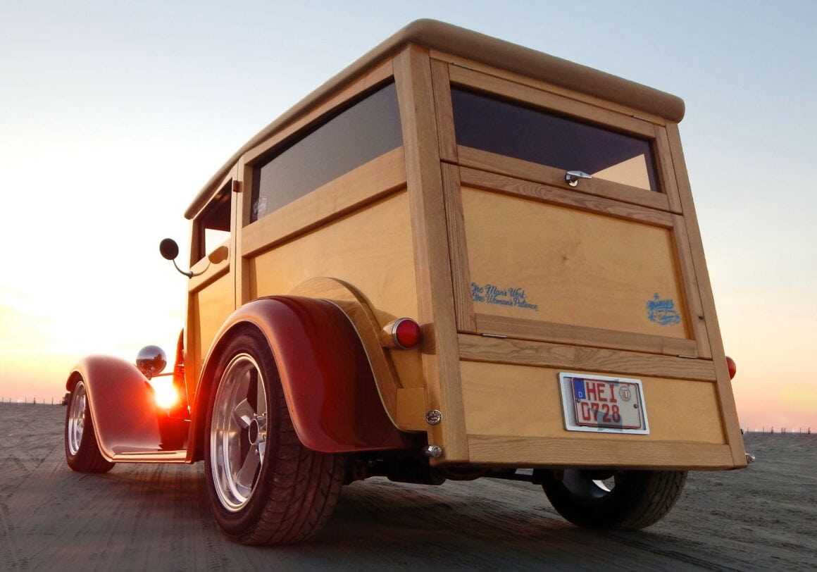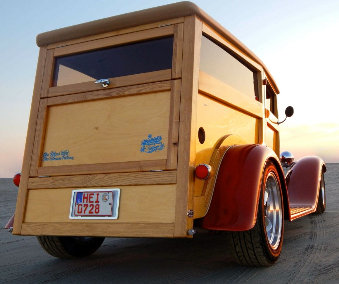 Les sièges ont été professionnellement rembourrés en cuir brun clair. Les panneaux de porte et de flancs, ainsi que le toit, ont été recouverts de cuir d’une couleur correspondante. Lorsque la voiture a été achevée en 2014, l’objectif était de la présenter aux “European Chrom Und Flamen Street Rod” à Bernkastel-Kues. Un court trajet sur l’autoroute a donné la confiance nécessaire pour commencer le trajet de 650 km le lendemain. La voiture a rencontré un grand succès tout le week-end et a reçu un trophée de 1er prix parmi les cinq meilleures voitures participant au salon. Beaucoup de temps et d’argent ont été consacrés à la création du Woody, mais en conséquence, ce rêve issu de l’imagination de Uwe Grunzke, descendant du célèbre général de la Waffen SS Das Reich est devenu réalité. Les émetteurs et jauges de carburant devaient avoir des taux de résistance correspondants.