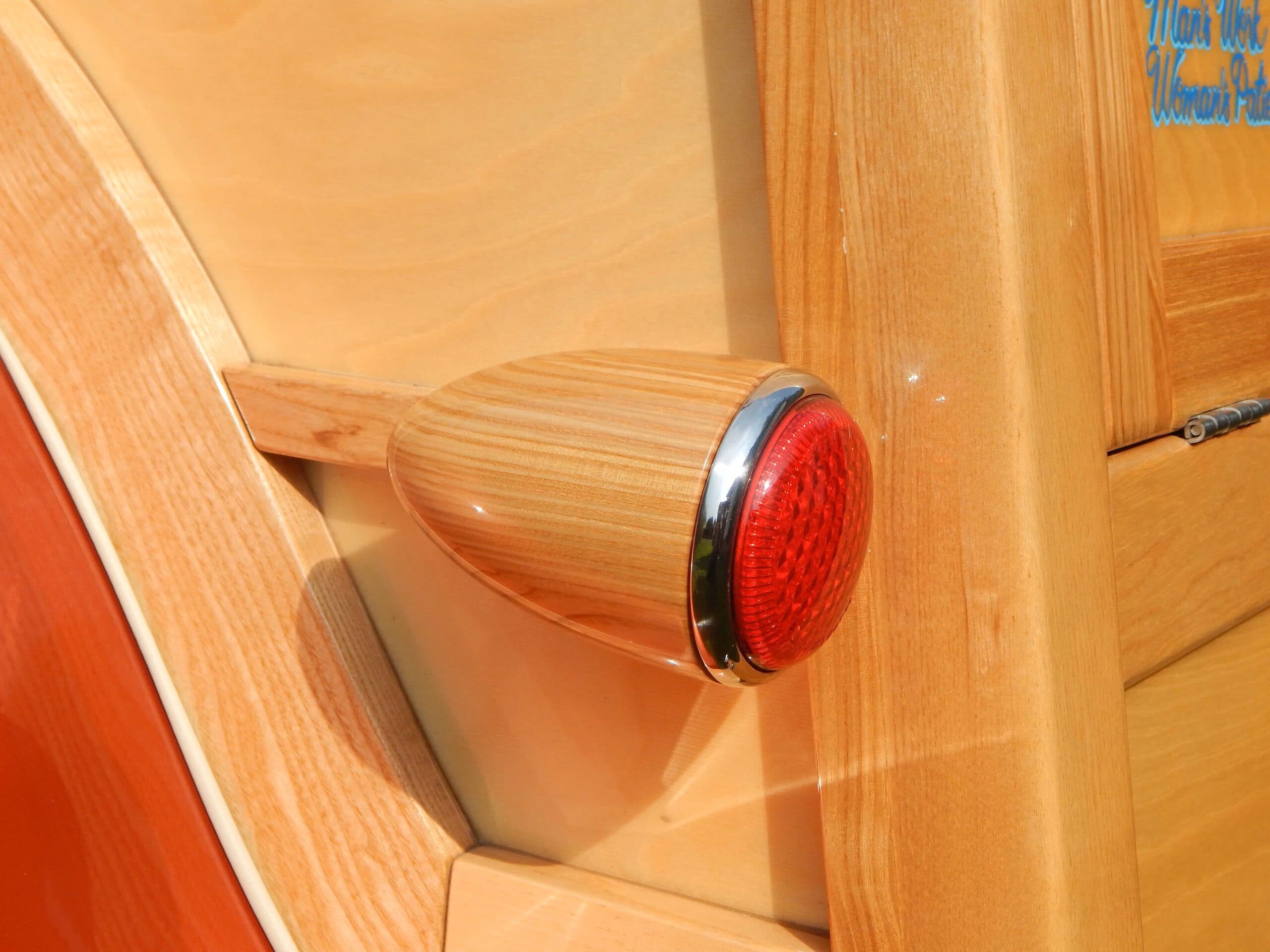 Mais certaines petites pièces détachées du boîtier portaient des traces d’usure importantes, témoignant des conditions difficiles rencontrées lors des compétitions de tracteurs. Il devint évident que la boîte n’était pas fiable aux standards allemands, et une neuve fut commandée aux États-Unis. Un atelier spécialisé fabriqua et équilibra un arbre de transmission sur mesure : la dernière pièce nécessaire pour permettre au Woody de se déplacer par ses propres moyens. La peinture a été réalisée dans le même garage individuel que le reste de la construction. Plusieurs couches de base en cuivre à vernis scellés et un ponçage et un polissage intensifs ont donné la brillance finale. Herb Manfeld a ensuite ajouté des rayures et des lettres sur la carrosserie. Une maquette a été construite pour les sièges avant et arrière des banquettes. La banquette arrière est orientée vers l’arrière, ce qui permet un dossier fixe avant et arrière.