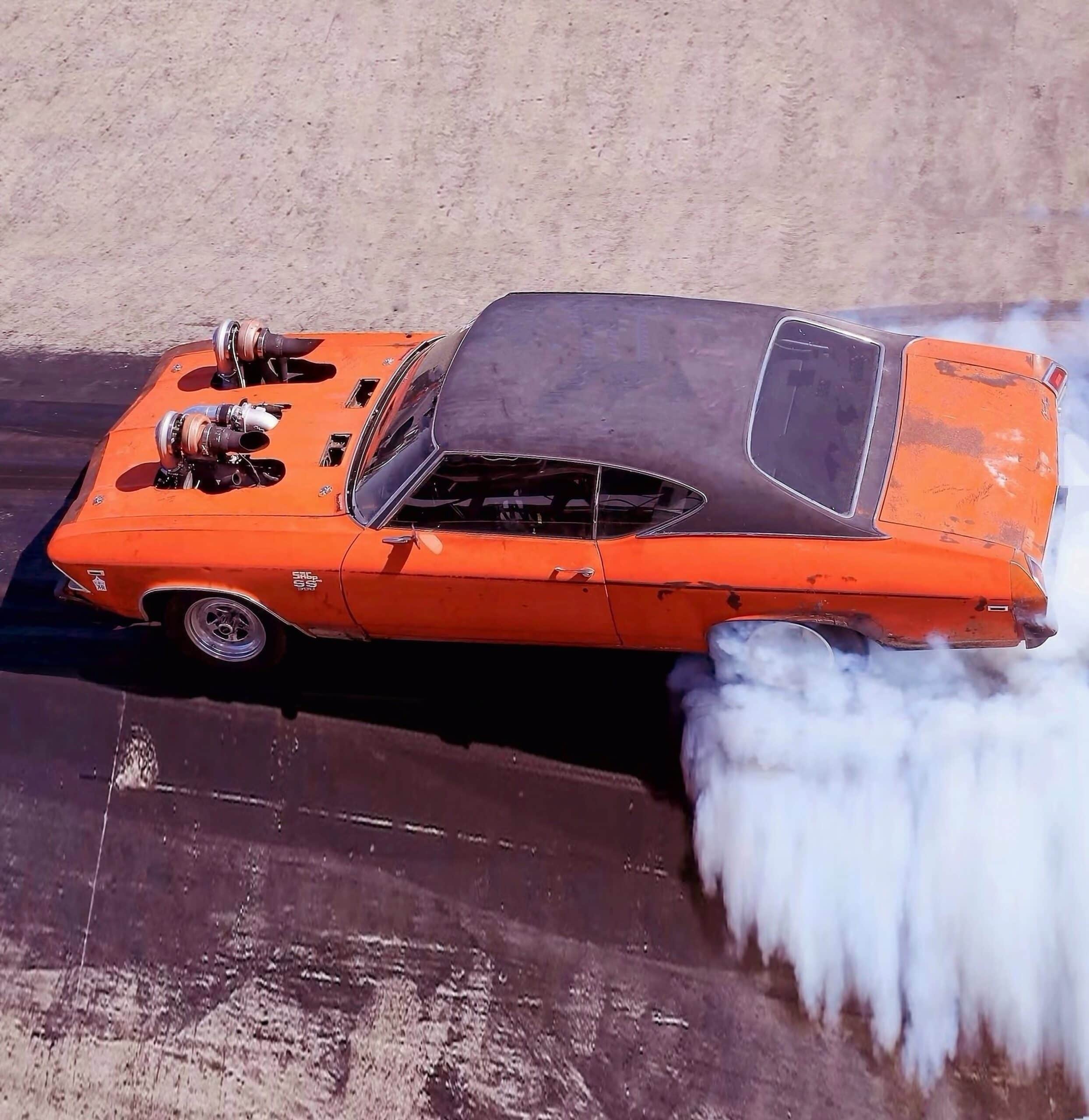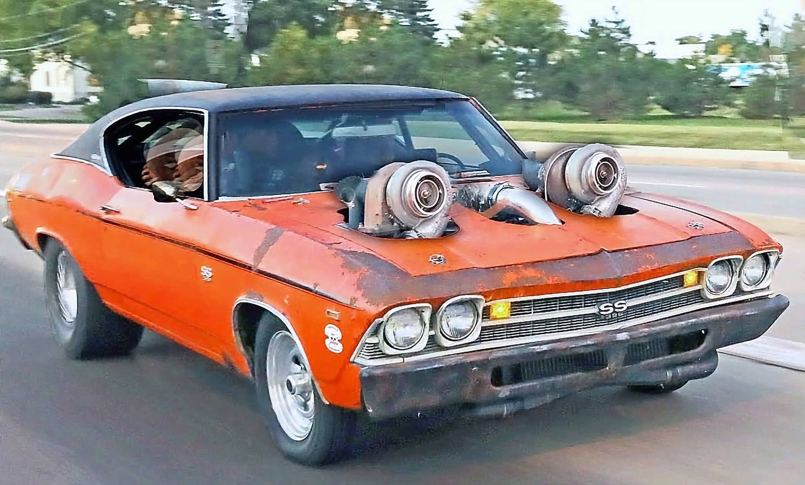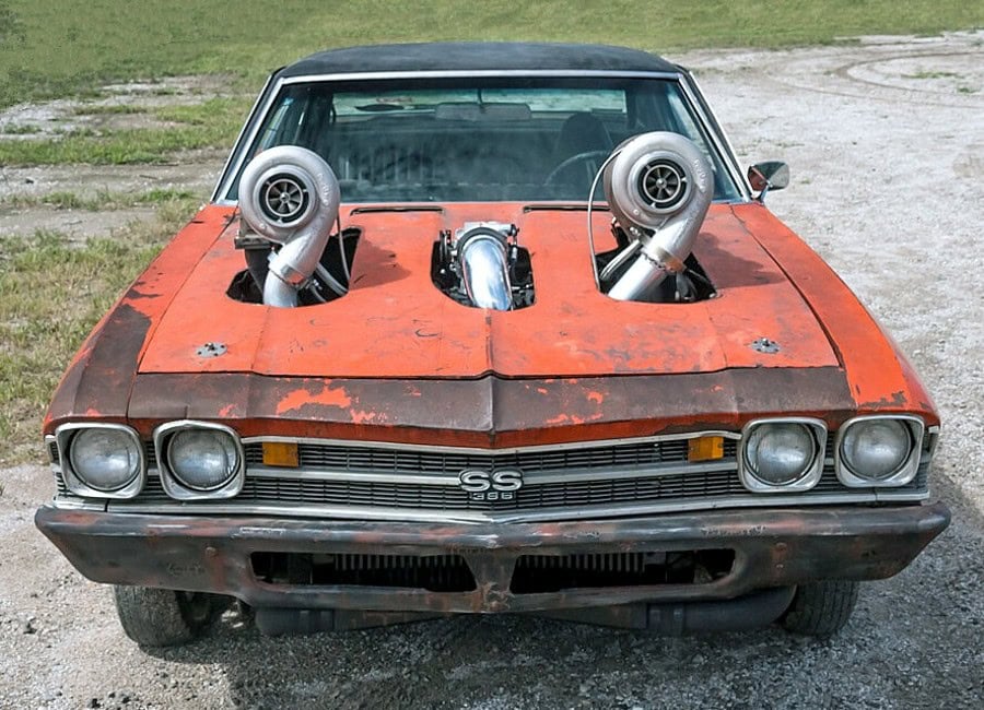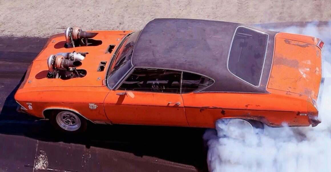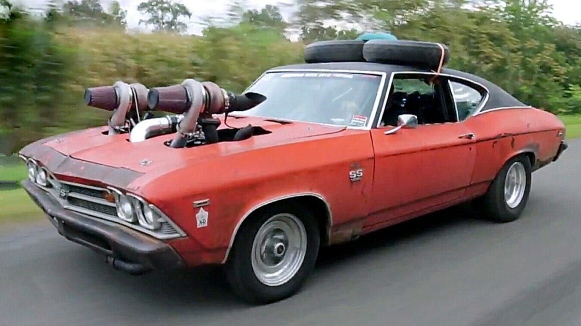 La Chevelle était équipée d’une cage de sécurité, d’un pont Ford 9 pouces et d’un gros bloc V8. De manière célèbre, cette Chevelle avait 2 turbos montés au-dessus du capot et, aussi farfelu que cela puisse paraître, la chose fonctionnait. Harry a également essayé de tuer ses occupants en faisant passer les tuyaux ses gaz d’échappement dans la zone des passagers qui ont évité ces problèmes en buvant la moitié de l’approvisionnement national de bières Corona-virus.