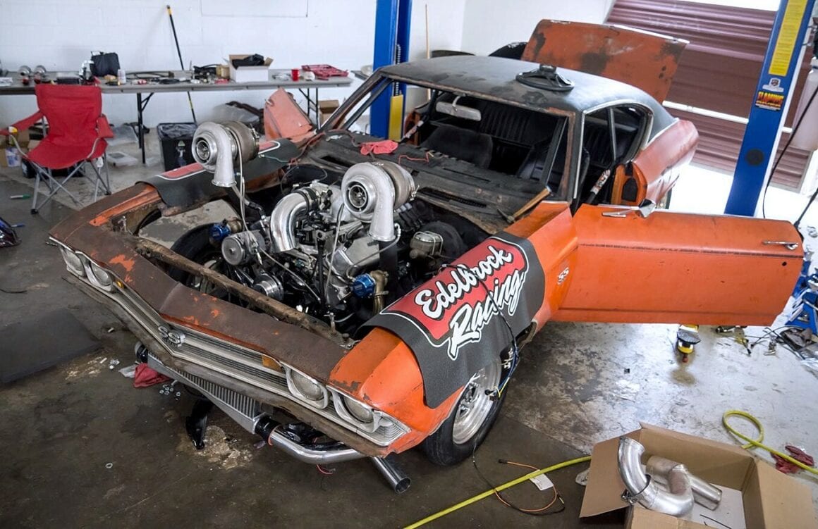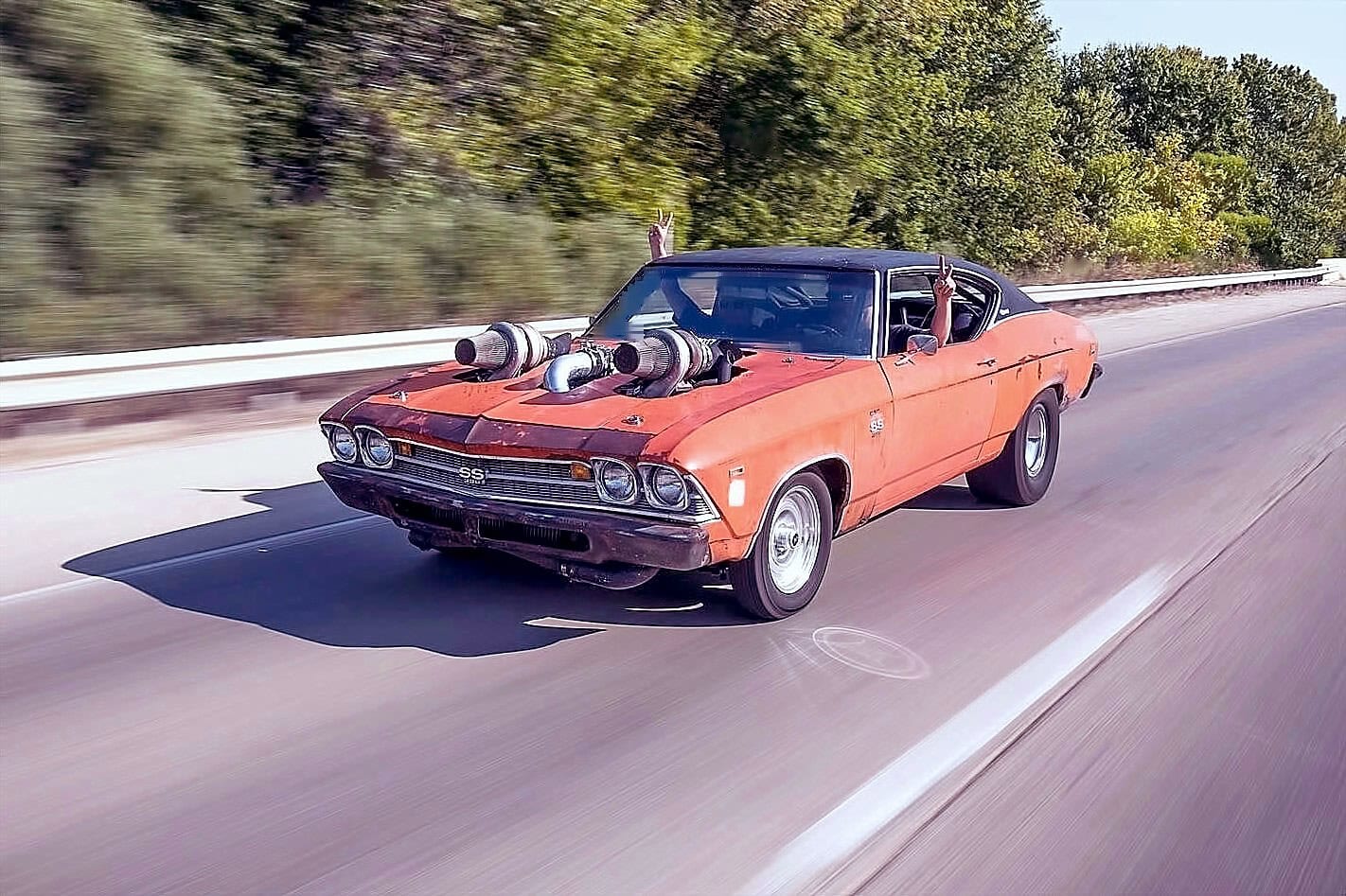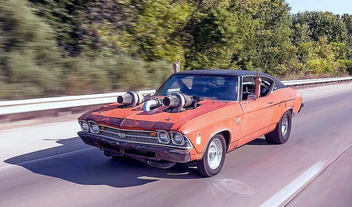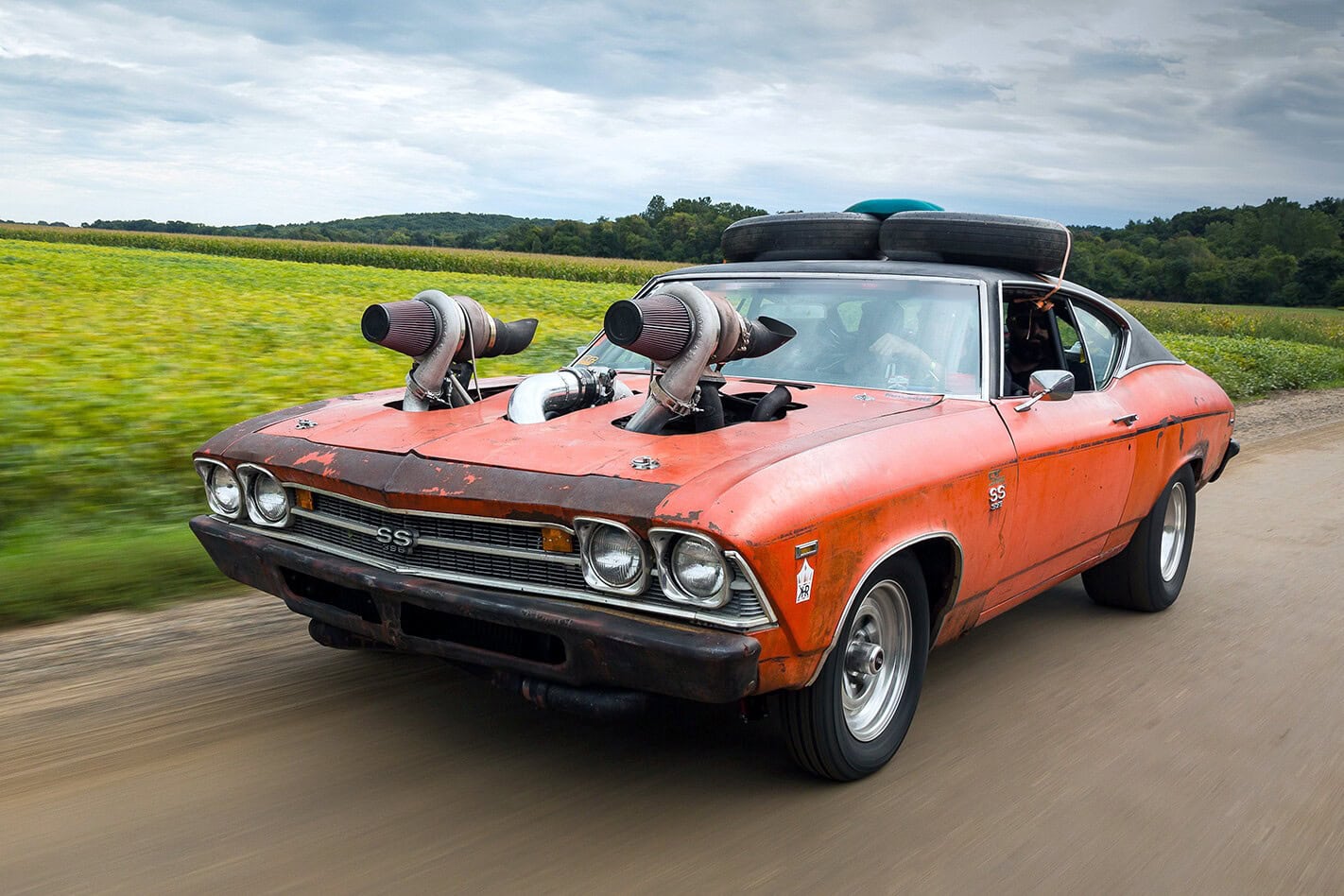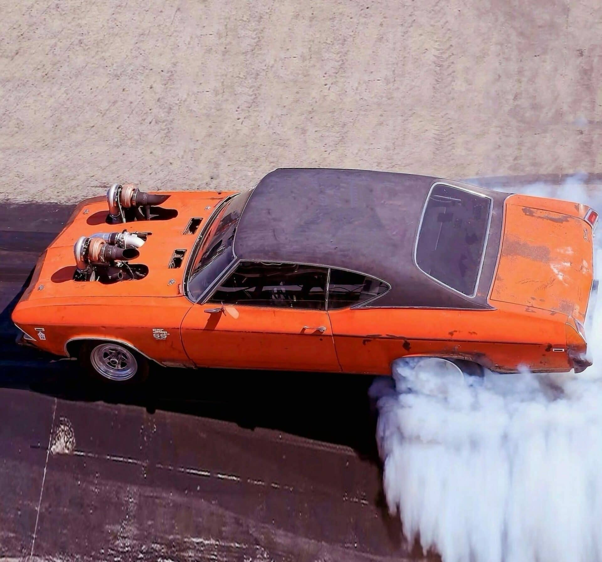La Chevelle était équipée d’une cage de sécurité, d’un pont Ford 9 pouces et d’un gros bloc V8. De manière célèbre, cette Chevelle avait 2 turbos montés au-dessus du capot et, aussi farfelu que cela puisse paraître, la chose fonctionnait. Harry a également essayé de tuer ses occupants en faisant passer les tuyaux ses gaz d’échappement dans la zone des passagers qui ont évité ces problèmes en buvant la moitié de l’approvisionnement national de bières Corona-virus.