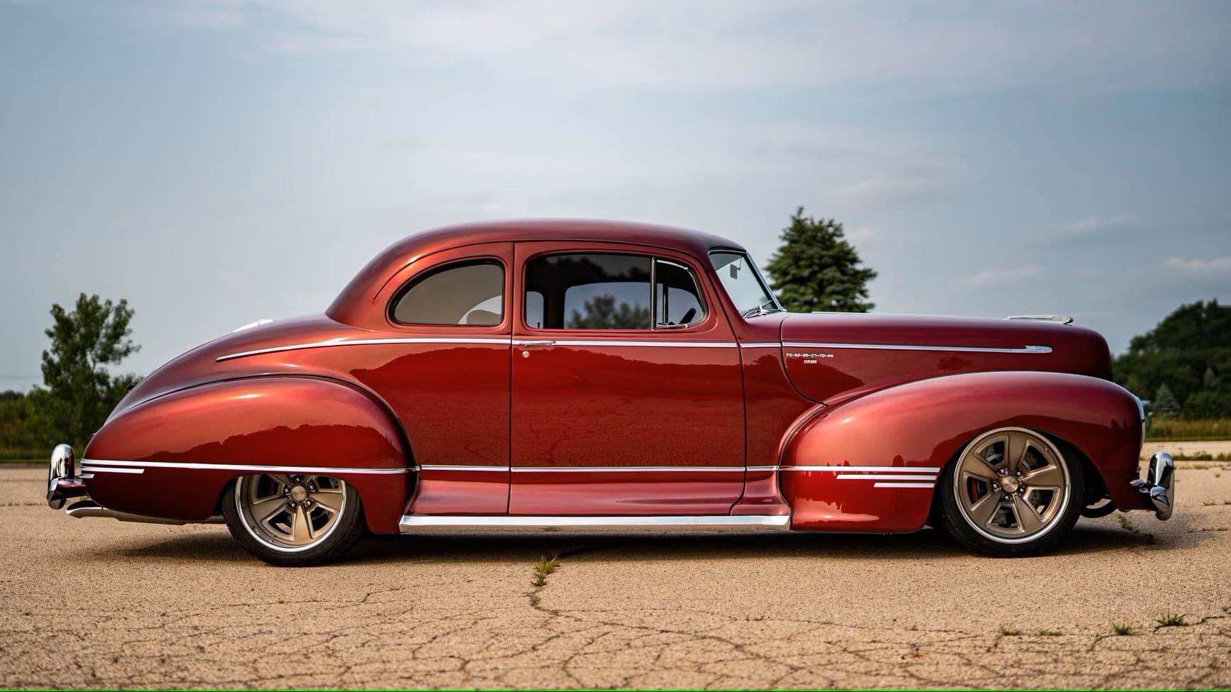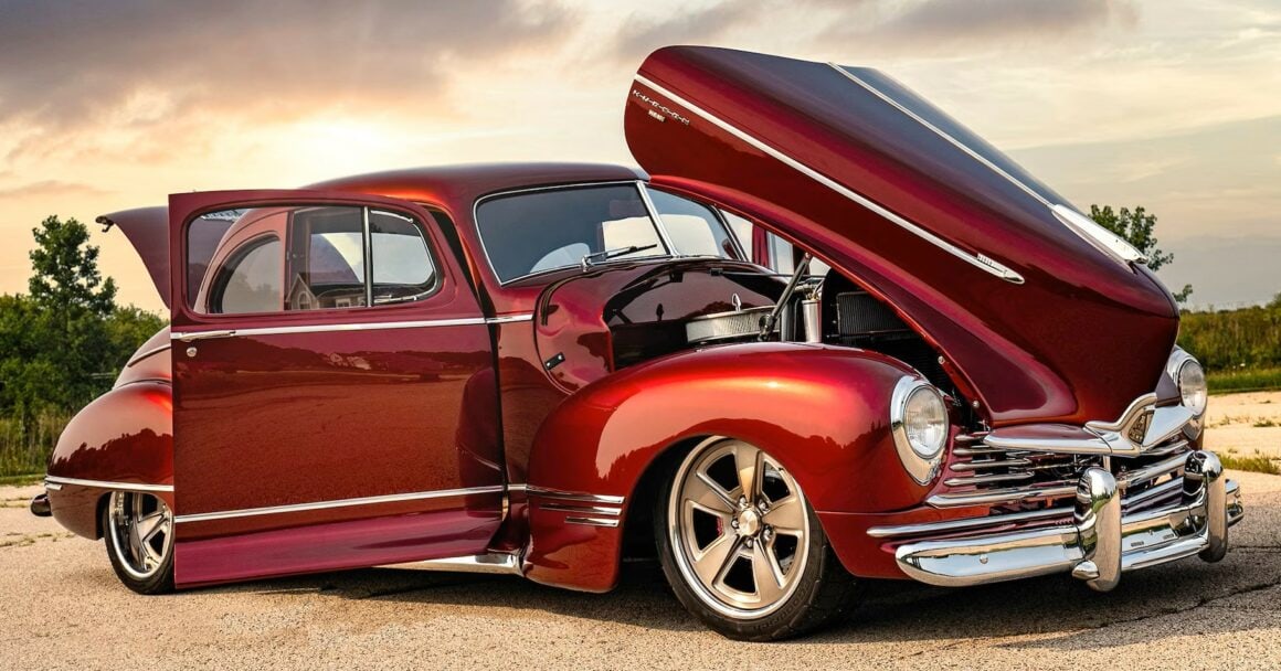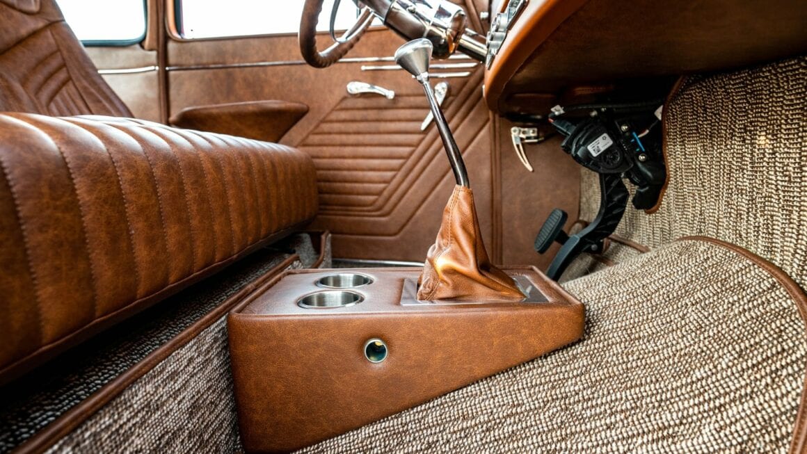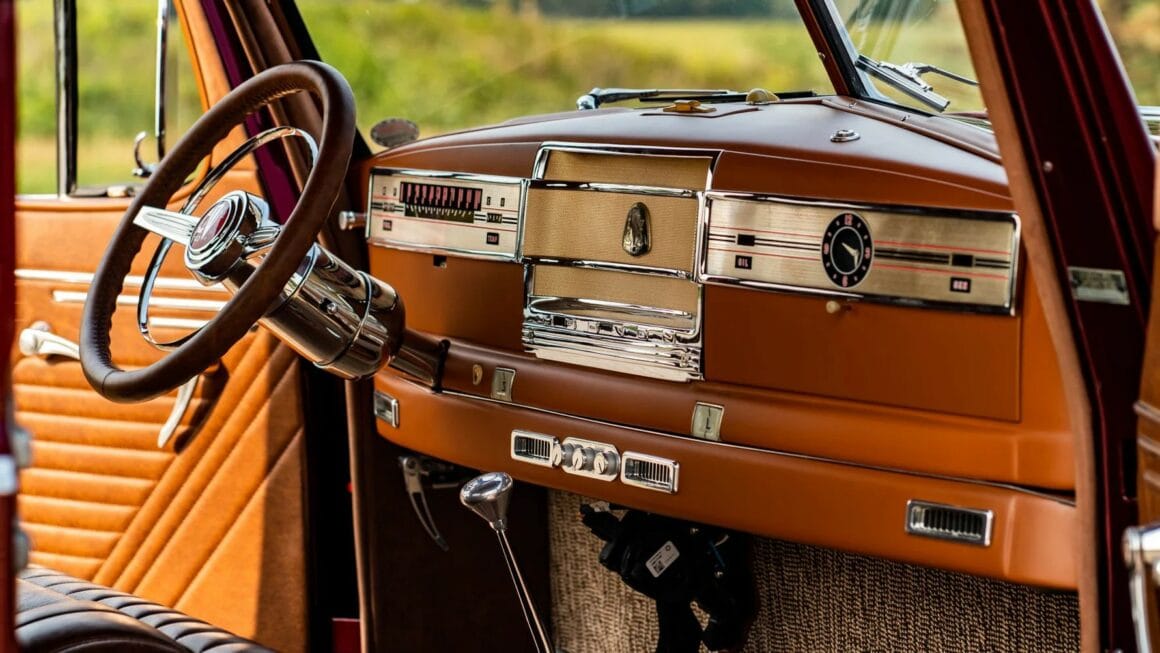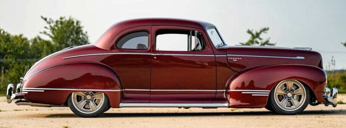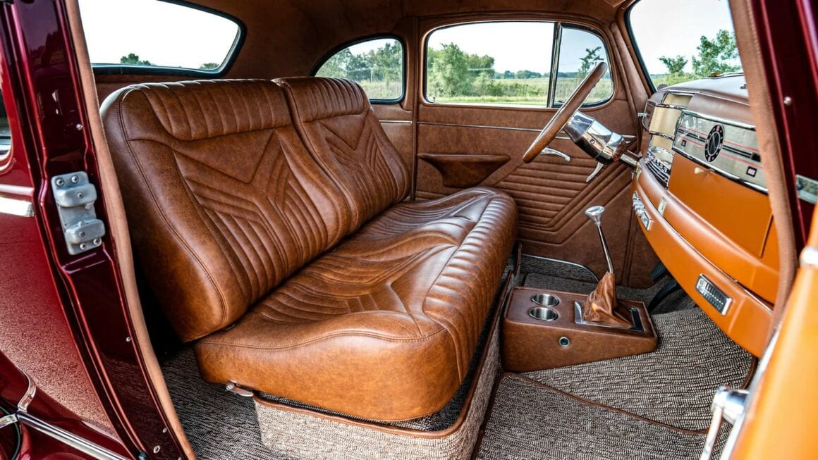 Ce fut une fabrication qui reste difficile à repérer sur la voiture finie. Un pare-feu personnalisé, un plancher, des ailes intérieures et des mini-baignoires uniques ont tous dû être terminés avant que la peinture marron puisse être posée. Un temps considérable a également été consacré à l’installation à la main de tous les chromes et travaux brillants d’origine sur la voiture. L’objectif était de conserver l’ambiance vintage de l’intérieur de l’Hudson tout en mettant à jour toute l’électronique et en lui donnant le confort moderne auquel nous sommes tous habitués de nos jours. Une colonne d’inclinaison “Flaming River” maintient l’Hudson pointée dans la bonne direction, tandis qu’un système “Vintage Air Gen IV” maintient tout le monde à la température parfaite. Le tableau de bord a été entièrement retravaillé mais a toujours l’air d’appartenir à 1947. Du cuir personnalisé recouvre les sièges et le tableau de bord.