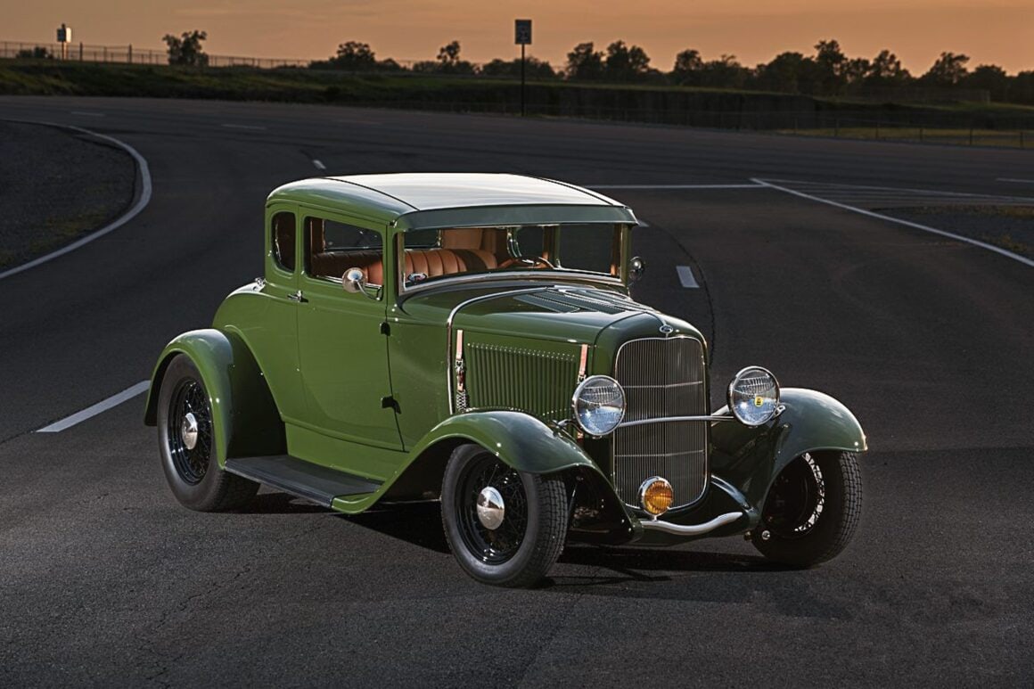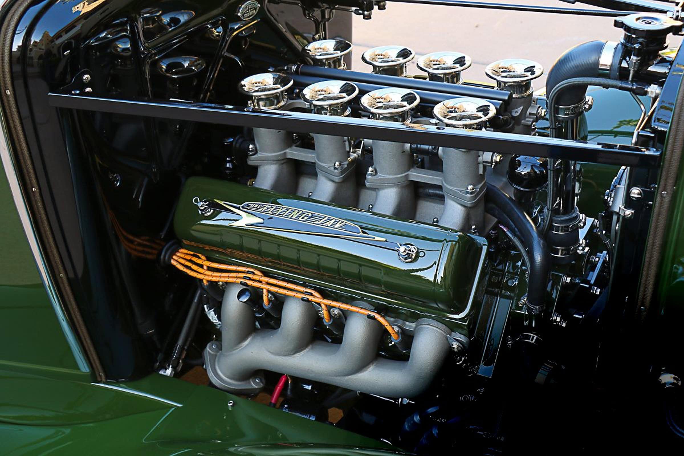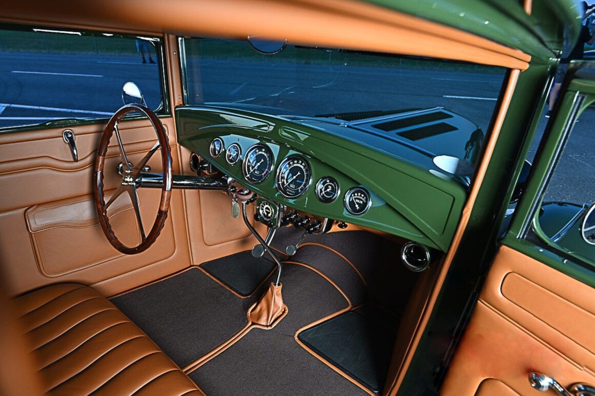 Un quadribras triangulé qui suspend l’arrière de style Banjo, et roule sur des jantes à rayons Wheelsmith de 15 et 16po chaussées de pneus Coker Excelsior, ont été montés tout autour. La puissance moderne se présente sous la forme d’un moteur LS3 et d’une transmission 4L65E, mais ils ont reçu un style vintage grâce à un système d’injection de carburant Borla 8-Stack, des couvercles de soupape Thunderbird avec des emblèmes personnalisés, des collecteurs d’échappement moulés et des détails bien pensés. La carrosserie du modèle A a été traitée avec un toit haché, qui a également été étiré pour accepter des portes de berline affleurantes. Le coupé a également été “mis à jour” avec une calandre, des ailes et des marchepieds Deuce.