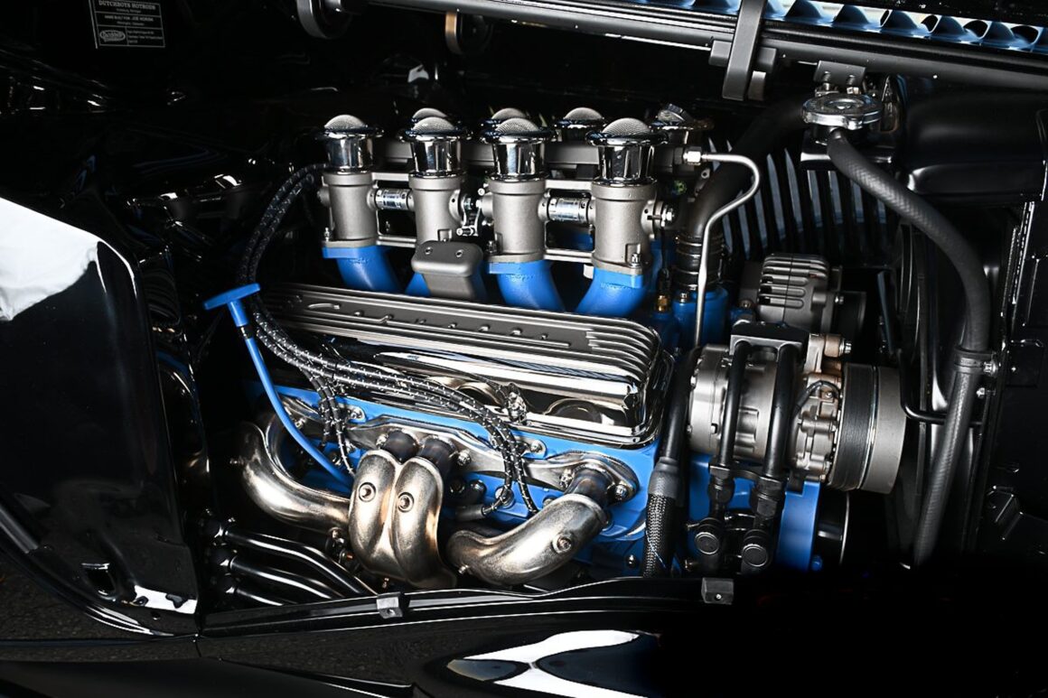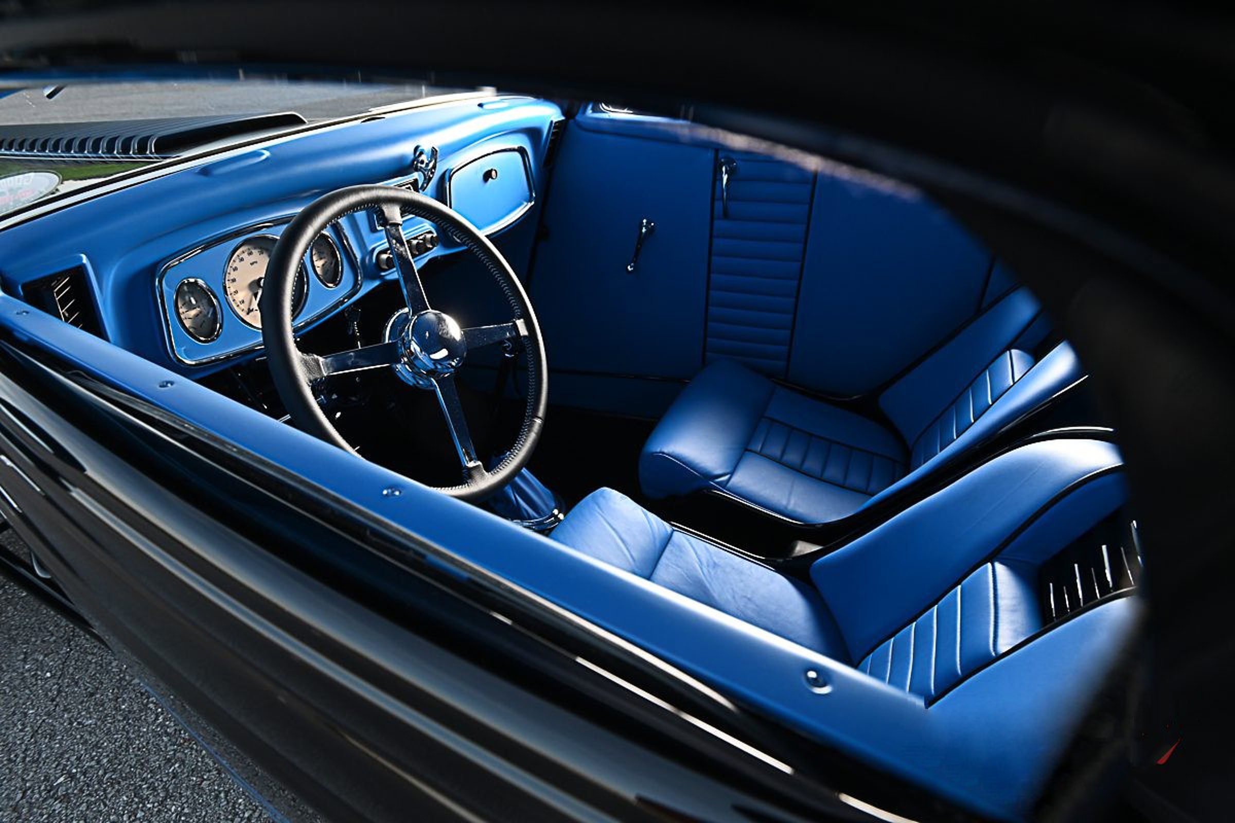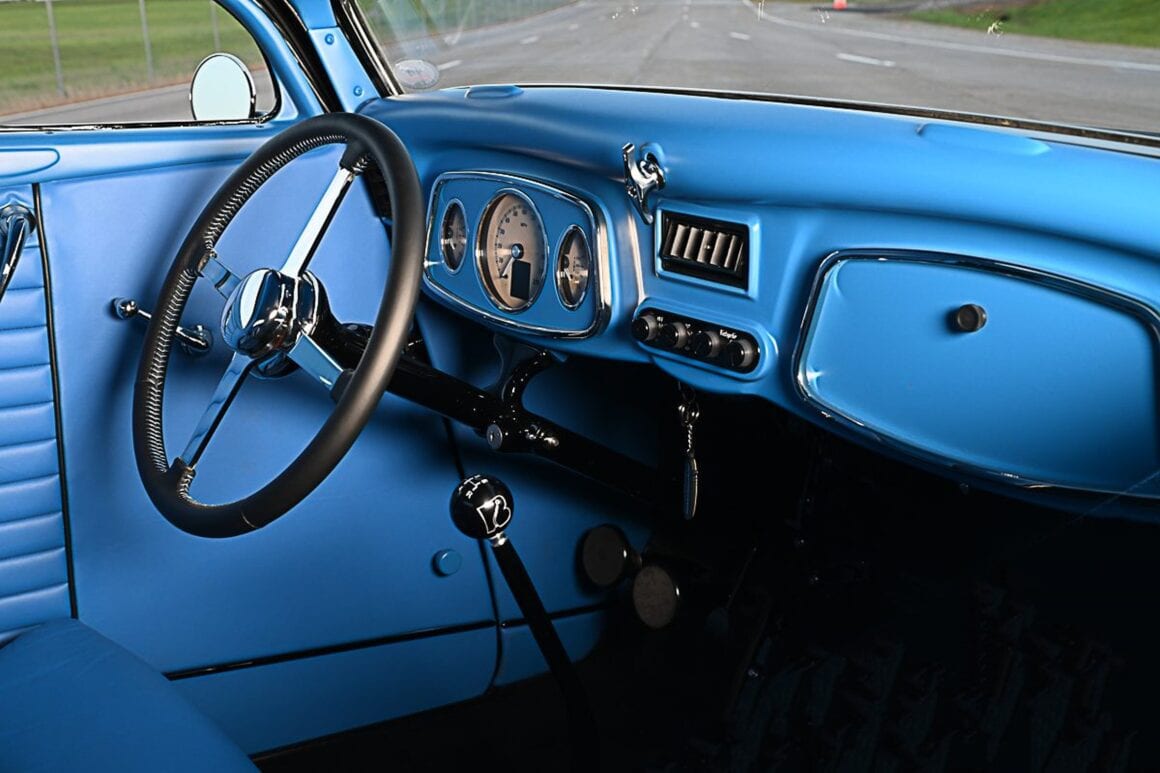 La transmission dispose de cinq vitesses Tremec TKX de Bowler, le tout connecté à un V8 383c.i. stroker small Chevy retravaillé chez Blueprint Engines à 400 chevaux, traité avec une finition “LeMans Blue dynamique”, et de nombreux éléments ARP polis avec un système d’admission Borla… Ouvrez l’une des portes suicide et vous êtes accueilli par un intérieur en cuir bleu assorti fabriqué en interne chez Dutchboys. En dessous de ces affûts colorés se trouvent des panneaux en aluminium personnalisés et des sièges baquets Speedway Motors modifiés. Le tableau de bord est équipé d’un système Vintage Air et de compteurs de style Dakota Digital ’34 vues à travers un volant Speedway.