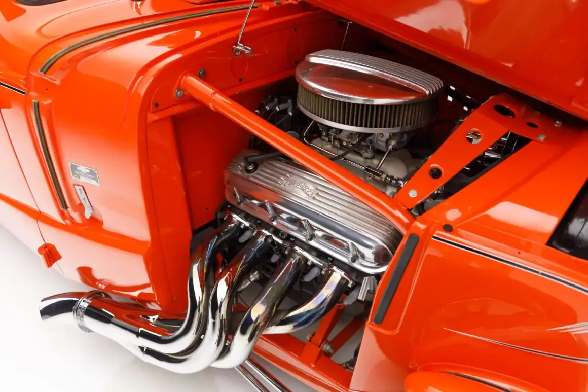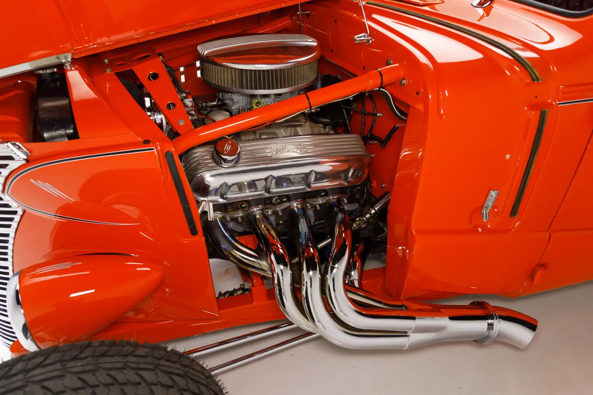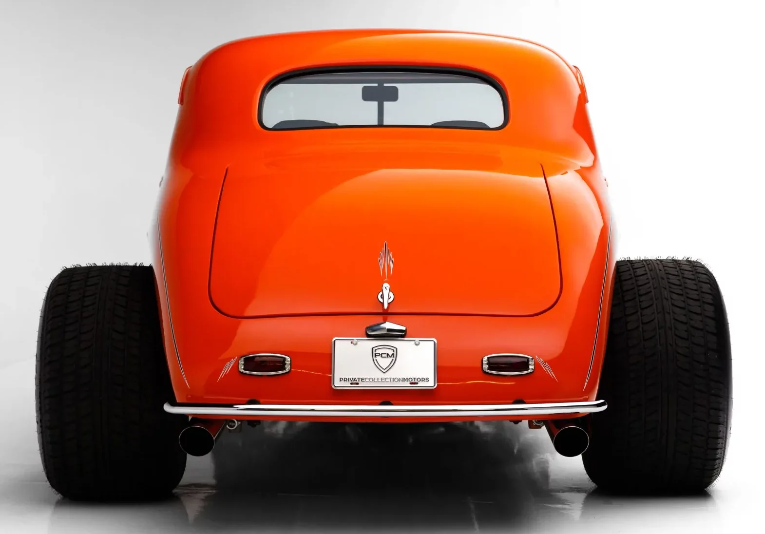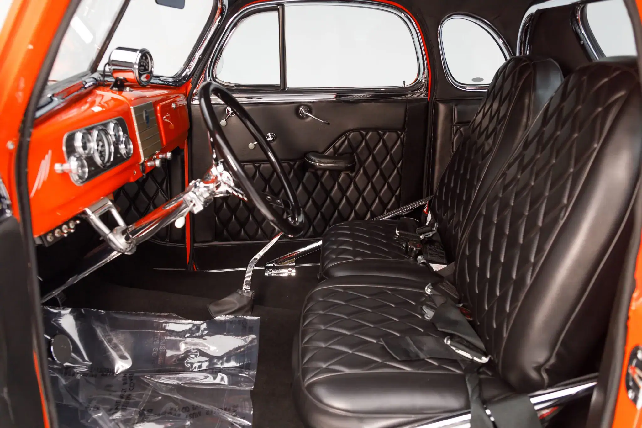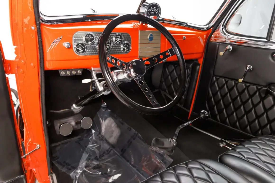 Un pont/différentiel Ford 9 po et des combinés filetés arrière réglables. L’intérieur de la merveille est recouvert de vinyle noir cousu façon diamant et intègre des sièges baquets, un arceau de sécurité, un levier de vitesses Hurst et l’instrumentation Stewart-Warner. Acquis en novembre 2023, ce Hot Rod Chevrolet est désormais Californien. La carrosserie de ce Coupé à cinq fenêtres sans ailes est dotée d’un capot divisé et d’une finition orange. Les détails extérieurs comprennent des feux arrière Stimsonite, une nerf-bar de dragster, des marchepieds latéraux, des vitres teintées et un ornement de capot Speedline Bird.