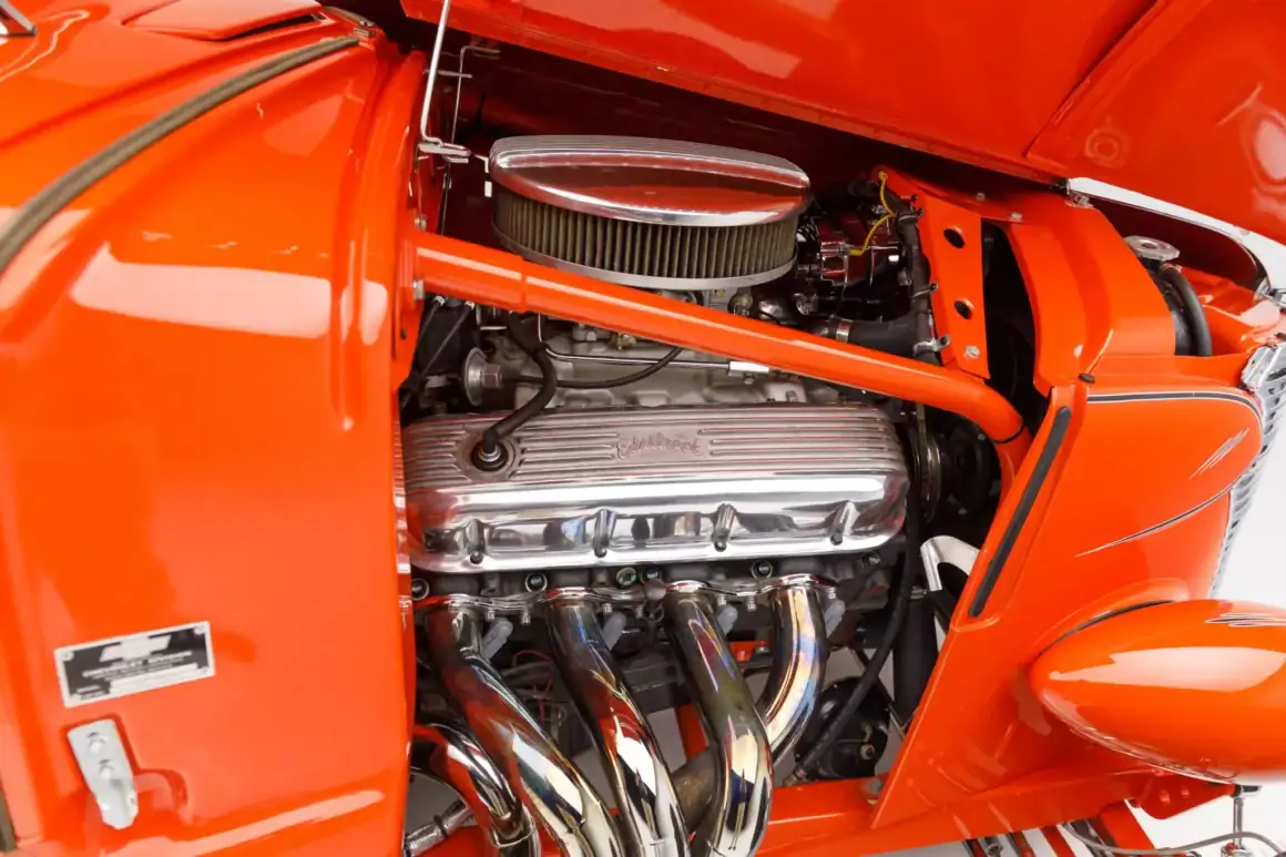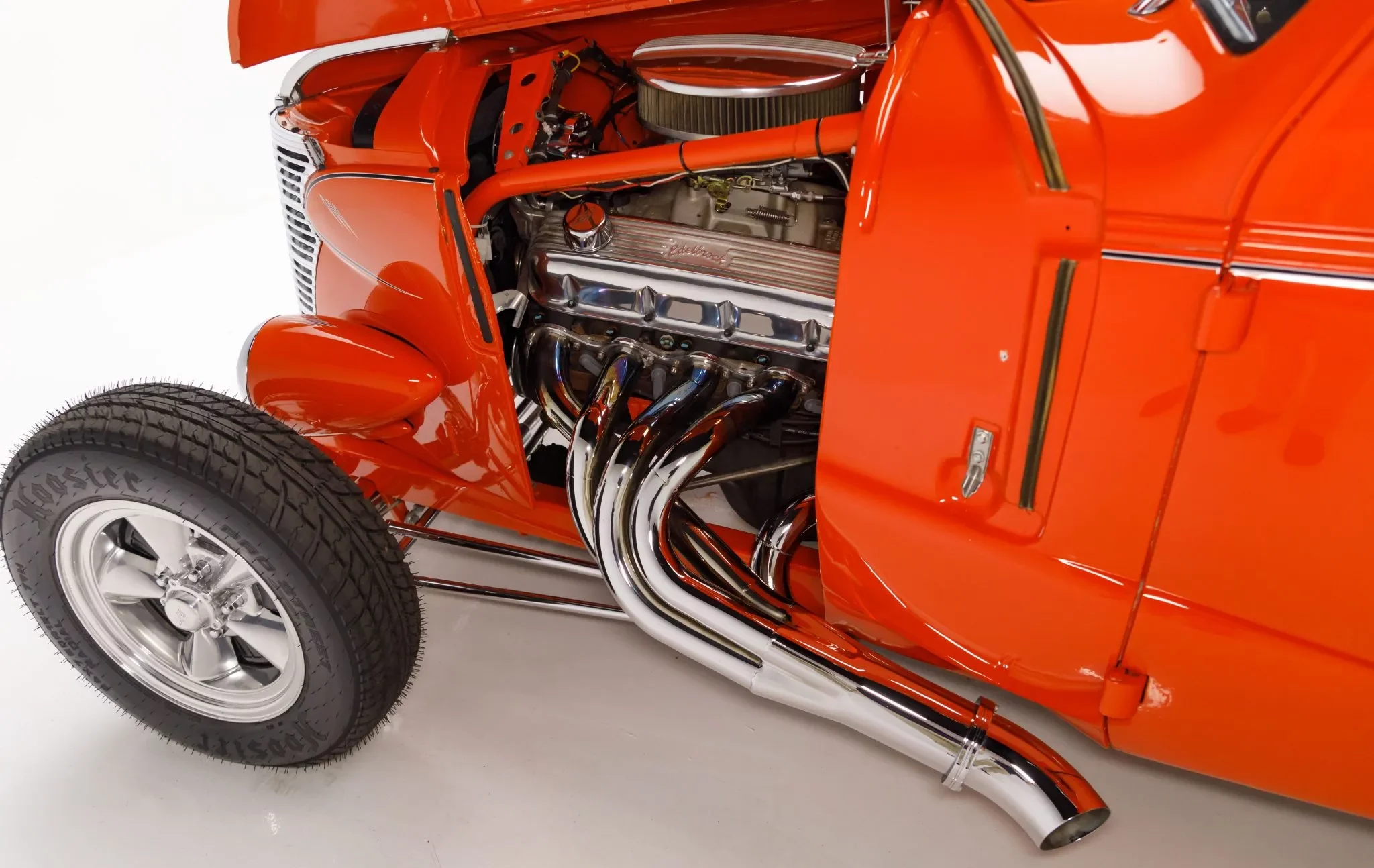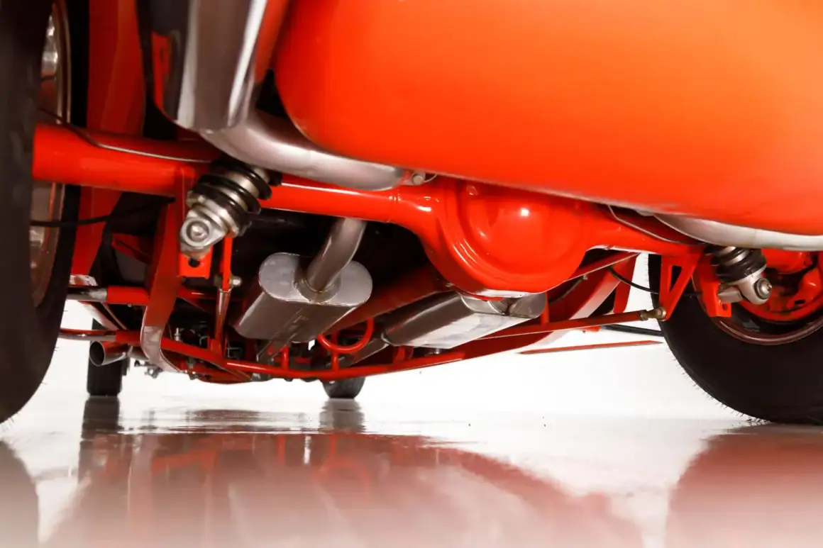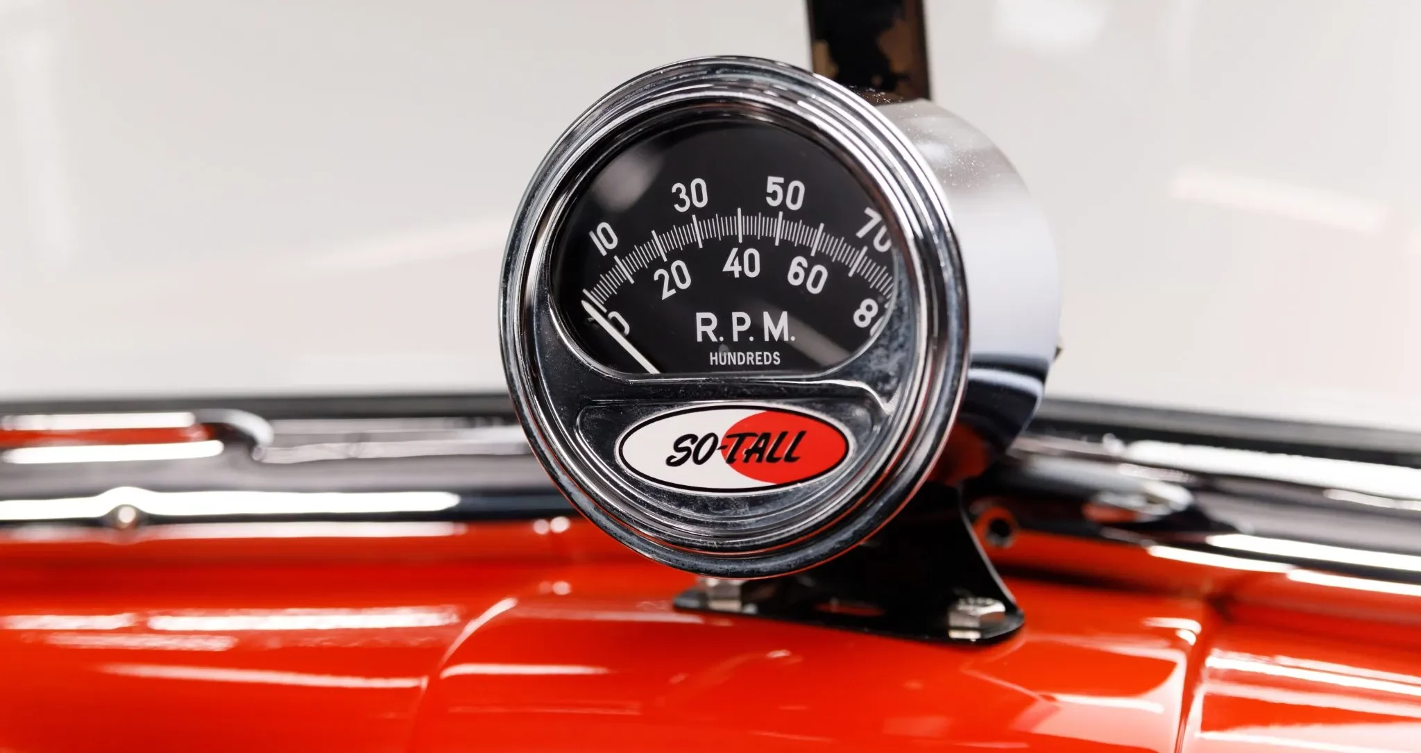 Un pont/différentiel Ford 9 po et des combinés filetés arrière réglables. L’intérieur de la merveille est recouvert de vinyle noir cousu façon diamant et intègre des sièges baquets, un arceau de sécurité, un levier de vitesses Hurst et l’instrumentation Stewart-Warner. Acquis en novembre 2023, ce Hot Rod Chevrolet est désormais Californien. La carrosserie de ce Coupé à cinq fenêtres sans ailes est dotée d’un capot divisé et d’une finition orange. Les détails extérieurs comprennent des feux arrière Stimsonite, une nerf-bar de dragster, des marchepieds latéraux, des vitres teintées et un ornement de capot Speedline Bird.