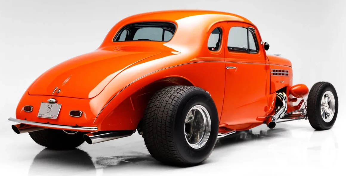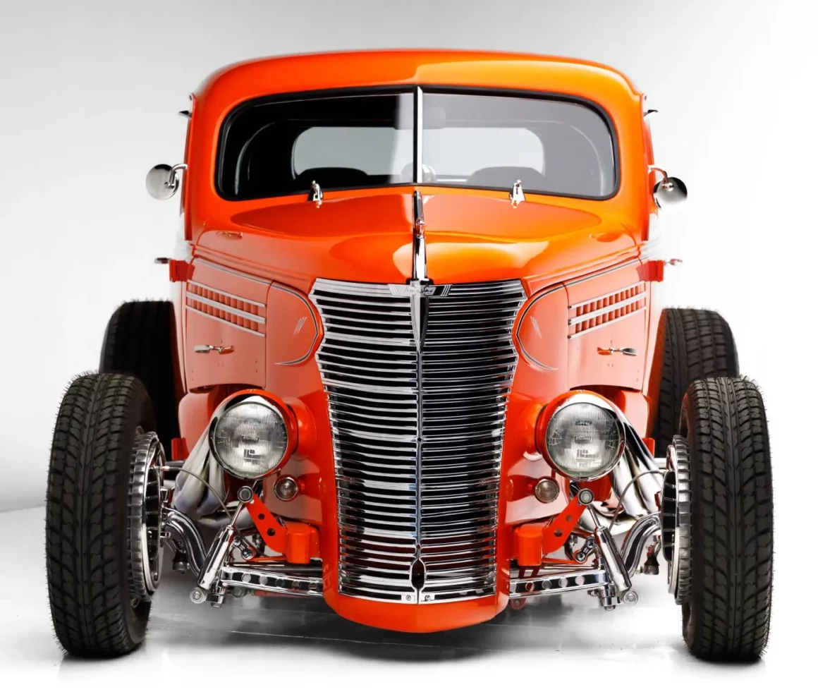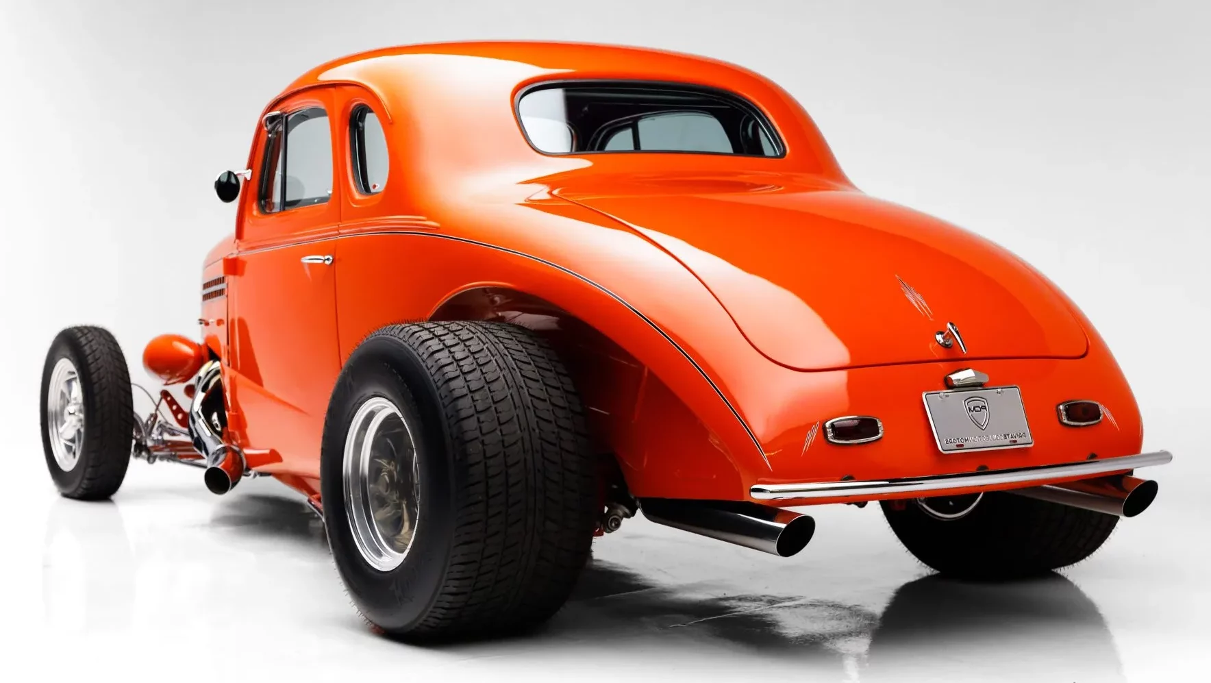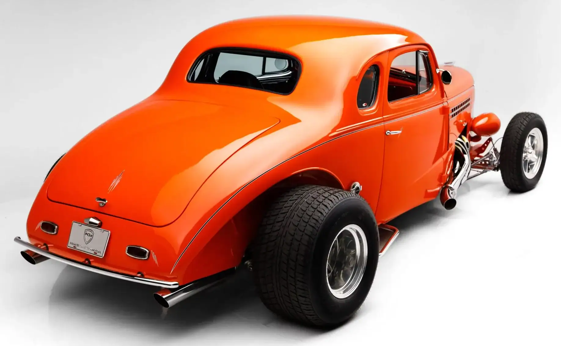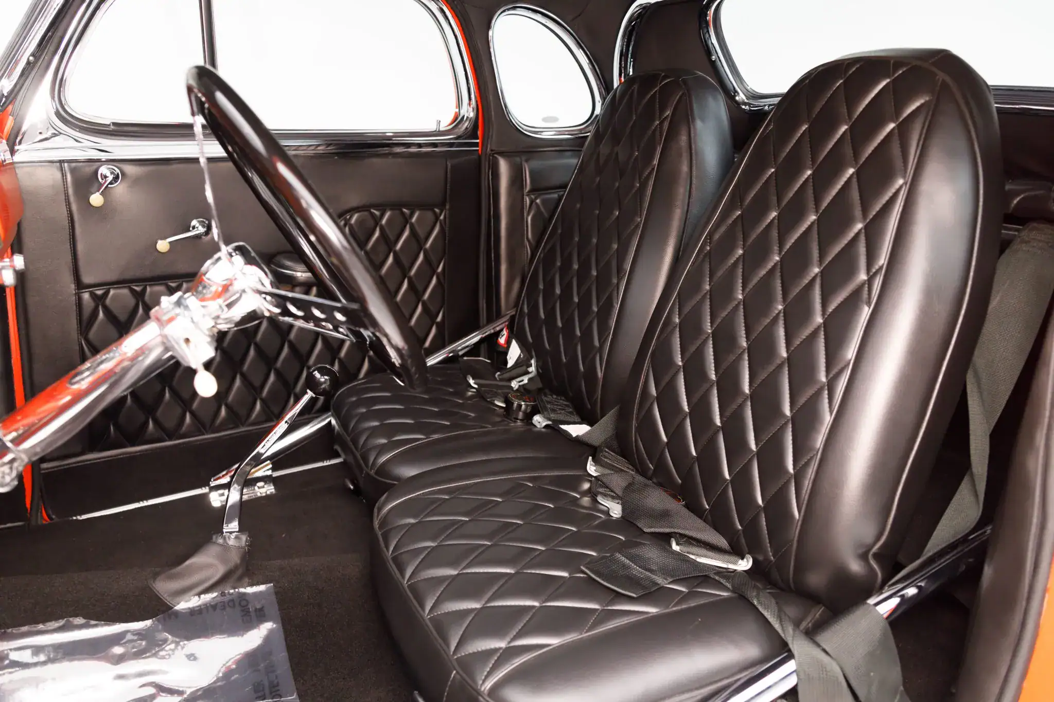Un pont/différentiel Ford 9 po et des combinés filetés arrière réglables. L’intérieur de la merveille est recouvert de vinyle noir cousu façon diamant et intègre des sièges baquets, un arceau de sécurité, un levier de vitesses Hurst et l’instrumentation Stewart-Warner. Acquis en novembre 2023, ce Hot Rod Chevrolet est désormais Californien. La carrosserie de ce Coupé à cinq fenêtres sans ailes est dotée d’un capot divisé et d’une finition orange. Les détails extérieurs comprennent des feux arrière Stimsonite, une nerf-bar de dragster, des marchepieds latéraux, des vitres teintées et un ornement de capot Speedline Bird.