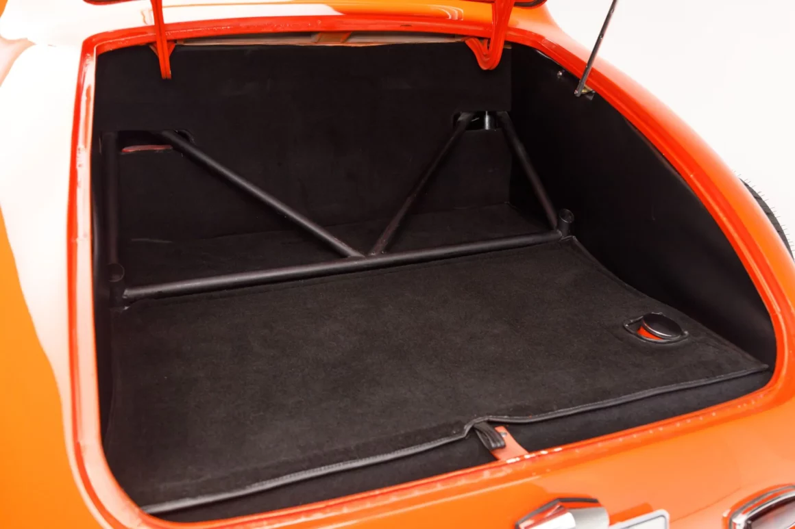 Ne pas oublier les lectures de tension, de pression d’huile, de température et de niveau de carburant. Le compteur kilométrique mécanique à six chiffres indique 2.800 miles. Le capot à charnières latérales s’ouvre pour révéler un V8 de 454ci alimenté par un carburateur Holley monté sur un collecteur d’admission Edelbrock et doté de composants d’allumage MSD, de collecteurs d’échappement tubulaires polis et d’un filtre à air à ailettes et de couvercles de soupapes. Le refroidissement est assuré par un radiateur personnalisé avec des ventilateurs électriques.