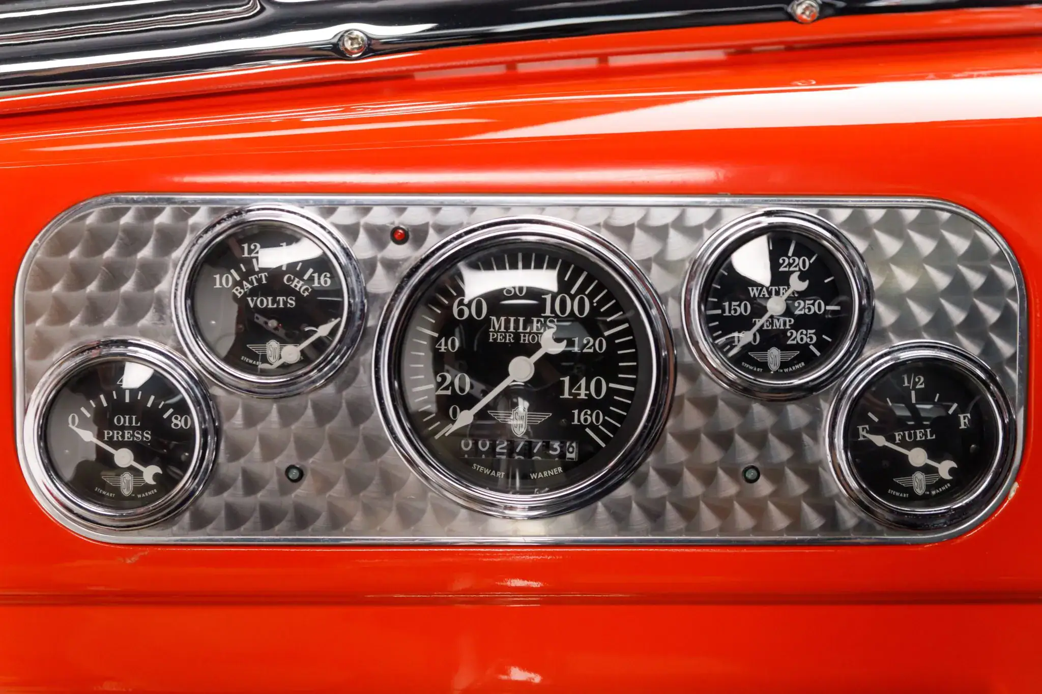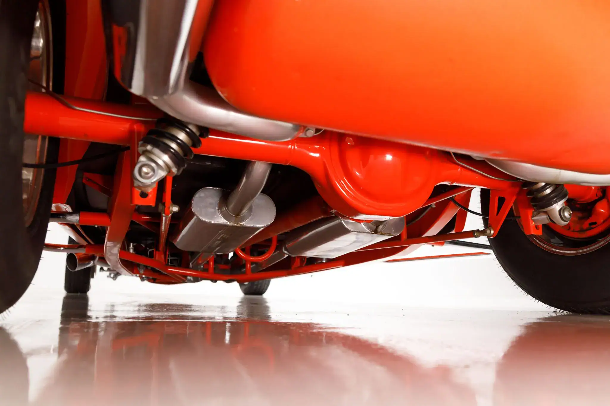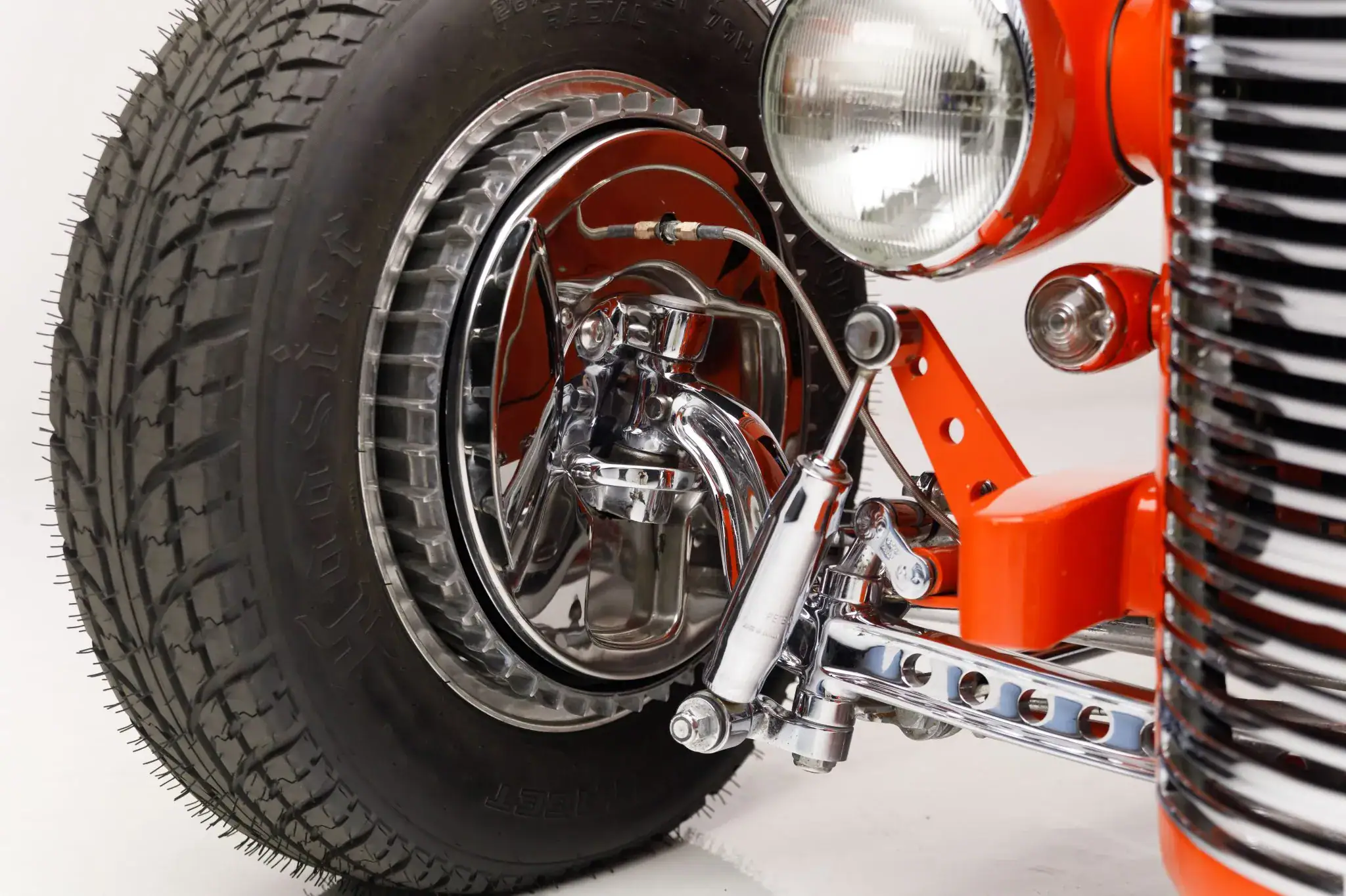 Les jantes E/T Mag 15po sont montées avec des pneus Hoosier Pro Street 26×7.50AV et 31×16.50AR L’essieu avant abaissé a été percé et dispose d’un ressort à lames transversal, tandis que la suspension arrière a été équipée de combinés réglables. La batterie est montée derrière le siège passager et les détails intérieurs supplémentaires comprennent un levier de vitesses Hurst, des harnais de RJS Racing Equipment, une prise de charge de 12 volts et un arceau de sécurité chromé. Un tachymètre SUN est monté sur le tableau de bord abritant des Stewart-Warner, compteur de vitesse de 160 mph…