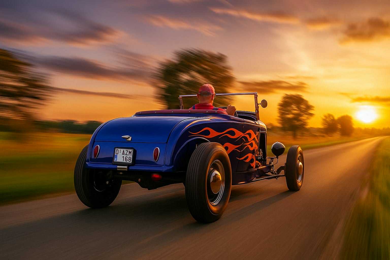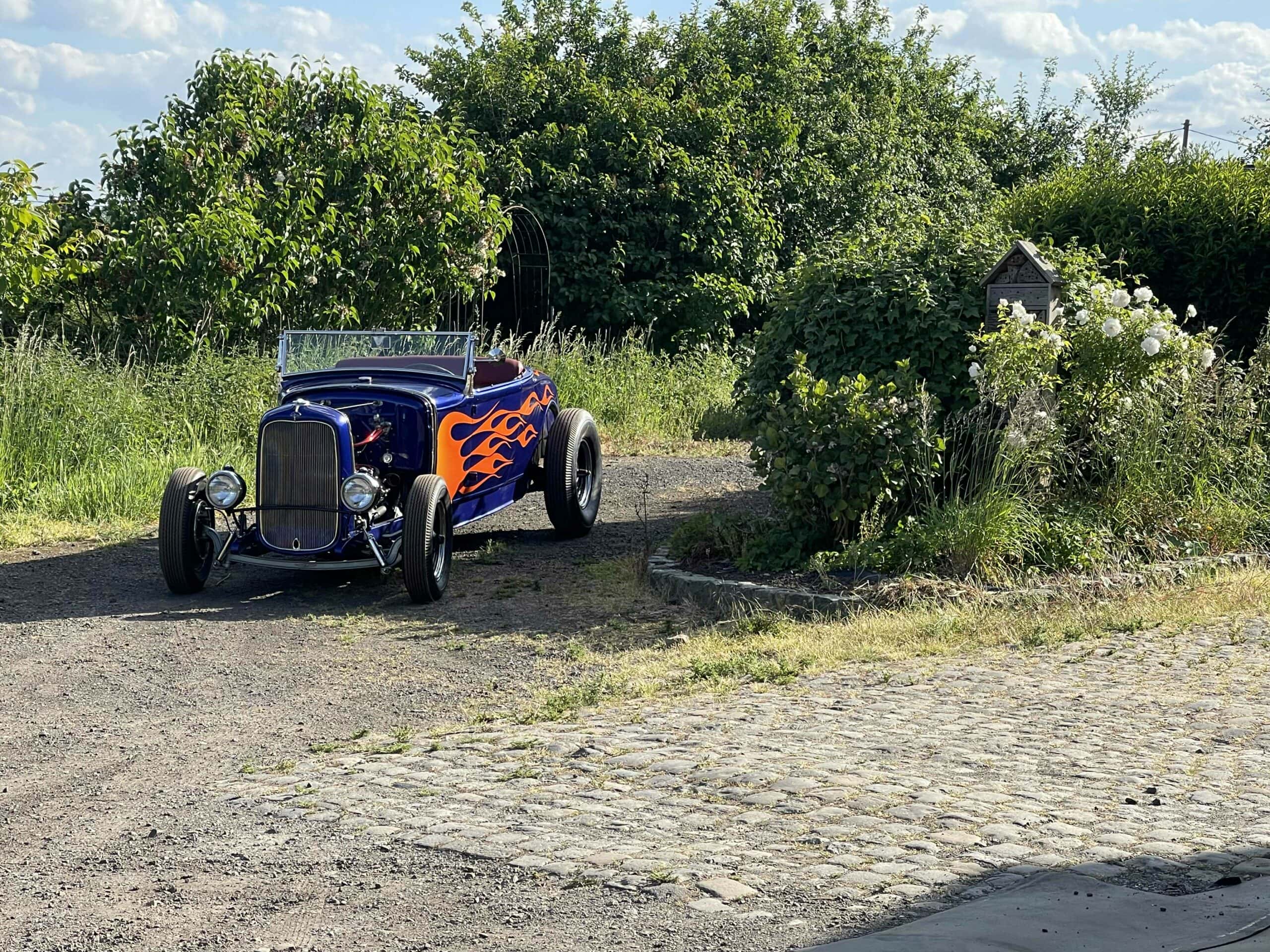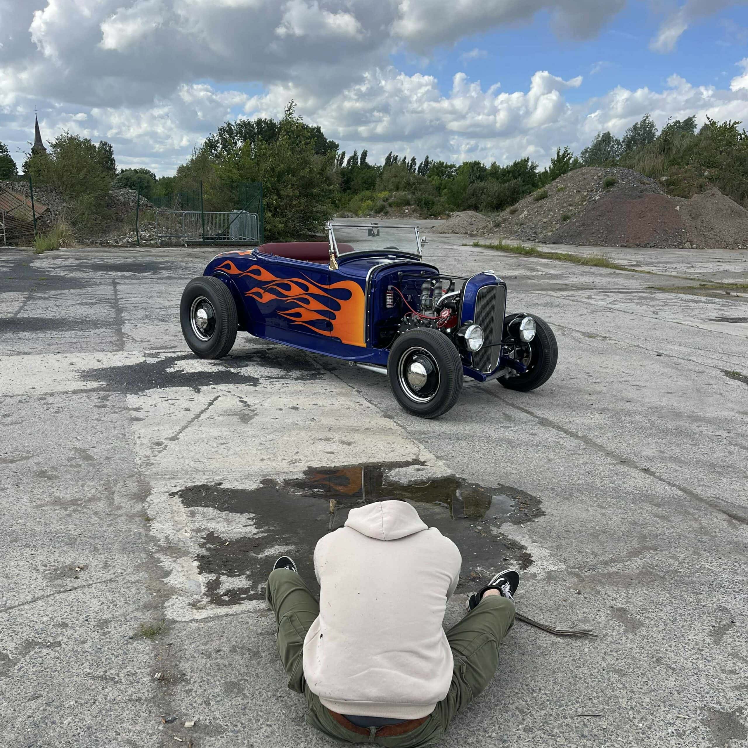 Affalé pour atteindre les pédales tout en étant suffisamment droit pour voir par-dessus le volant, je me fraye à bord de ce Hot Rod découvert par Karim Benalou ami de 50 années de folies, un chemin à travers la campagne, dans la nature sauvage de la Belgitude ou sévit et demeure Karim et sa famille… Le Flathead V8 m’appelle. Deux grands nids-de-poule apparus soudain ne bloquent pas ma chevauchée vers le monde libre, et, compte tenu de mes défis verticaux, de la garde au sol négligeable de la voiture, de son manque de capot, l’instinct et l’intuition sont les seuls sens sur lesquels je peux compter.