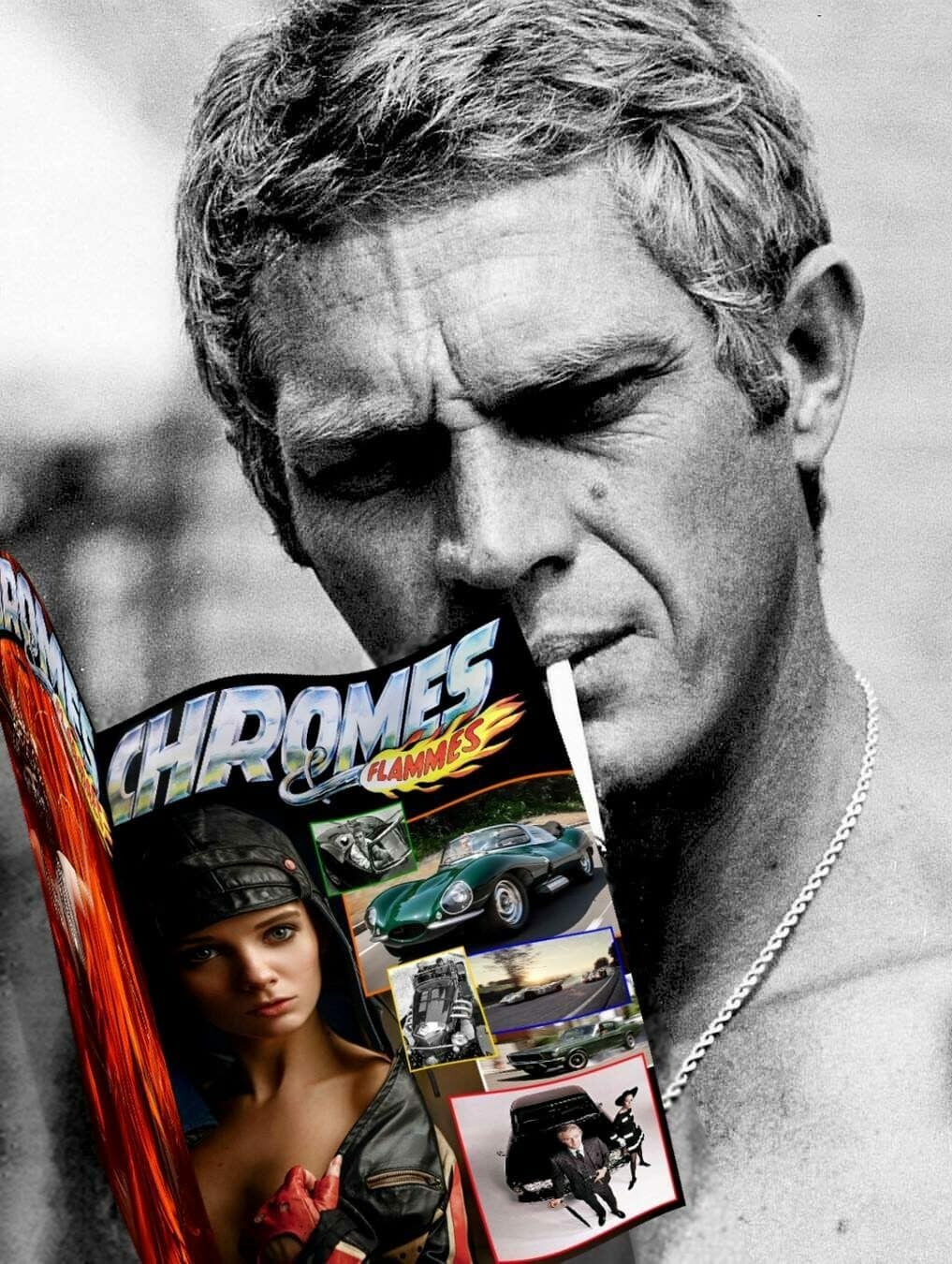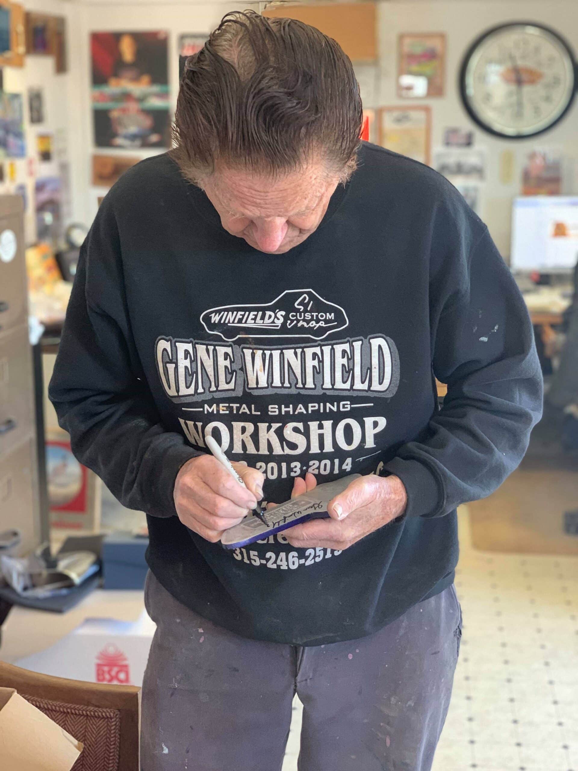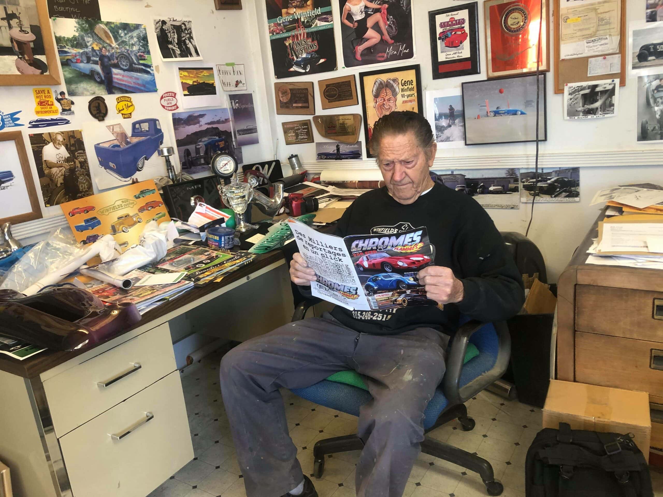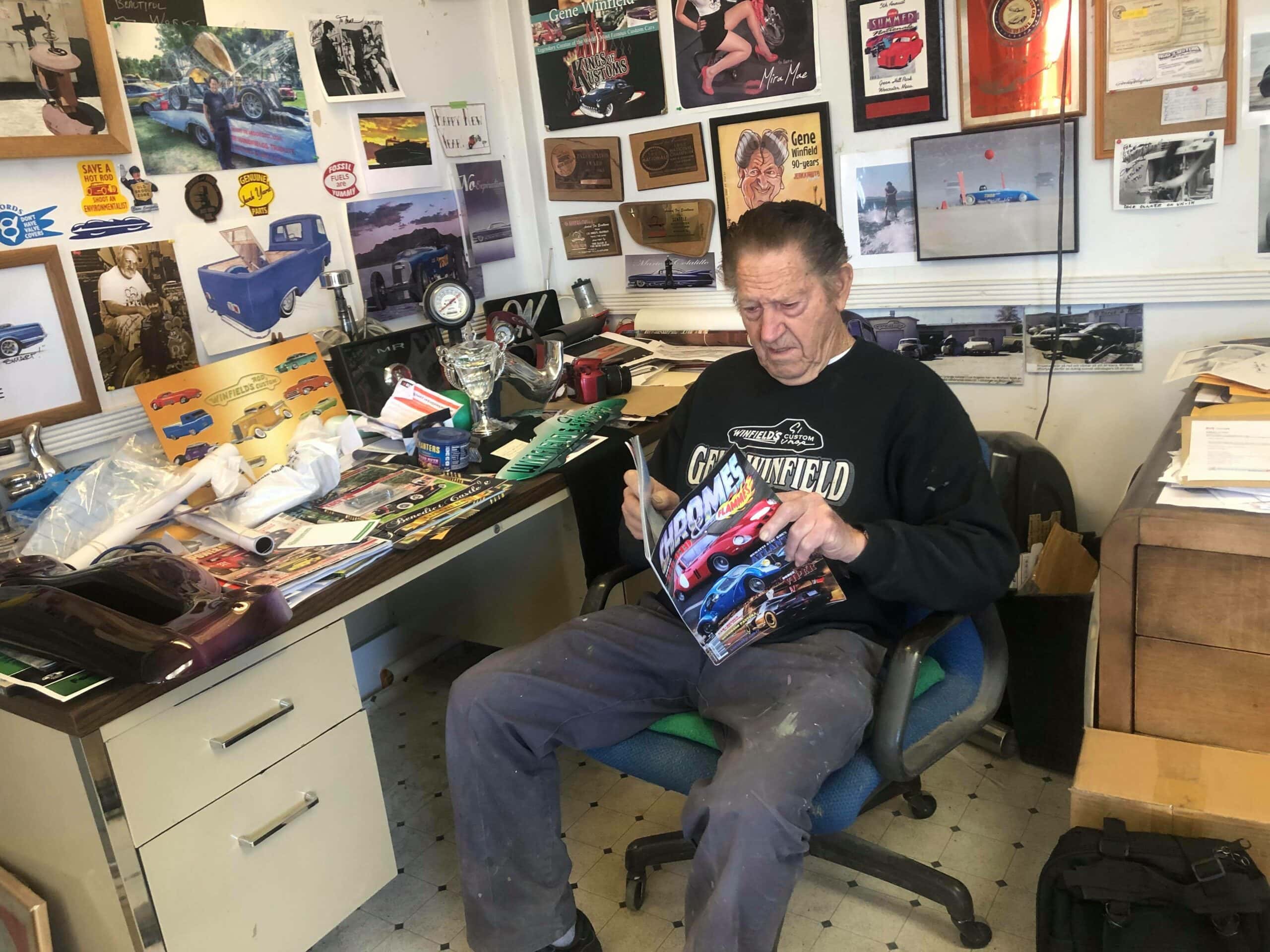 “J’étais aux USA cherchant l’inspiration auprès des plus grands constructeurs de Hot Rod’s, et chez Gene Winfield (qui jusqu’à son décès le 4 mars 2025 était le dernier survivant de la grande époque du Kustom), je me suis retrouvé dans une oasis perdue, balayée par le vent, située au centre d’une zone déglinguée à environ 90 miles au nord d’Hollywood, le long d’un tronçon de l’ancienne Sierra Highway, juste au-delà de la ville poussiéreuse de Rosamond. Je me suis arrêté dans son atelier automobile presque effondré, en stuc battu par le soleil entouré d’une clôture en acier destinée à éloigner les coyotes et lui ai offert un rare magazine ChromesFlammes”.
