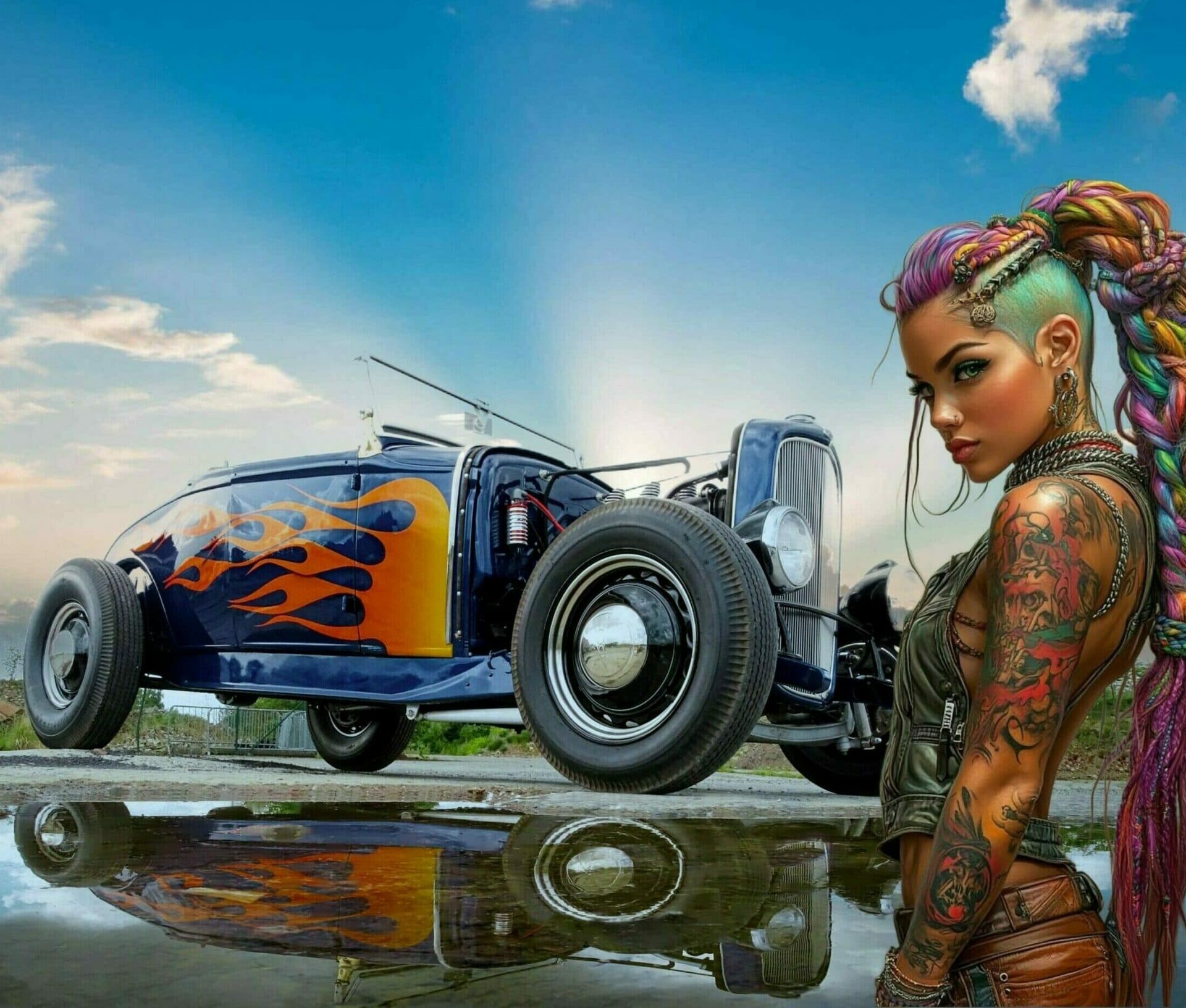 Pas de serpent dans l’herbe, mais des références serpentines partout.. Arrêté à un carrefour, et avec ma main gauche serrée autour du volant, le pied droit en équilibre et les yeux fixés sur la route devant moi, je suis prêt à foncer dans ce Hot Rod. Alors que je suis sur le point de lever l’embrayage et d’appuyer de manière spectaculaire sur la pédale d’accélérateur, ma concentration est brisée. Un éclair de cheveux multicolores traverse à côté de moi. Une Steam-Punk m’implore de la prendre (sic) d’abord comme passagère, plus si affinités… Les bras agités sauvagement dans les airs, elle forme un cœur avec ses mains.