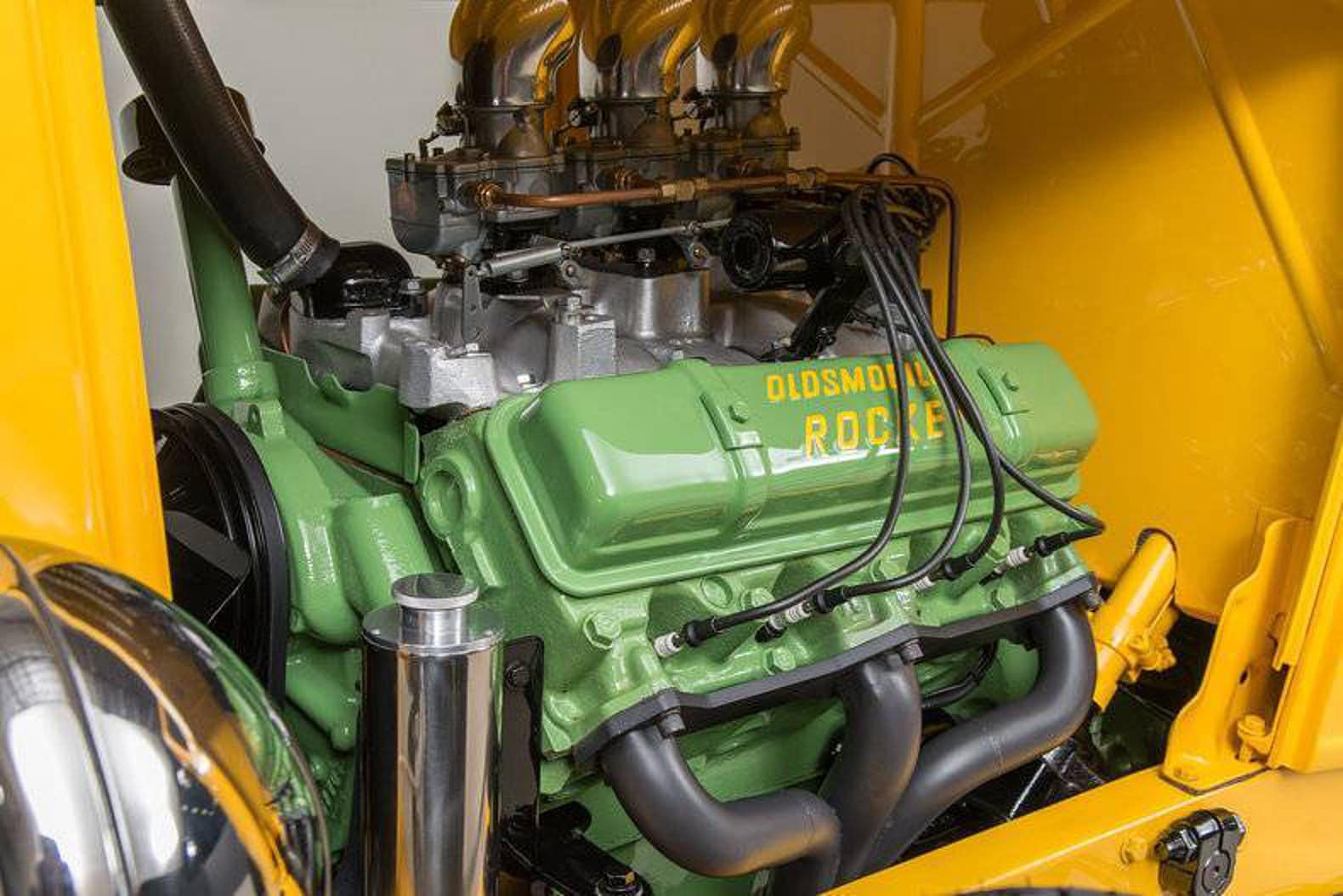 Le siège conducteur est entièrement réglable : quelle que soit la taille, j’y trouve mon bonheur ! Le siège passager s’avance pour permettre de prendre place à l’arrière. Il est rare de trouver une Sedan Ford B’32 aussi spacieuse, et encore plus rare d’en trouver une avec une banquette arrière d’époque. Sous le capot se découvre maintenant un magnifique V8 Olds Rocket 88 de 5,3 litres (324ci), entièrement reconstruit et doté de nombreuses modifications d’époque performantes, notamment : carburateurs Stromberg 97 à triple allumage et collecteur d’admission Weiand en aluminium.