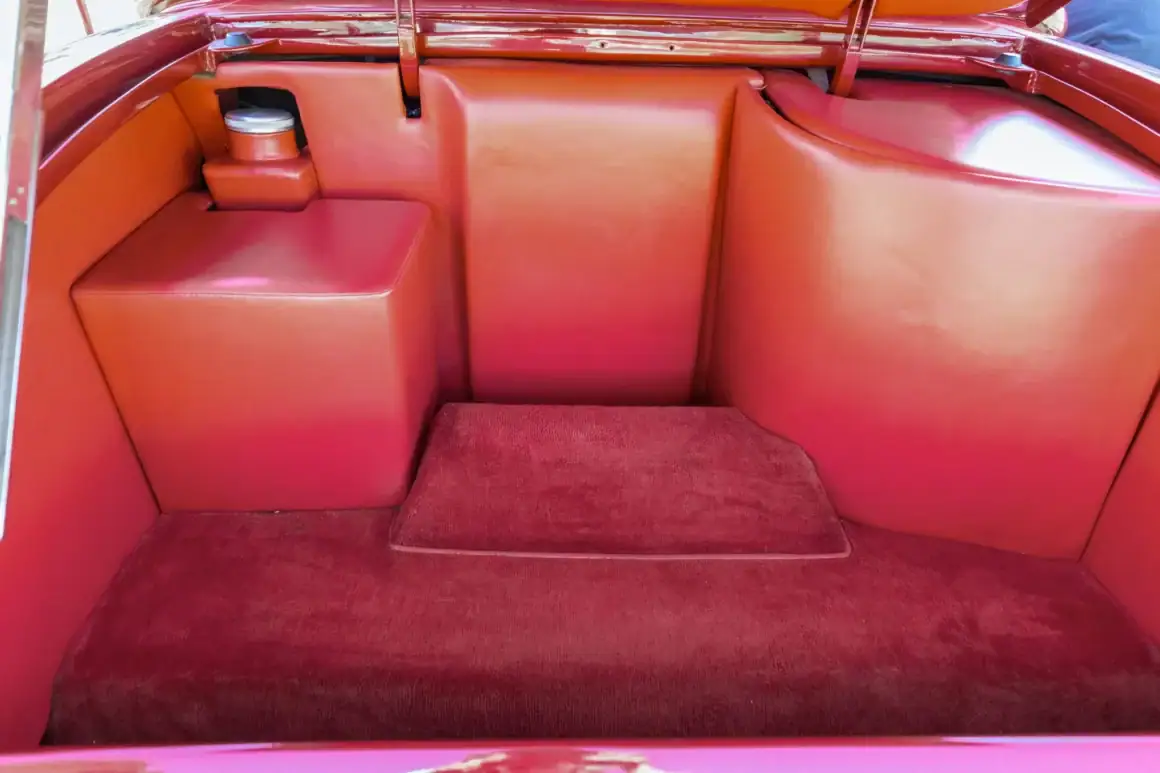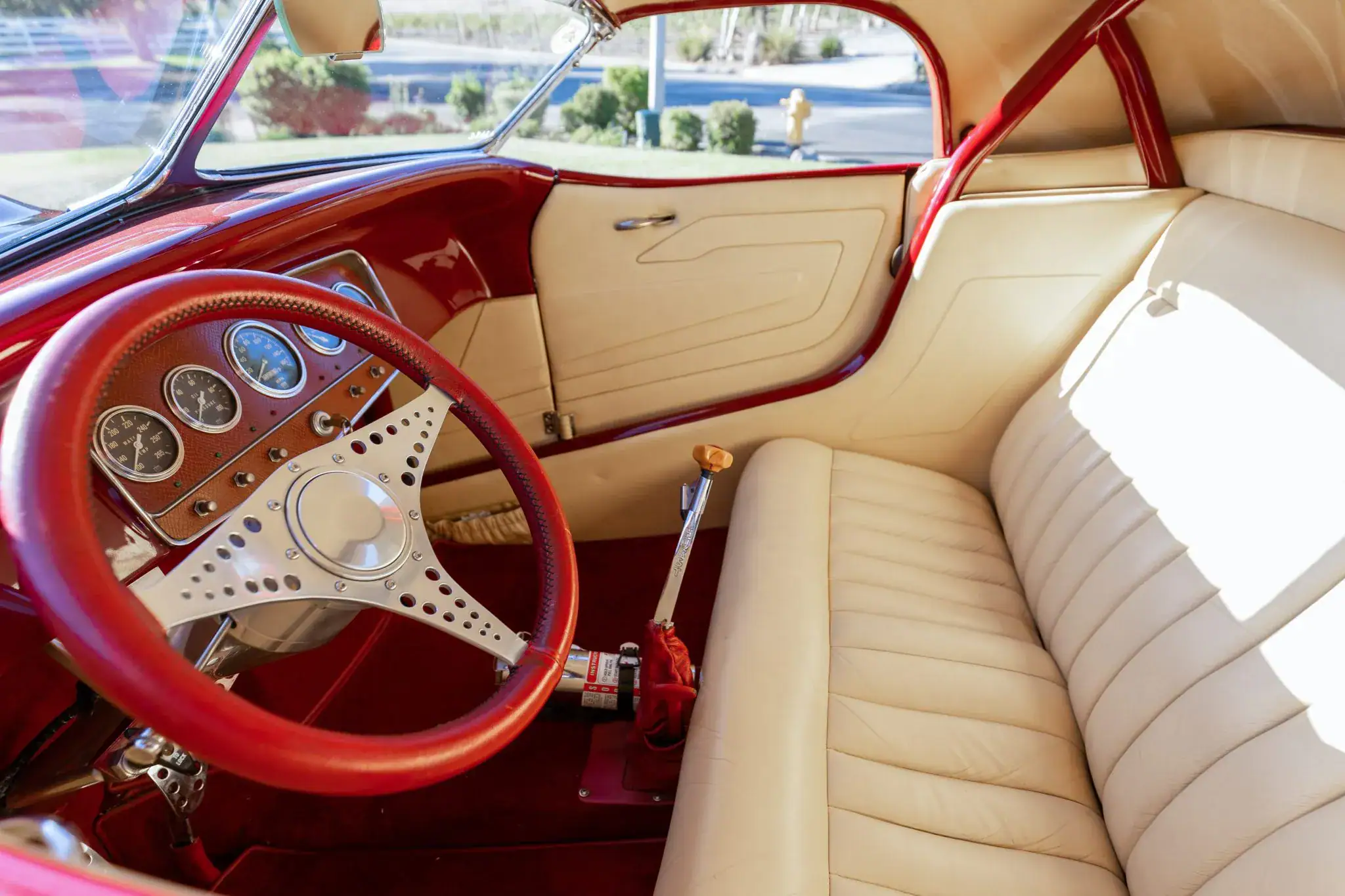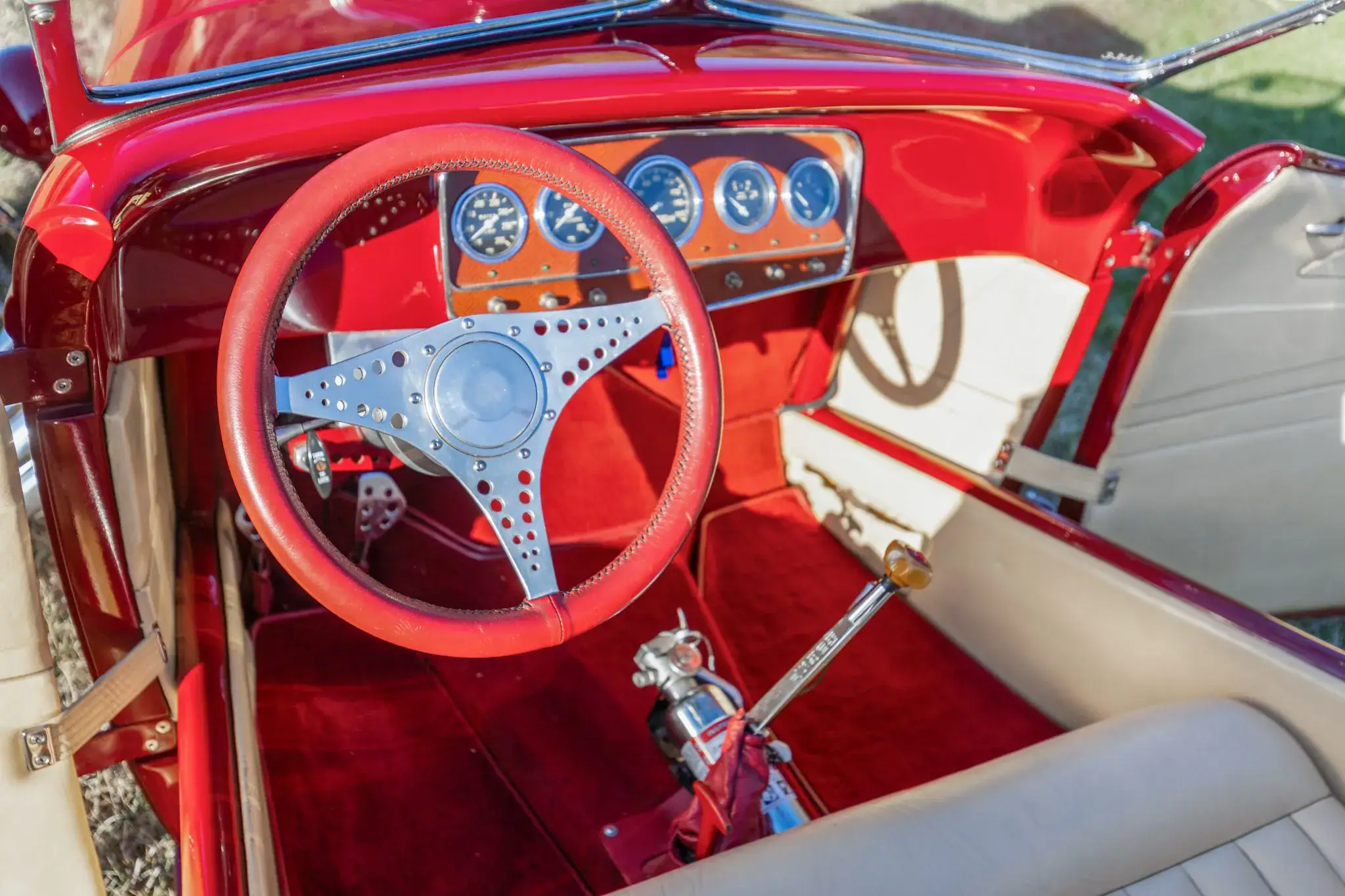 L’intérieur est garni de cuir beige et comprend un arceau de sécurité à six points, un levier de vitesses “Hurst”, des pédales perforées, une colonne de direction en aluminium usiné et un volant trois branches. Au centre du tableau de bord, un panneau d’instruments de type Auburn abrite des instruments “Stewart-Warner”, dont un compteur de vitesse gradué jusqu’à 260 km/h (160 mph) et des indicateurs de pression d’huile, de température du liquide de refroidissement, de tension et de niveau de carburant. Le compteur kilométrique mécanique à cinq chiffres affiche 58.000 km (certifiés réels). Les étiquettes apposées sur le châssis et le montant de la porte indiquent un numéro de série “2684623252”, qui correspond au numéro VIN figurant sur le titre californien décrivant la voiture comme une Ford de 1932… Tout est légal, prêt à l’achat : 100.000 $… Voilà, le compte est bon concernant le conte de Noël… L’affaire est dans le sac (en fait la hotte du pépère) qui contre 100.000 dollars vous livrera la bête devant chez vous (comptez les frais de transport, les taxes et quelques broutilles liées aux documents de 1932 qui risquent de poser problèmes en regard des Lois Européennes… Faites comme moi, 1/3 aux USA et 2/3 à St-Trop’…